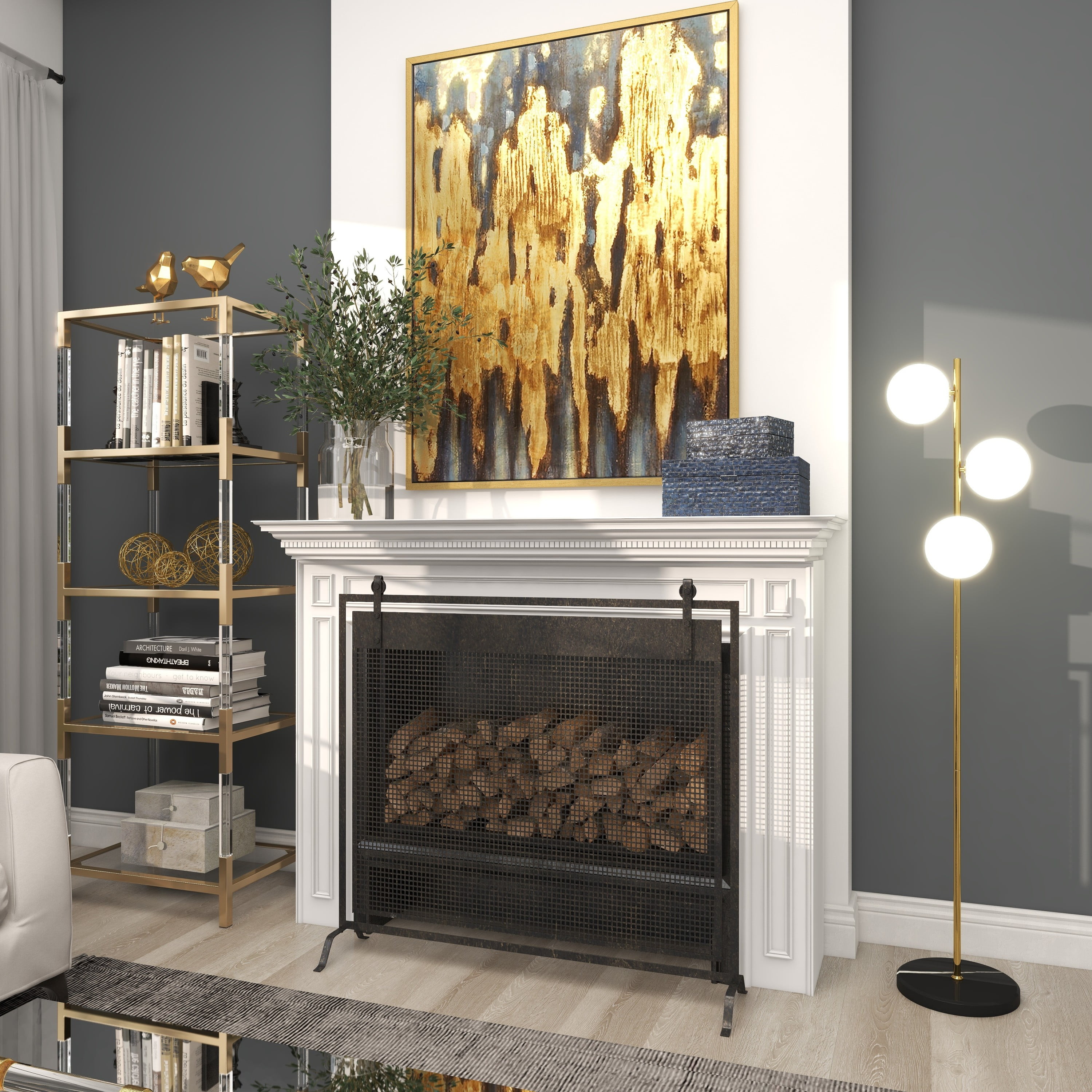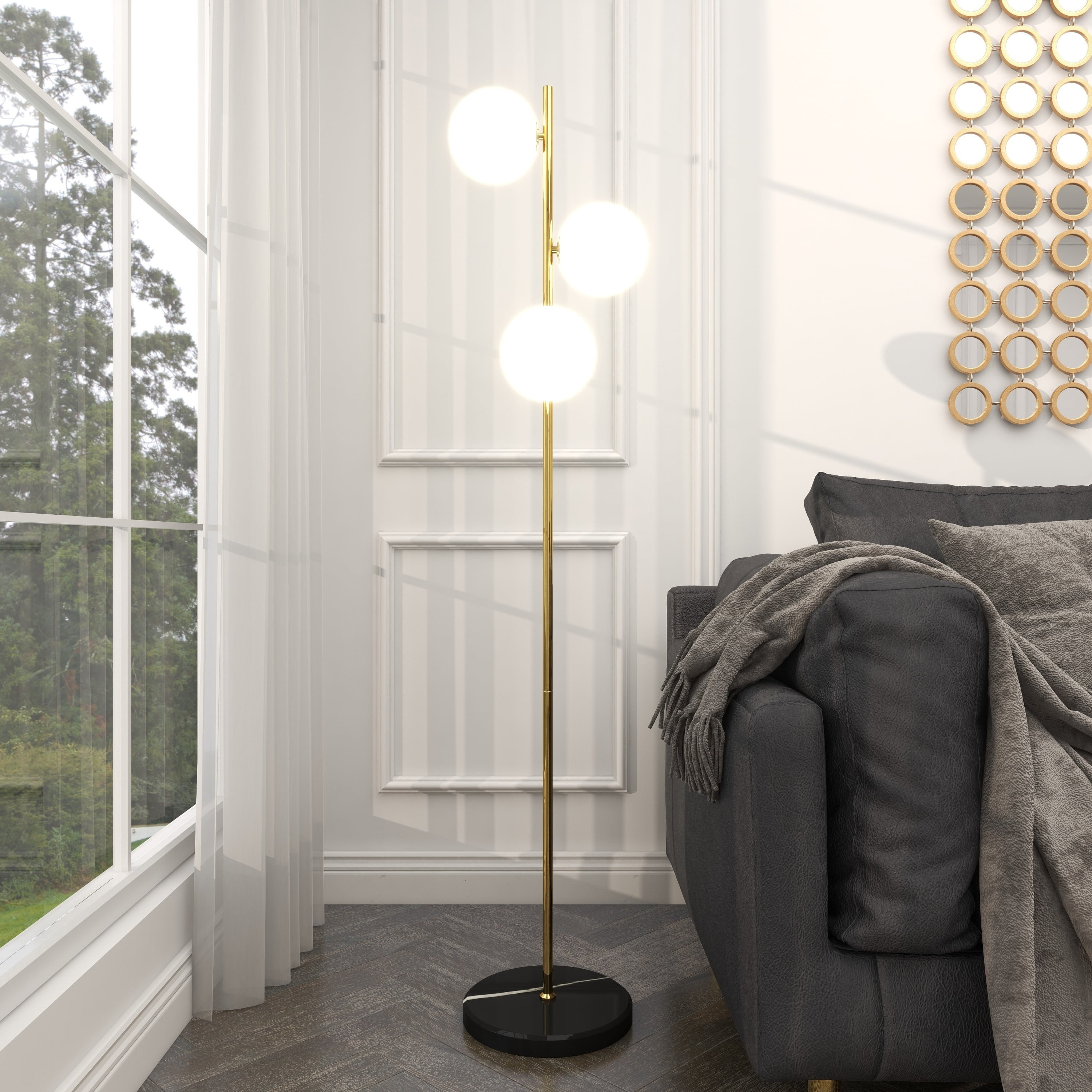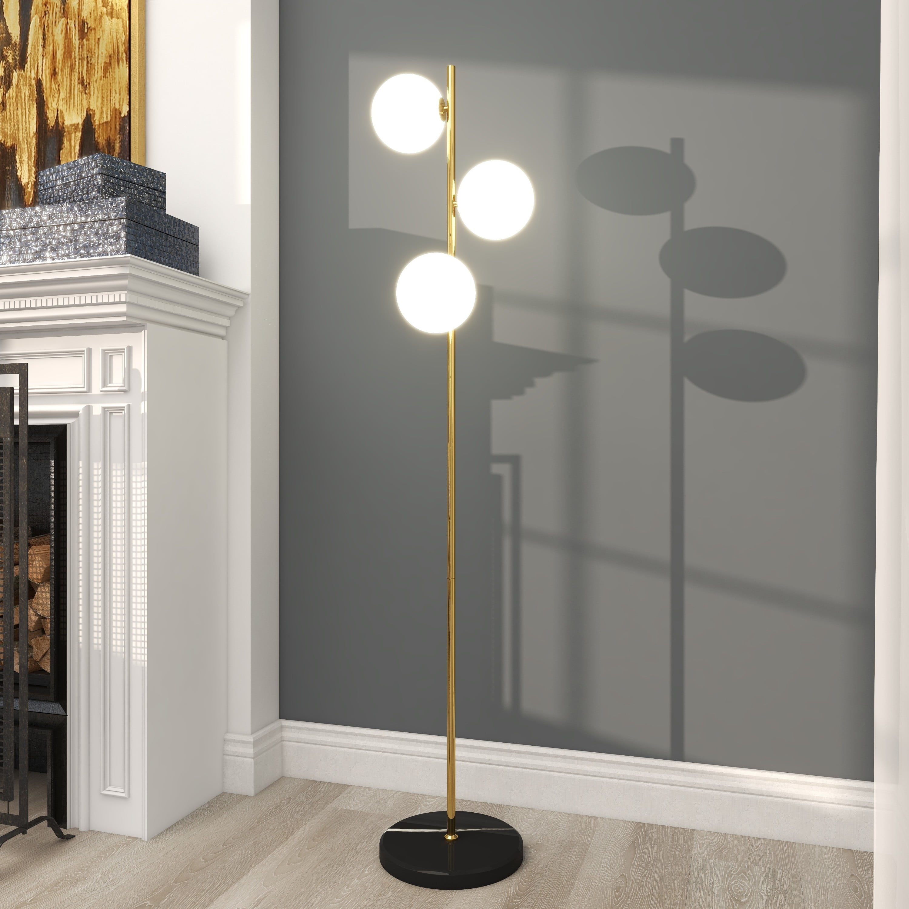 Modern style inspired by a minimalistic design with clean lines and angular structures Tall floor lamp featuring an iron stem with marble base and foot switch Modern floor lamp finished with a polished gold body, black base, and white bulb A tall design with three orbs that diffuse soft light throughout your living space This item measures 11.0L x 11.0W x 55.0H inches, and weighs 11.0 lbs This modern lamp has a slender design, round shaped bulbs with a round flat base Wipe clean with a dry cloth The modern lamp’s tall pole securely attaches to the marble base for stability Modern style CosmoLiving by Cosmopolitan 55″ 3 Light Gold Floor Lamp with White Glass Shade makes a perfect addition to any home