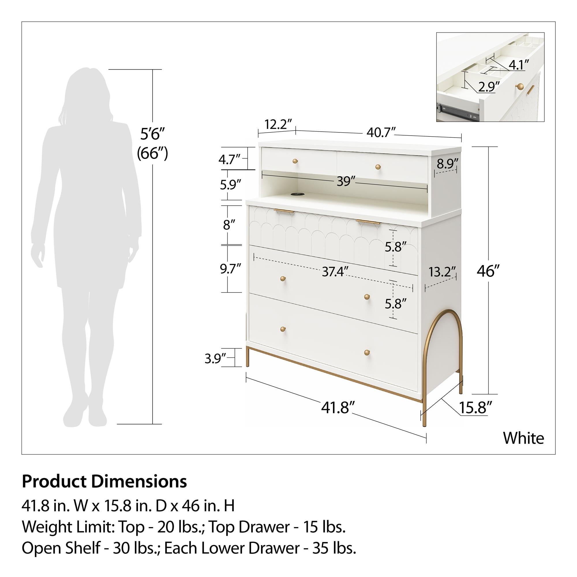 Say hello to the fun and *very* flirty Anastasia Collection from CosmoLiving by Cosmopolitan Featuring creamy white finishes with playful scalloped details accented by brassy gold hardware and curvaceous rounded metal legs Crafted from ultra-durable MDF and powder-coated steel construction The 4 Drawer Dresser with Hutch is the perfect bedroom piece providing divided compartments in the top drawer for jewelry, a wireless charger beneath the hutch and three larger drawers with ample space for organizing your favorite fits The Dresser ships flat in one box and requires two adults to assemble. Assembled measurements: 41.8″ W x 15.8″ D x 46″ H; Jewelry drawer: 39″ W x 8.9″ D x 4.7″H; Lower 3 Drawers: 39″ W x 13.2″ D x 5.83″ H; Hutch: 40.7″ W x 12.2″ D x 11.7″ H Max weight capacities: Hutch top: 20 lbs. Dresser top: 30 lbs. Jewelry drawer: 15 lbs. Lower 3 Drawers: 35 lbs. each; Assembled unit weight: 114.8 lbs. 1-Year Limited Warranty Included