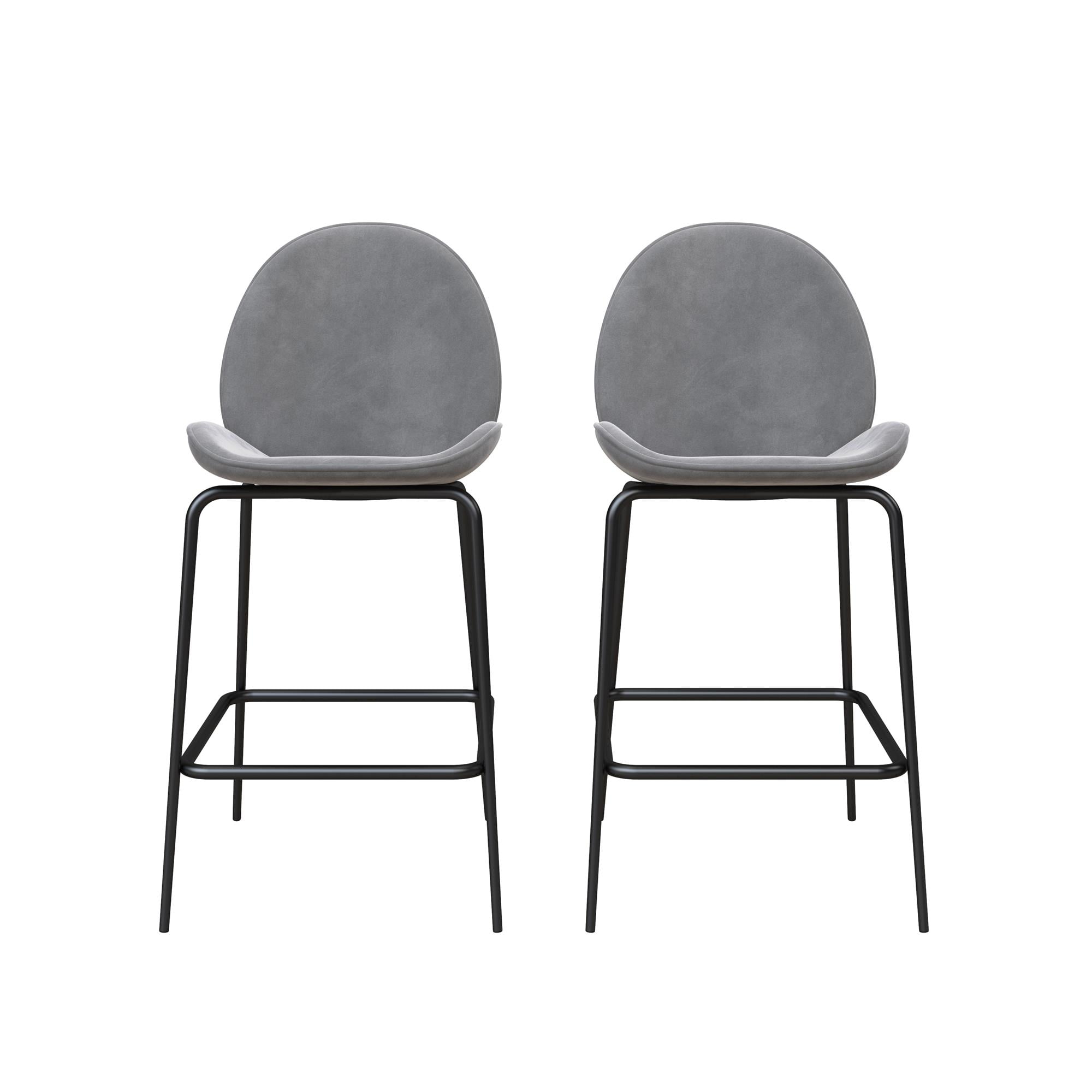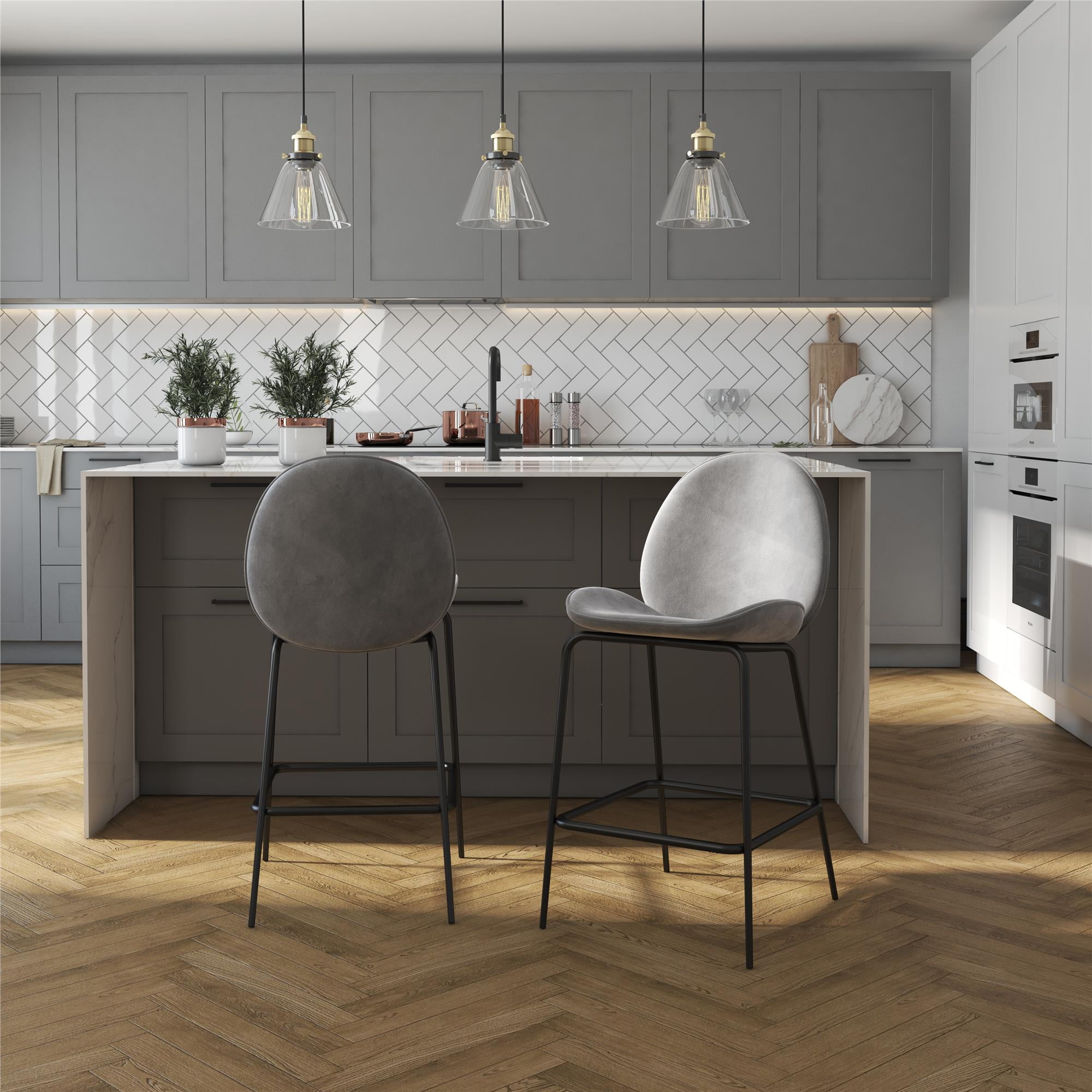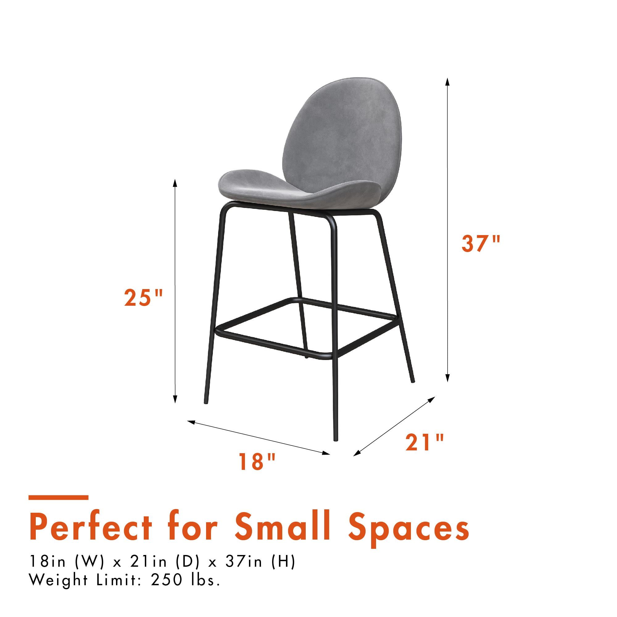 CosmoLiving by Cosmopolitan Astor 24″ Counter Height Bar Stool, Gray Velvet Lavish, classy rounded design. Perfect to obsessorize your kitchen counter or home bar Upholstered in rich-textured velvet with sleek black metal legs that add a touch of glam Seat is made with robust wood and foam pad to ensure comfort Minimal assembly required. Wipes clean with a soft cloth 1-year limited warranty Chair dimensions: 21″L x 18″W x 37″H. Seat height: 25″. Weight limit: 250 lb. Shipping dimensions: 21″L x 19″W x 24″H. Net weight: 17 lb. Gross weight: 23 lb.
