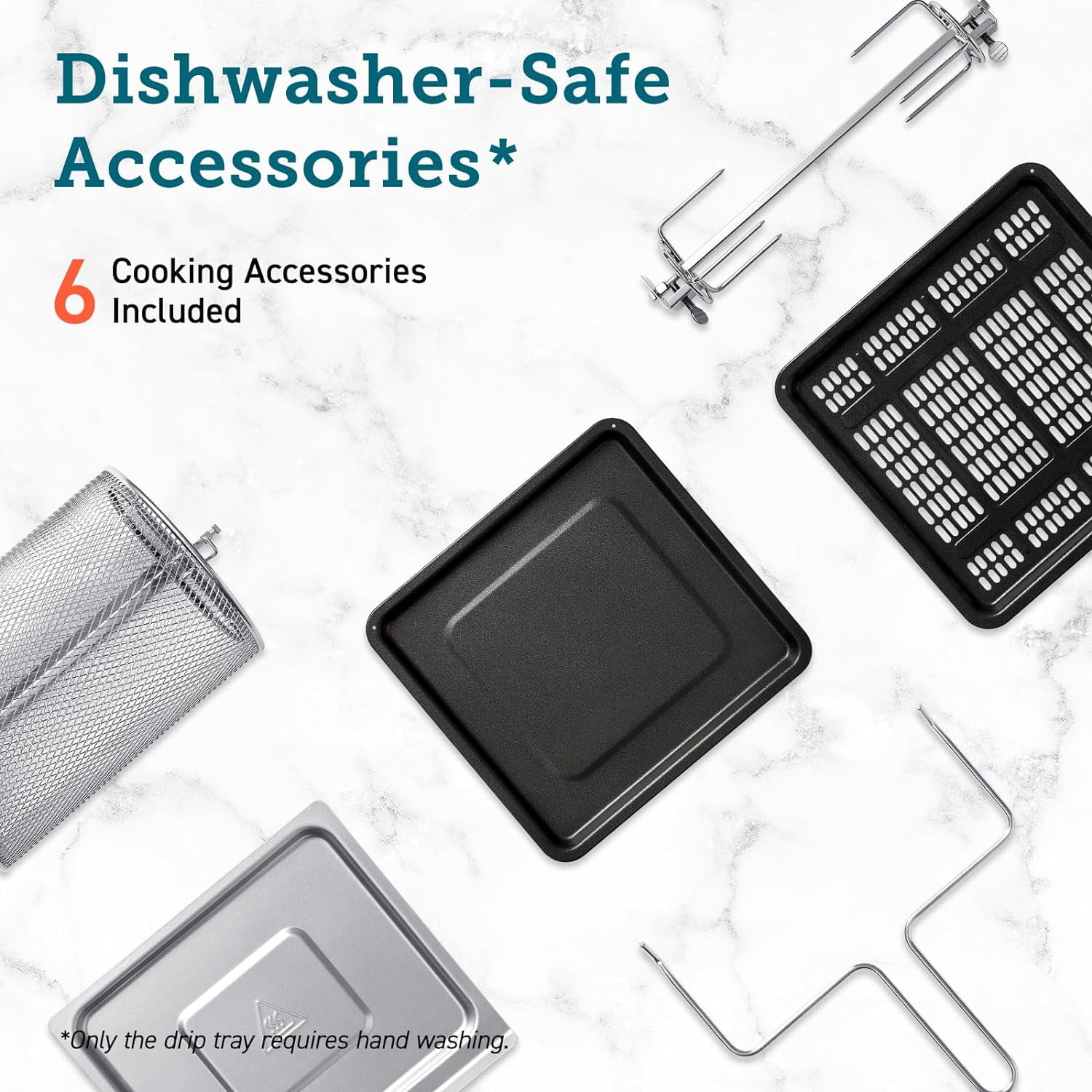 More Cooking Functions: Air fry, bake, Rotisserie, broil, dehydrate, reheat, toast, proof, and keep warm. Explore more cooking possibilities that regular air fryers can’t bring you. Larger Capacity: 13-Quart fits up to 2 lbs of fries, an 8-inch pizza, or 4 lbs of chicken, occupying the same kitchen space but providing more cooking room, perfect for weekly family cooking. Faster, Healthier Meals: Cooks 40% faster than traditional ovens, but contains only 15% of the fat (Compared to traditional deep fryers tested with frozen french fries). Rapid Heat Circulation: The 120V / 1800W motor and dual heating elements ensure fast, crispy, and juicy results by evenly spreading hot air from top to bottom. (Please note that this voltage only applies to the US and Canada.) Food Window and Oven Light: Clear glass window and convenient oven light create a better cooking experience, enhancing the visibility of the cooking process, never worry about overcooking your food. 6 Effective Accessories Included: Include an air fryer tray, a rotisserie basket and rotisserie fork set, as well as handle, food tary and drip tray, help you to cook more efficiently. Easy to Clean: The food-grade steel housing is durable and easy to clean. Our food tray and frying tray are made of non-stick material. Except for the drip tray, all accessories are dishwasher safe for quick and easy cleanup. Original Recipes: Cooking healthy and delicious meals is easy with the included 30 recipe book developed by COSORI chefs, and you can discover more recipes on the free VeSync app. For Better Taste: As an air fryer that excels in creating crispy results on food surfaces, we recommend flipping the bread halfway through toasting to achieve more uniform browning. Safe to Use:This air fryer features an industry standard coating that withstands temperatures over 660°F which is designed to not cause any quality changes or release harmful substances in operation. The food contact parts are BPA-Free, making it safe for food contact too