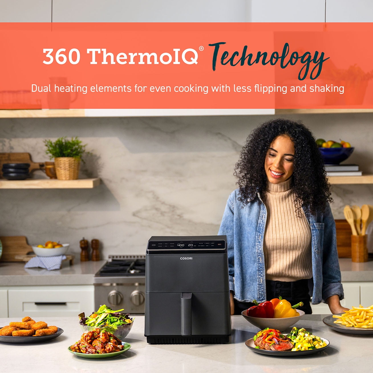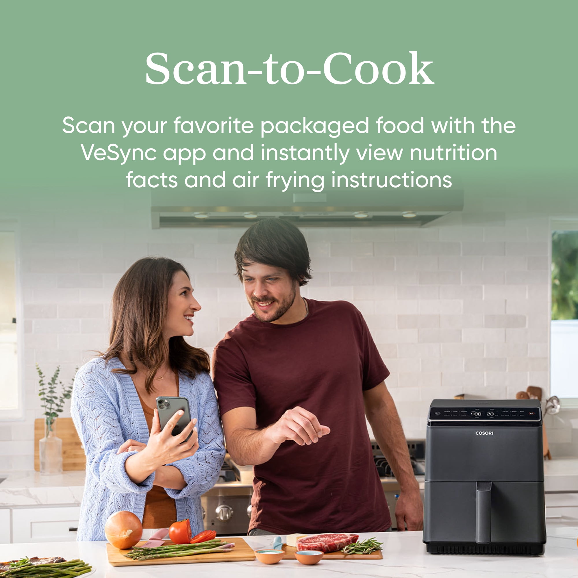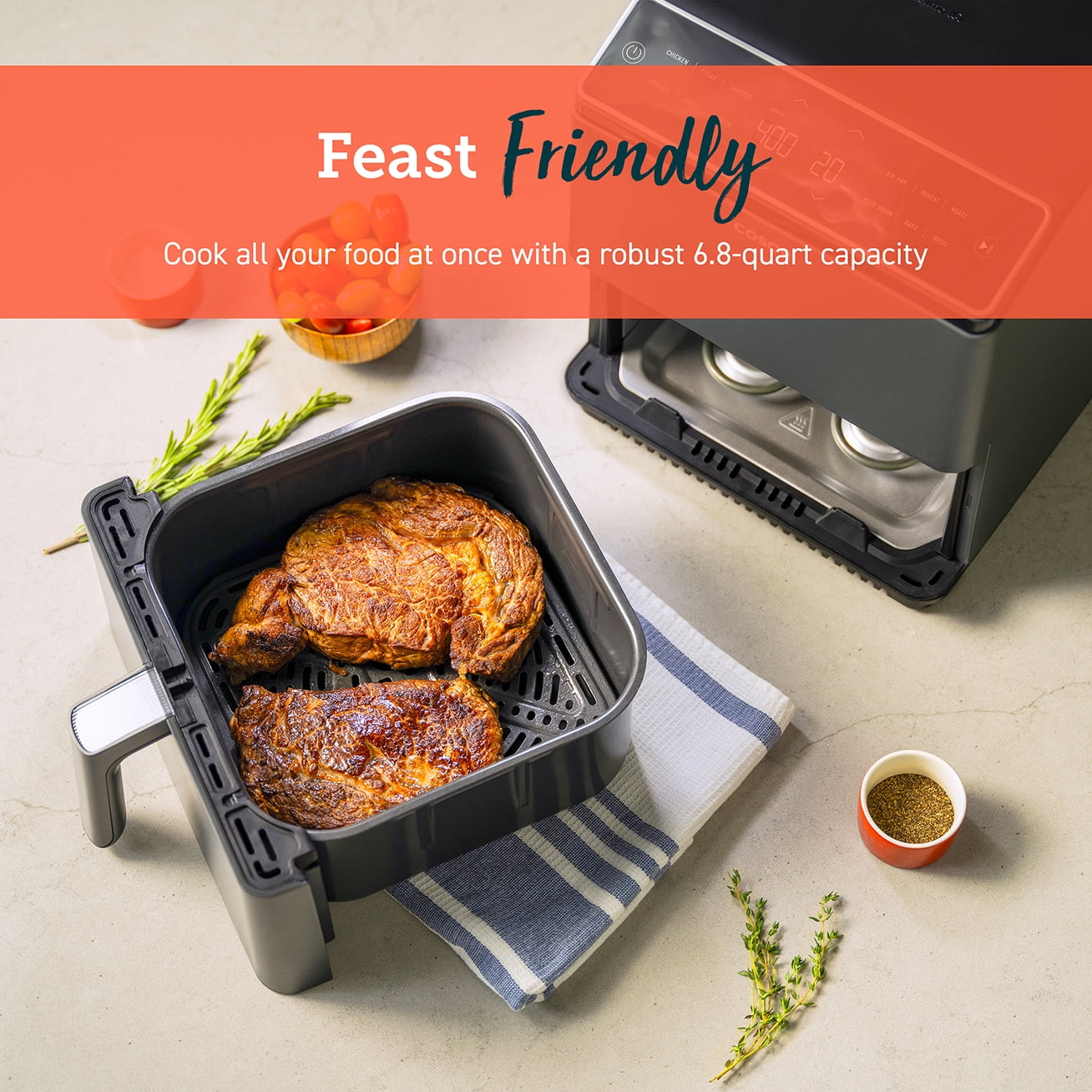 360 ThermoIQ® Technology: Dual heating elements cook both sides of your food evenly with less shaking or flipping. 12 Functions: Chicken, Steak, Seafood, Veggies, Fries, Frozen, Air Fry, Reheat, Broil, Roast, Bake, and Keep Warm. Smart Control: Control your air fryer remotely, monitor cooking progress, and activate voice control, all through the VeSync app. Up to 85% Less Oil: Less oil means less greasy food. Cook with up to 85% less oil compared to a traditional deep fryer. Plenty of Space: Cook all your food at once with the large 6.8-quart capacity.