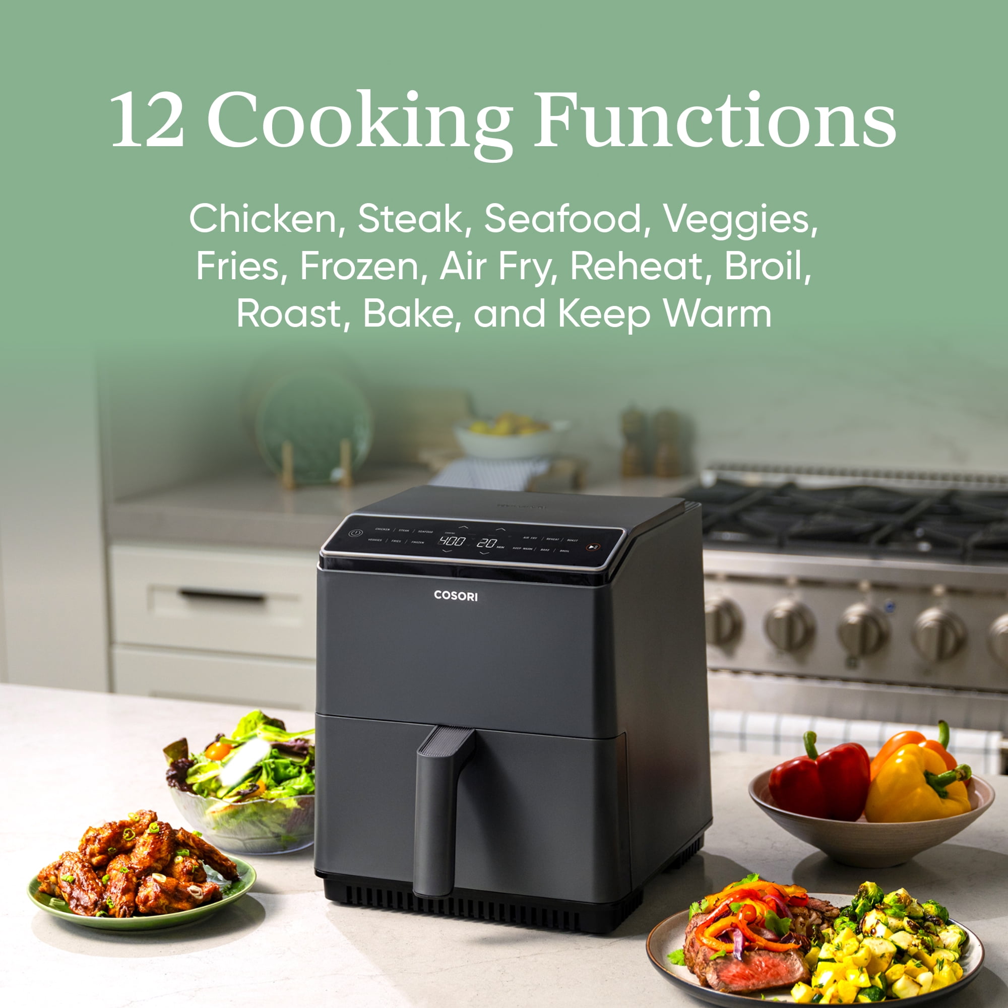 Level up your air frying game with the COSORI Dual Blaze™ 6.8-Quart Smart Air Fryer. Featuring 360 ThermoIQ™ Technology, this air fryer uses heating elements above and below your food for even cooking without preheating or shaking. The clear LED display offers 12 customizable cooking functions for perfect results at the touch of a button. Connect to the free VESYNC app to change time and temperature settings, monitor meal progress, find recipes, and use voice control with Amazon Alexa or Google Assistant. Power: 1700 watts.