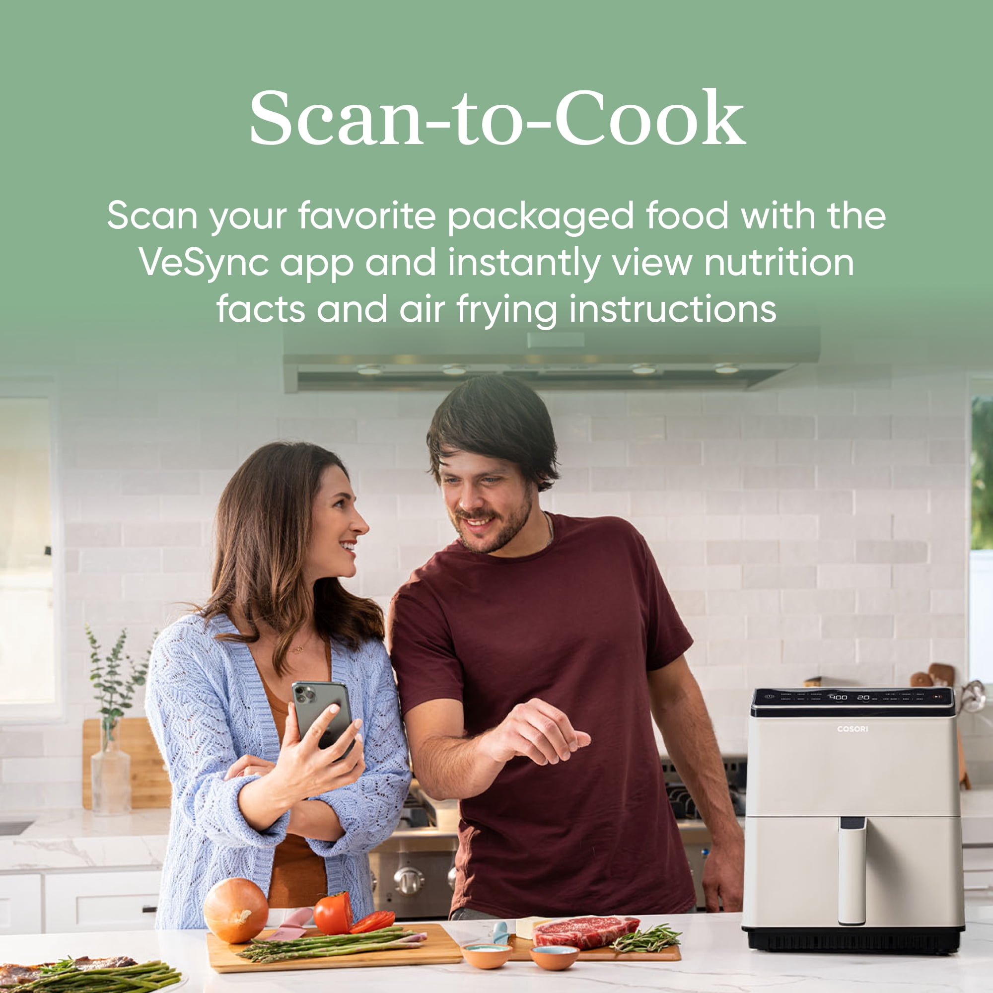 360 ThermoIQ™ Technology: Dual heating elements and patented automatic temperature control cook evenly without needing to shake or preheat. 12 Customizable Cooking Functions: Air Fry, Bake, Broil, Roast, Reheat, Keep Warm, Chicken, Steak, Seafood, Veggies, Fries, and Frozen. Smart Control: Connect your air fryer to the free VeSync app to remotely control your air fryer, monitor cooking progress, and connect to Amazon Alexa or Google Assistant for voice control.