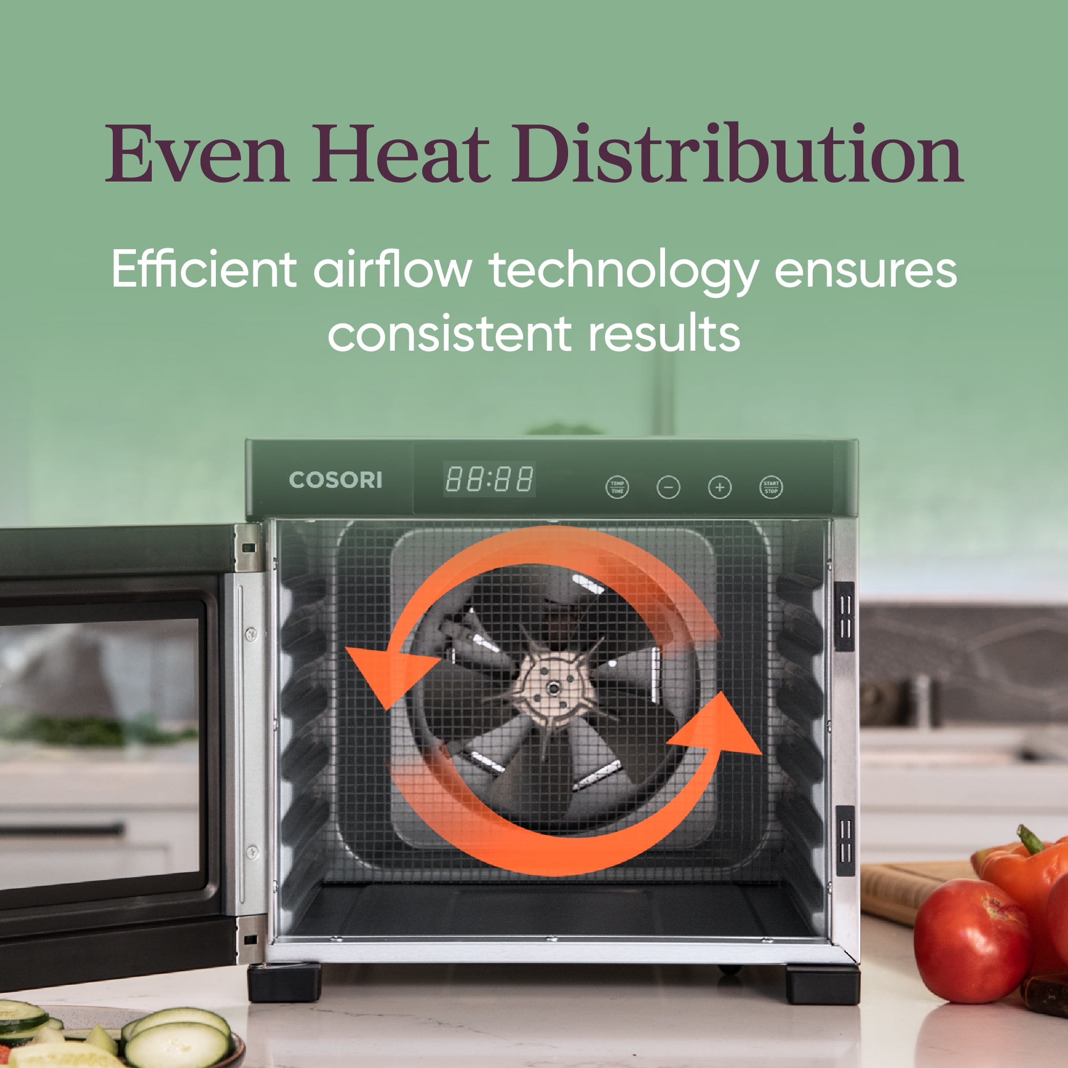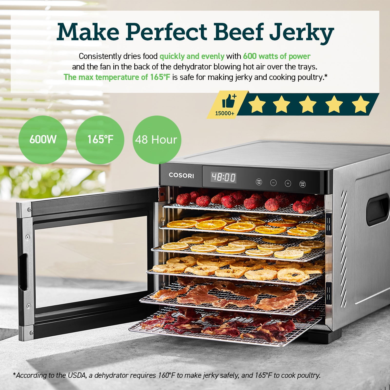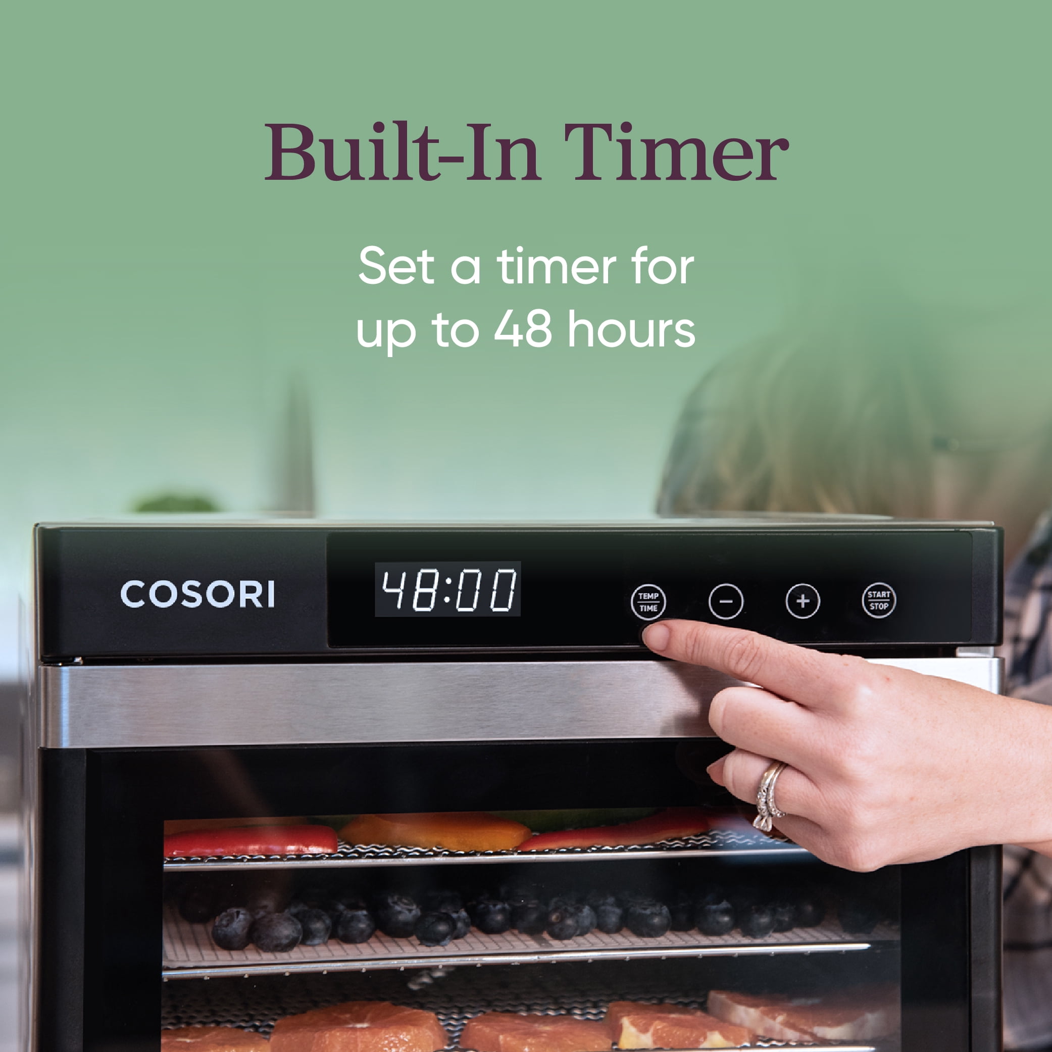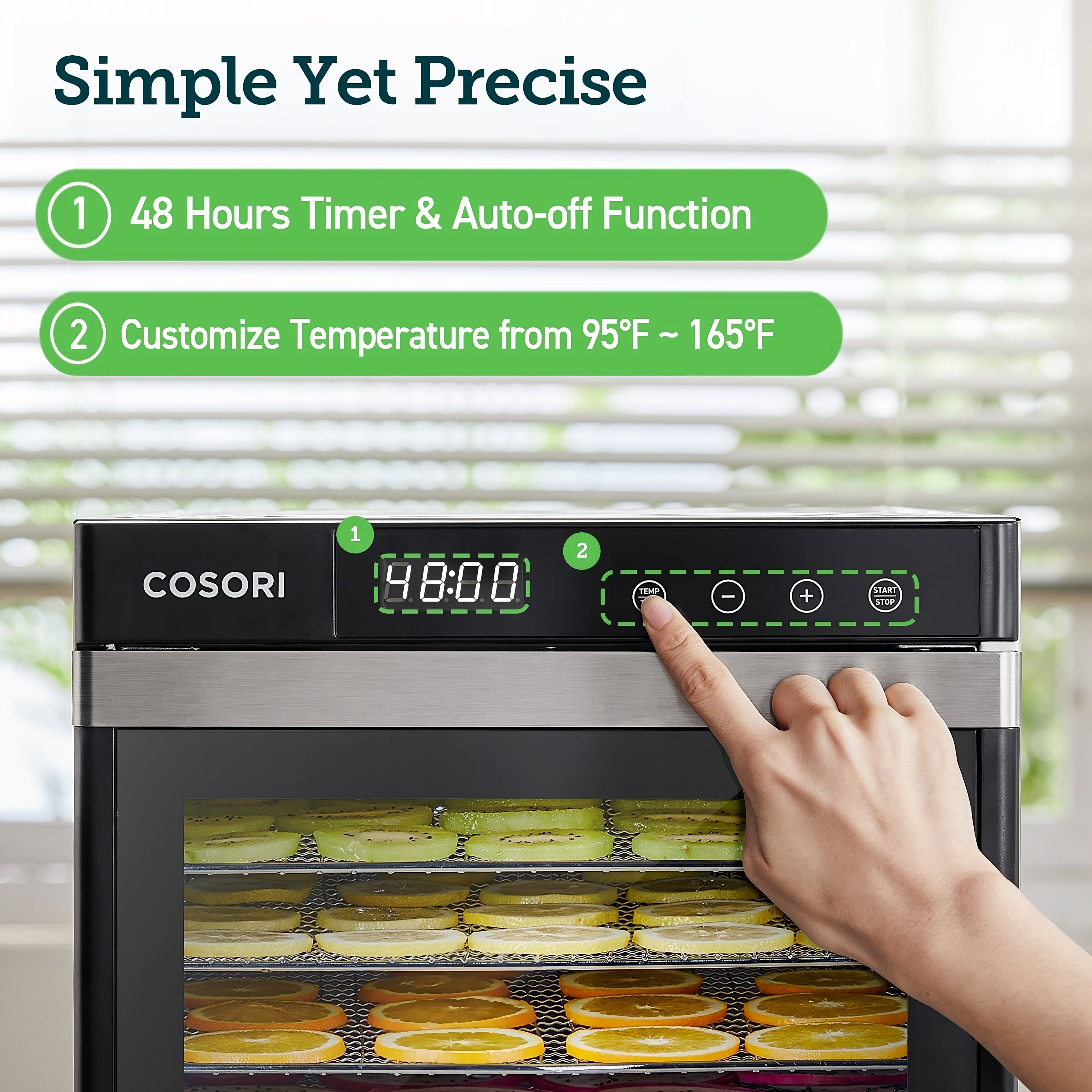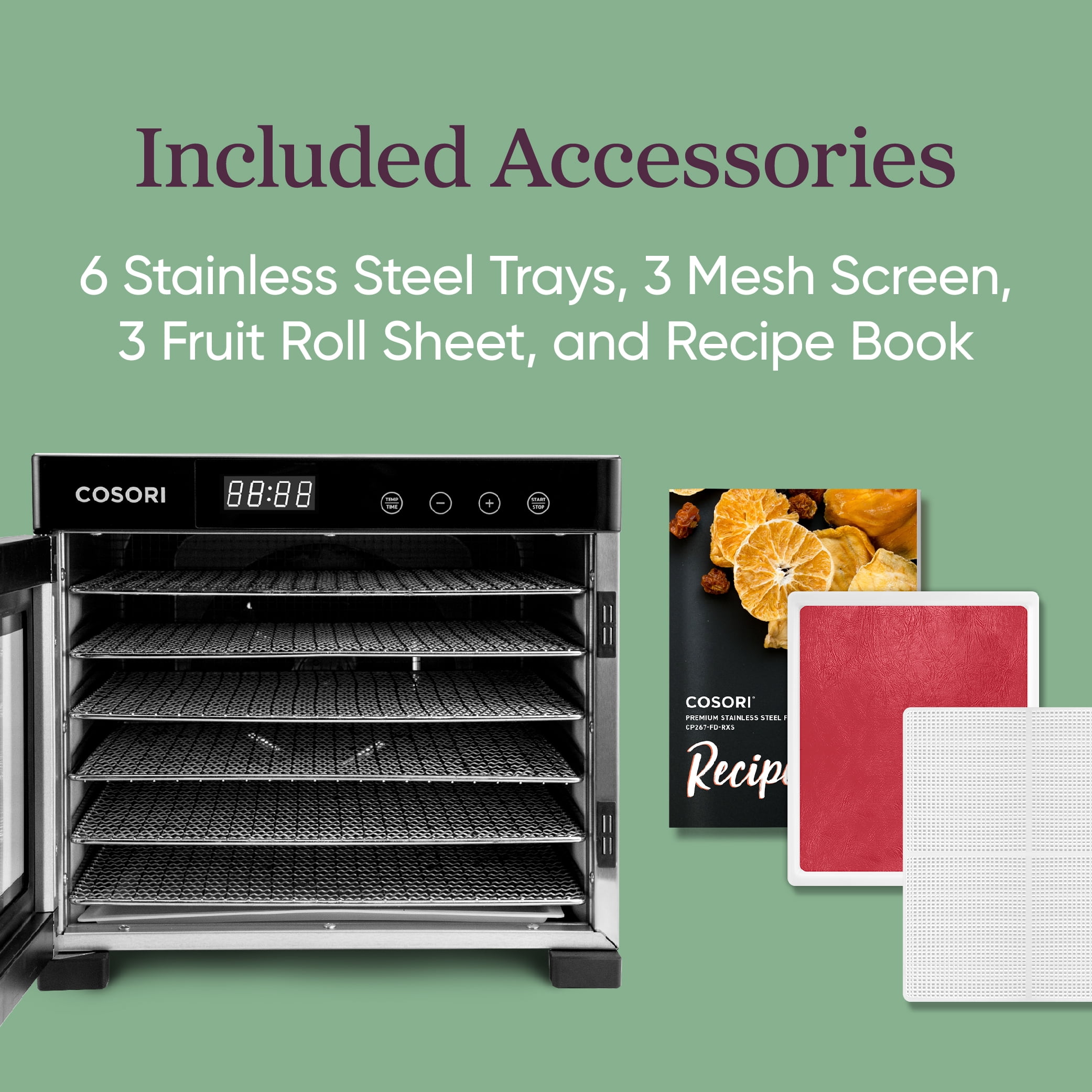 Specifications: Accessories: 6 x Stainless Steel Trays, 3 x Mesh Screen, 3x Fruit Roll Sheet, 50 Original Recipes User Friendly: Glass Front Door, Memory Function, Touch-Control LED Display, Dishwasher Safe Trays, Horizontal Airflow, Efficient Heat Distribution Adjustable Temperature: 95°F–165°F Material: Stainless Steel Why Cosori? U.S.-Based Customer Service, Large Online Cosori Users Community, Direct Assistance from Cosori Chefs, Hassle-Free 2-Year Warranty Timer: 30 Min–48 H Quiet Operation: ≤47dB Included Recipe Book with 50 Original Recipes Power: 600W Safety First: Food-grade Stainless Steel, Automatic Shutoff, Overheat Protection CP267-FD-RXS