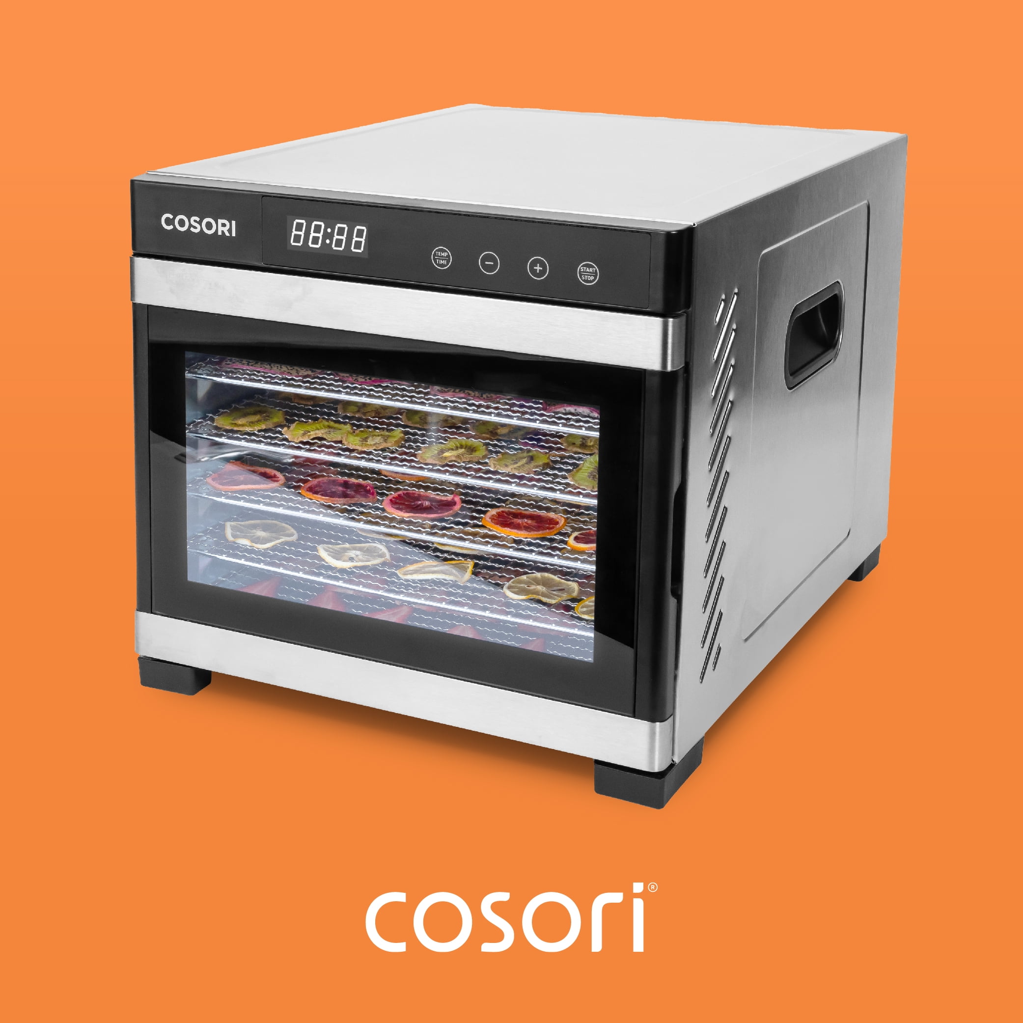 Exclusive Food Dehydrator with Bonus 3 Mesh Screens and 3 Fruit Roll Sheets than Classic in Silver and in Black! Efficient dehydration: Advanced rear fan design makes all the delicious difference! The rear-mounted fan driven by 600W of power dehydrates food more efficiently by evenly distributing heat. Compared with the bottom fan, the rear fan can dry every piece of your food evenly, without frequently rotating trays. The dehydrator can make more delicious food quickly but retain 97 percent of vitamins and minerals. Large Capacity: The dehydrator has 6 stainless steel trays and a huge capacity to dehydrate different fruits, vegetables and jerky at the same time. The glass door design allows you to monitor the drying of your food at any time. Make healthy and easy-to-storage snacks at home. Easy to use: Use the one-touch digital control panel to accurately set the timer (30 min-48 hr). Temperature control up to 165°F can effectively kill bacteria while presenting the optimal taste and original flavor of the food. Provides you with a more precise and flexible temperature selector in increments of 1°F. Safe to Use: Use your food dehydrator stress-free with automatic shutoff and overheat and anti-scalding protection. The dehydrator is also ETL-listed. Worry-Free Cleaning: Made of food-grade stainless steel, the trays are dishwasher safe, reducing post-dryer cleanup and keeping your hands free. Join Cosori, you will also be surprised with: 50 original recipes, fresh from the COSORI kitchen. Large Online Cosori Users Community. Direct Assistance from Cosori Chefs. CP267-FD-RXS