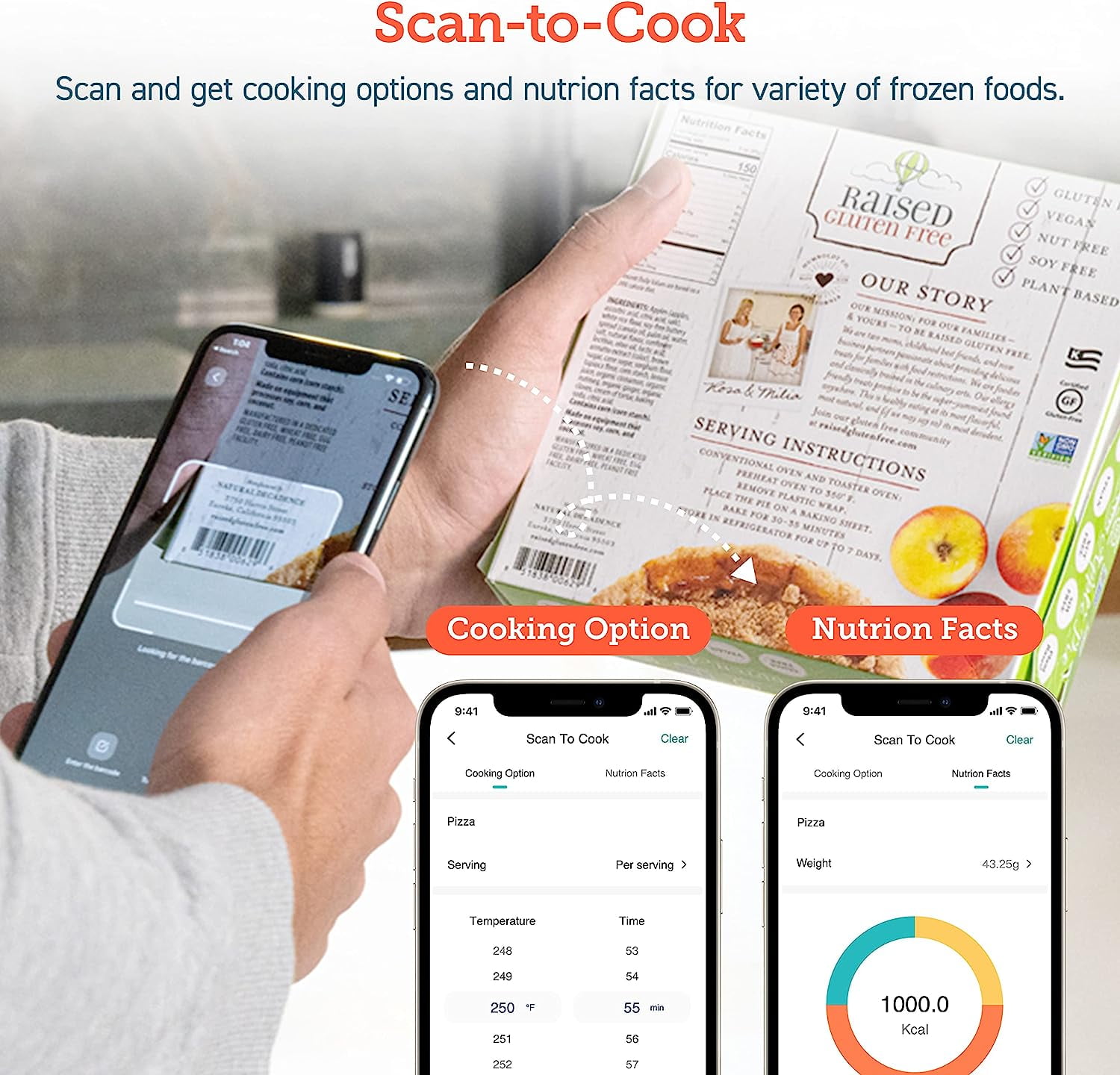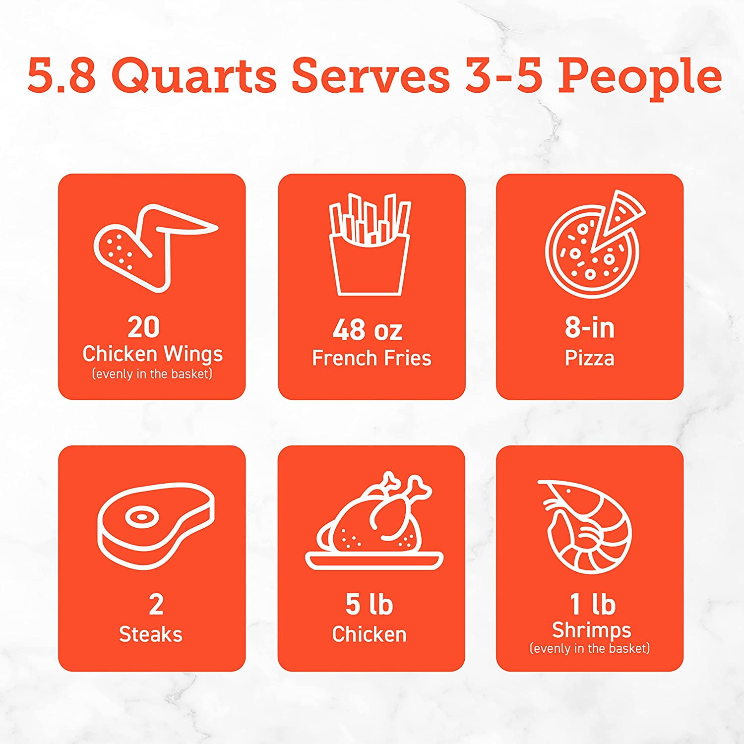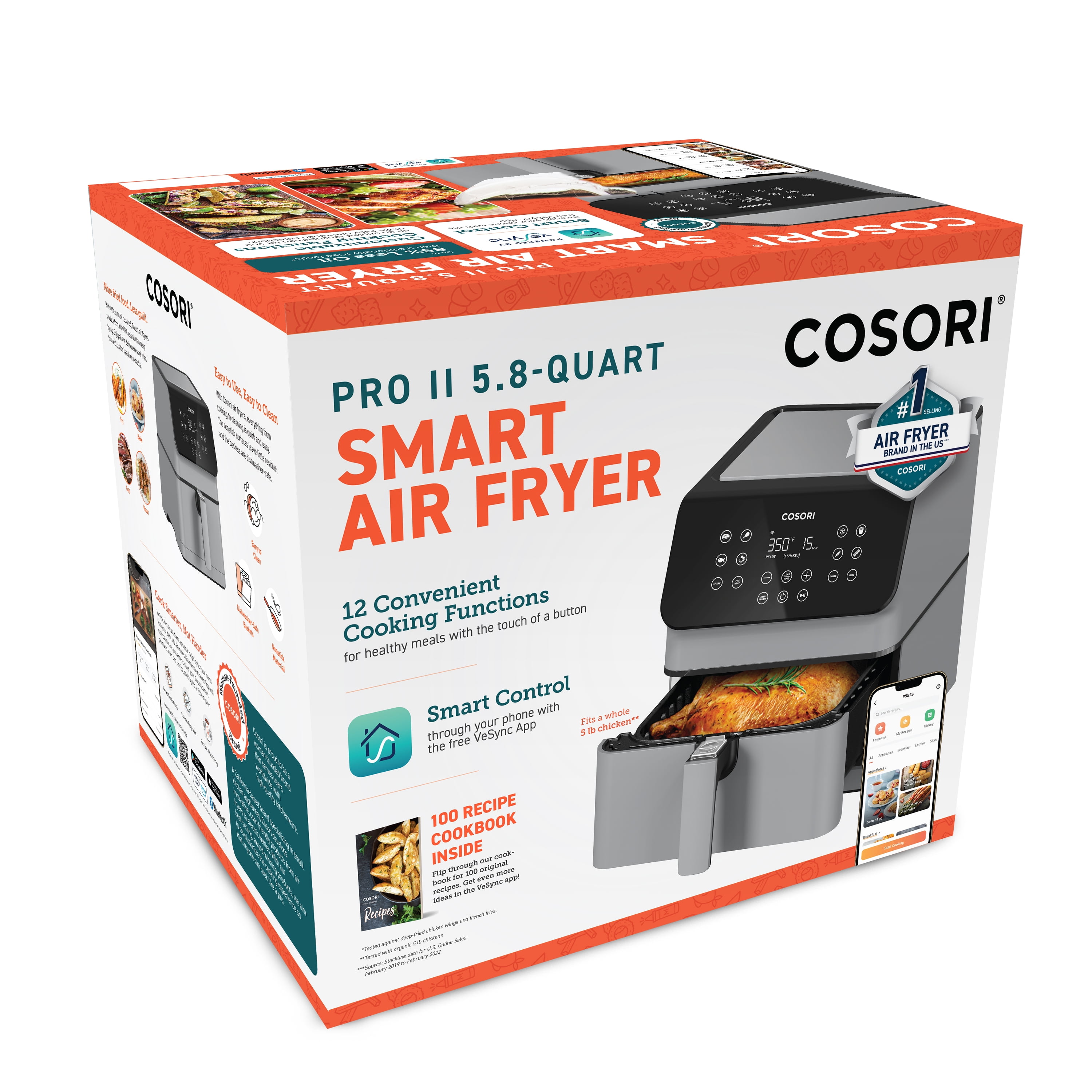 Capacity: 5.8 qt / 5.5 L (serves 3–5 people) Temperature Range: 170°F –400°F / 77°C –205°C Time Range: 1–60 min Up to 85% Less Oil 12-in-1 Versatile Cooking Functions App and Voice Control Scan-to-Cook—frozen to table in minutes 200+ Online Recipes Monitor the Cooking Process Cooking Notifications Touch Screen Panel 2-layer Nonstick, Dishwasher-Safe Basket Automatic Shutoff Anti-Scalding U.S.-Based Customer Service Large Online COSORI Users Community Direct Assistance from COSORI Chefs 2-Year Limited Warranty Basket Dimension: 9.0 x 9.0 x 3.8 in / 22.9 x 22.9 x 9.7 cm Power Supply: AC 120V, 60Hz Rated Power: 1700W Cooking Basket is Dish Washer Safe