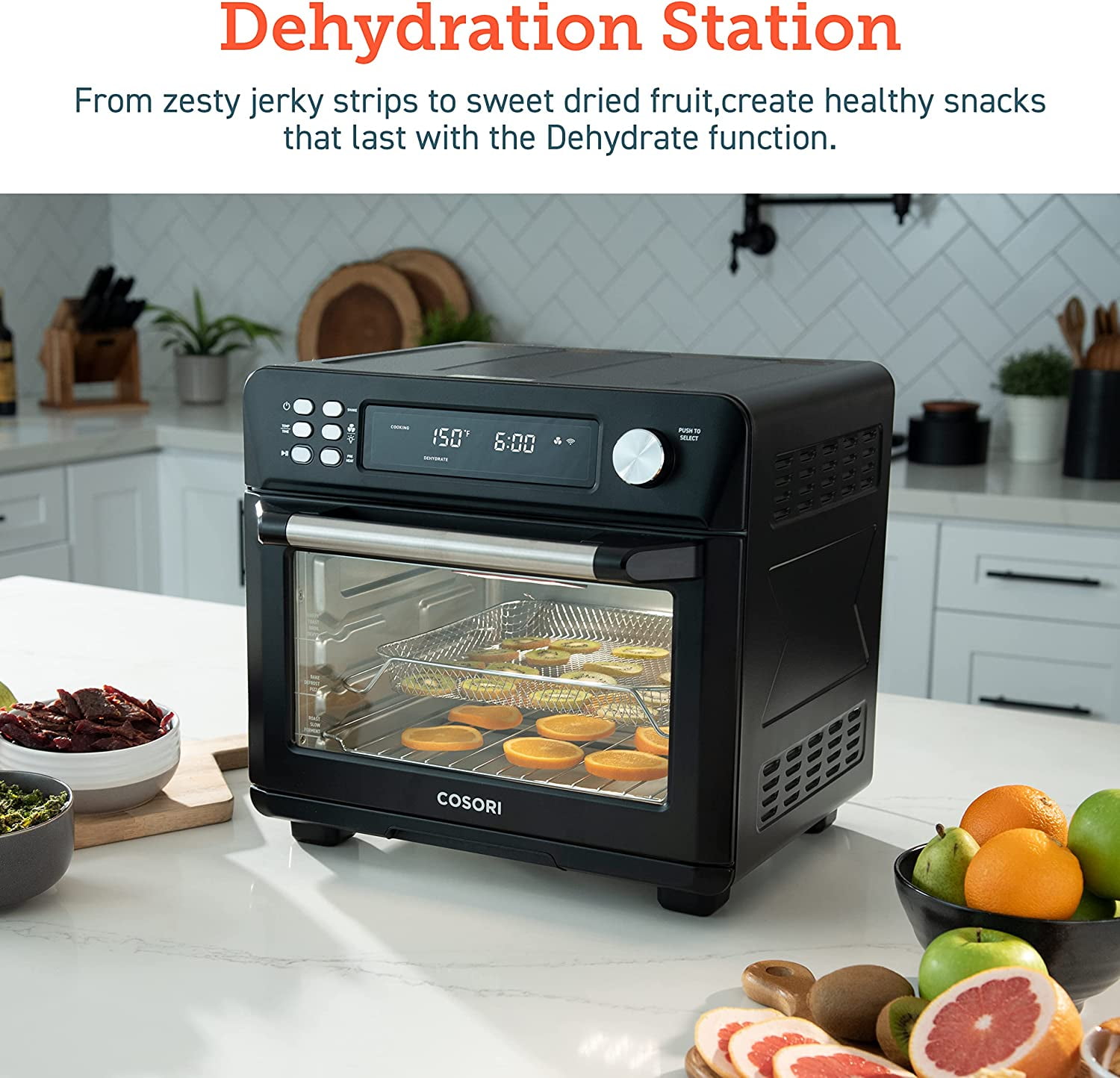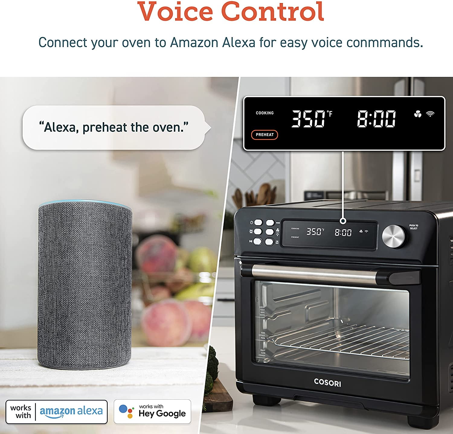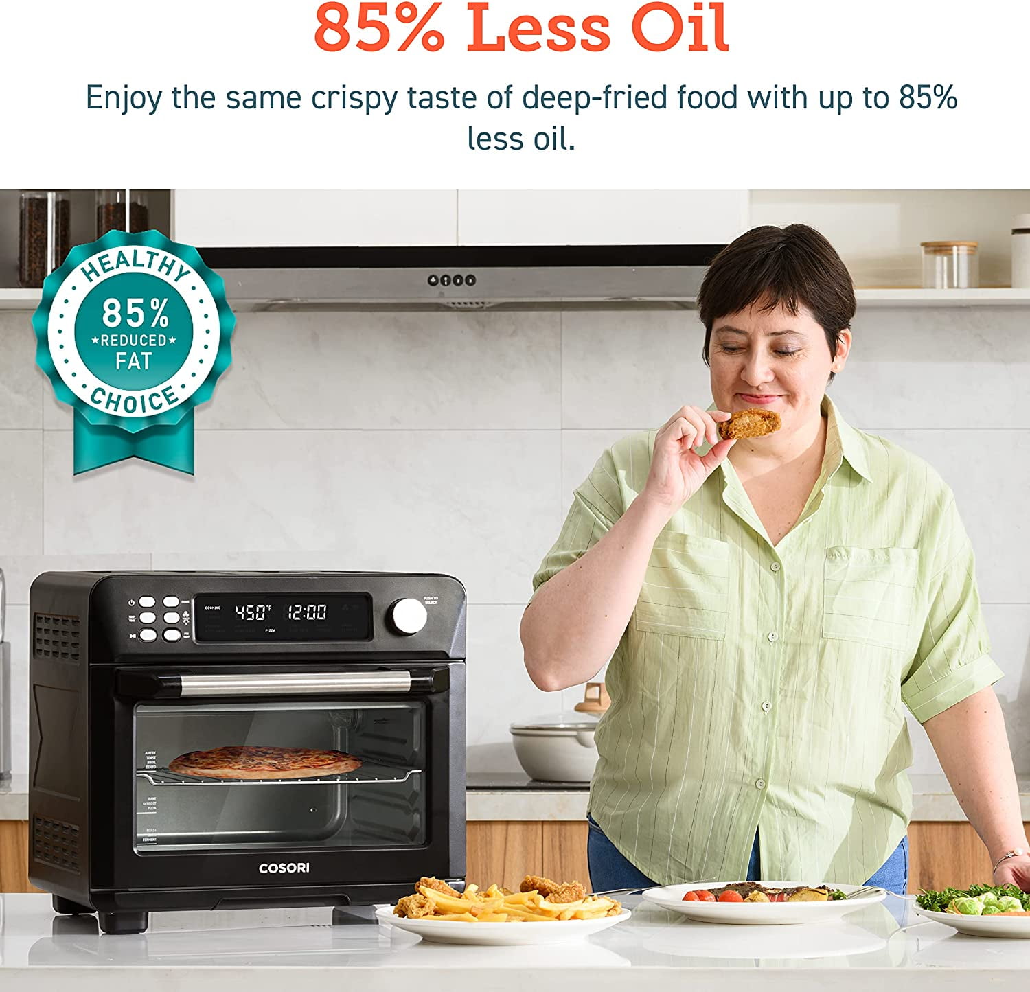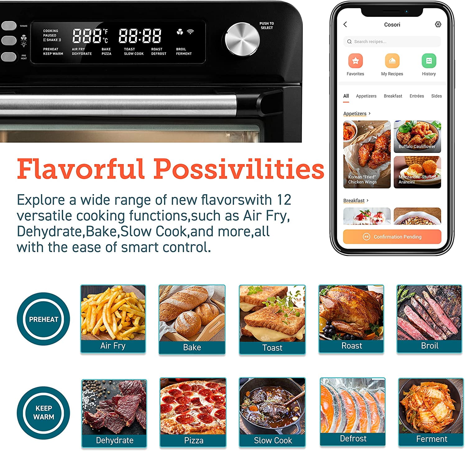 COSORI Toaster Oven New Air Fryer, Smart 26.4QT Large Stainless Steel Convection Oven, Black. 12 cook functions: The temperature range of 80F – 450F makes you enjoy a wide range of cooking functions including Air Fry, Dehydrate, Bake, Defrost, Ferment, and more. Easily access your comfort food favorites through 12 functions, and watch it fry to crispy perfection with crystal-clear windows and ultra-bright built-in light. 26QT Large Capacity: The oven’s 26 quart (25L) capacity fits up to 6 slices of bread, a 12-inch pizza, or whole chicken is not only an air fryer but also a family rotisserie oven. Smart Kitchen Assistant: Make cooking the easiest thing! Just pick up your smartphone and tap the VeSync app to make meals at the touch of a button, or with the sound of your voice using Amazon Alexa or Google Home. Flip through 30 chef-made recipes in the included cookbook with more on the VeSync app. Even people with no cooking experience can now make dreamy meals. Easy to clean: All accessories are removable and dishwashers safe. Enjoy the cooking process and delicious food without worrying about a series of issues such as cleaning. Upgrade Exclusive Model with a bonus Meat thermometer! Join Cosori, you will also be surprised with: 100 original recipes, fresh from the COSORI kitchen, a Large Online Cosori Users Community, and Direct Assistance from Cosori Chefs. 22 lb