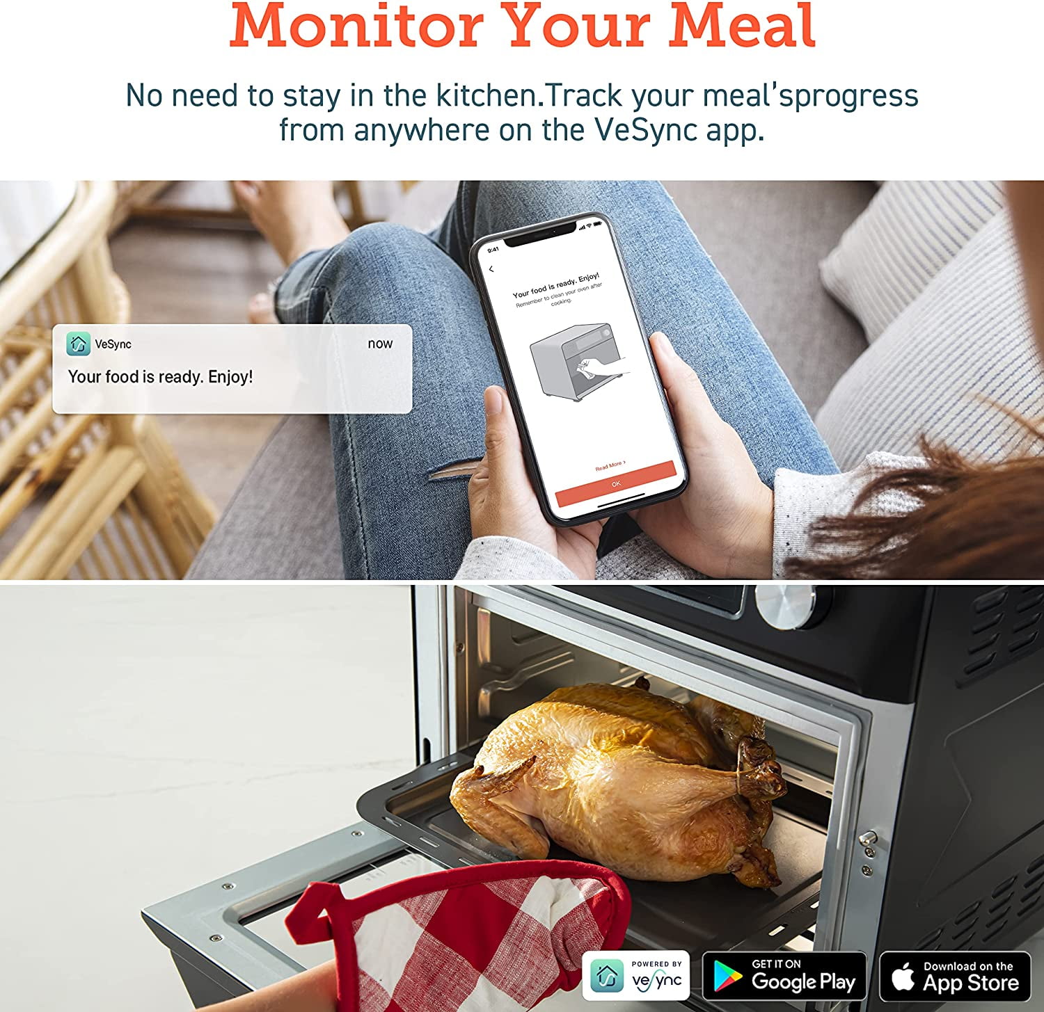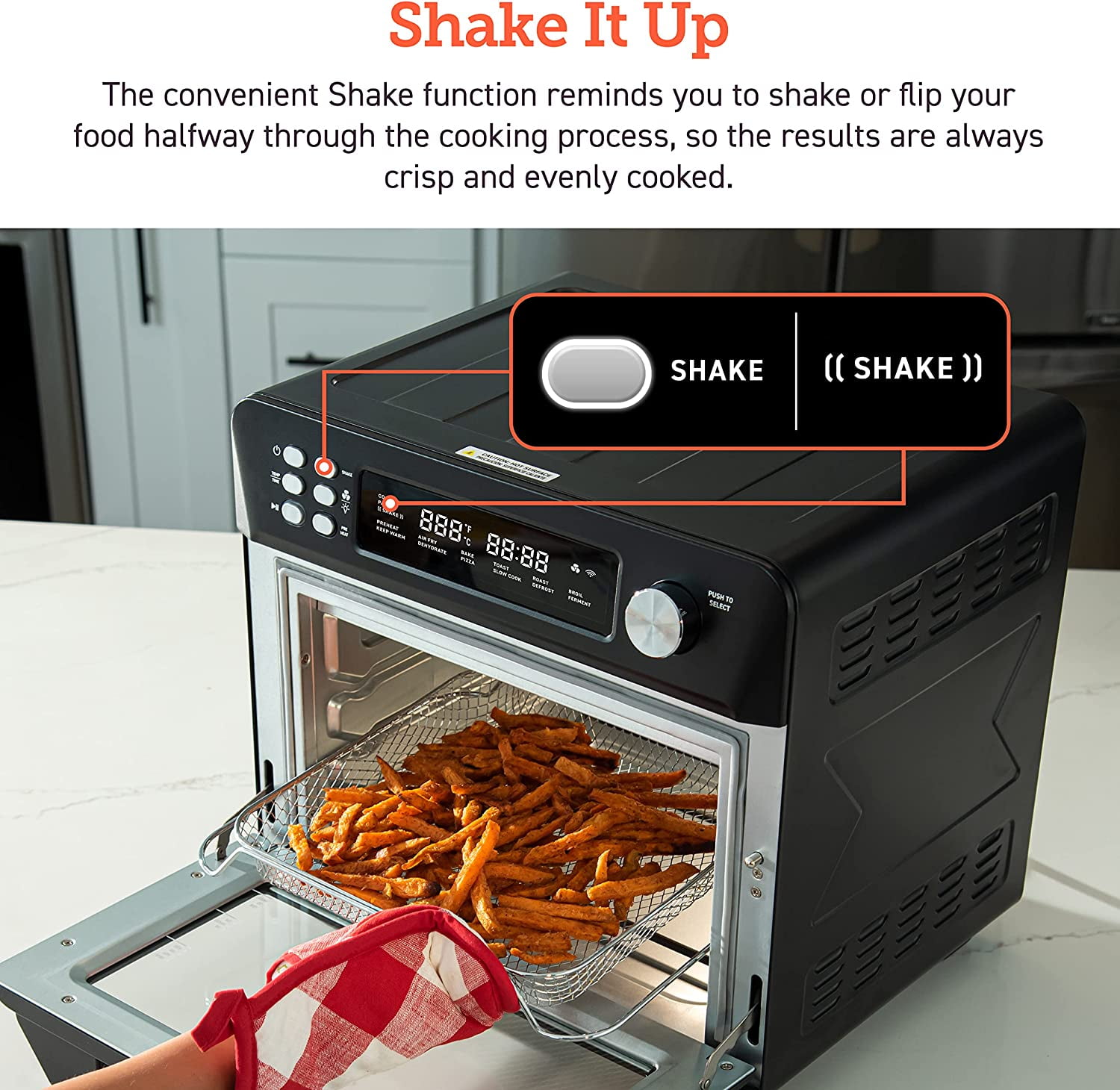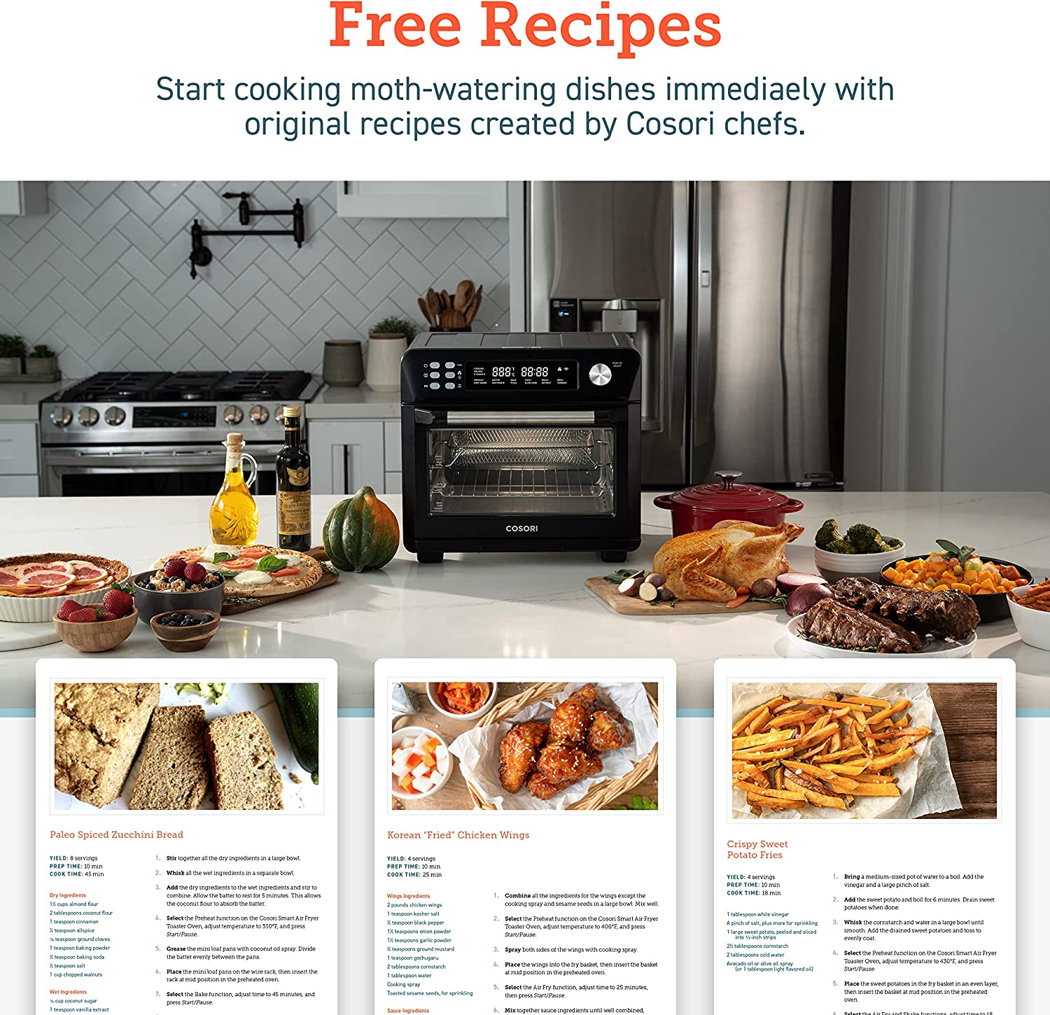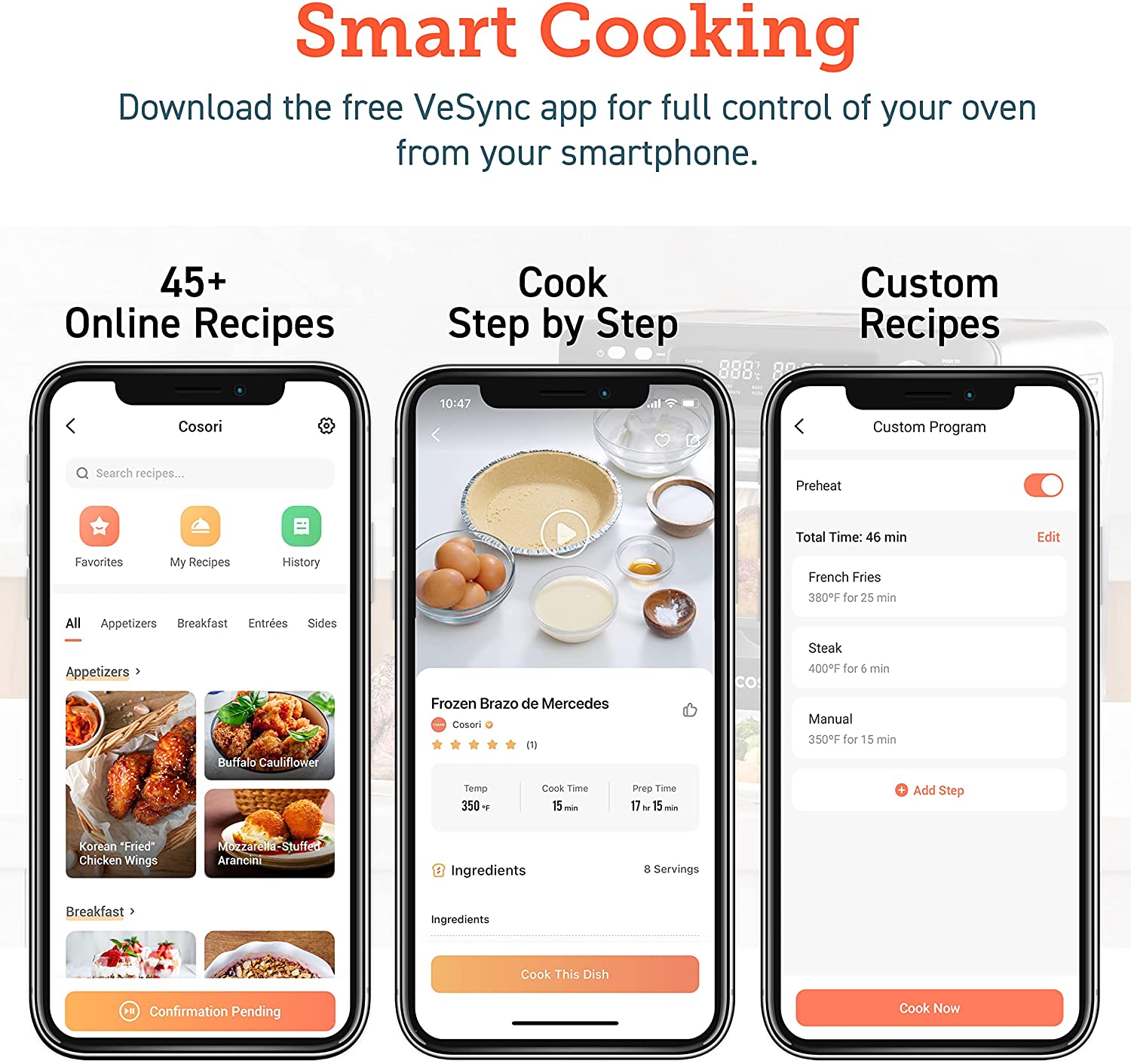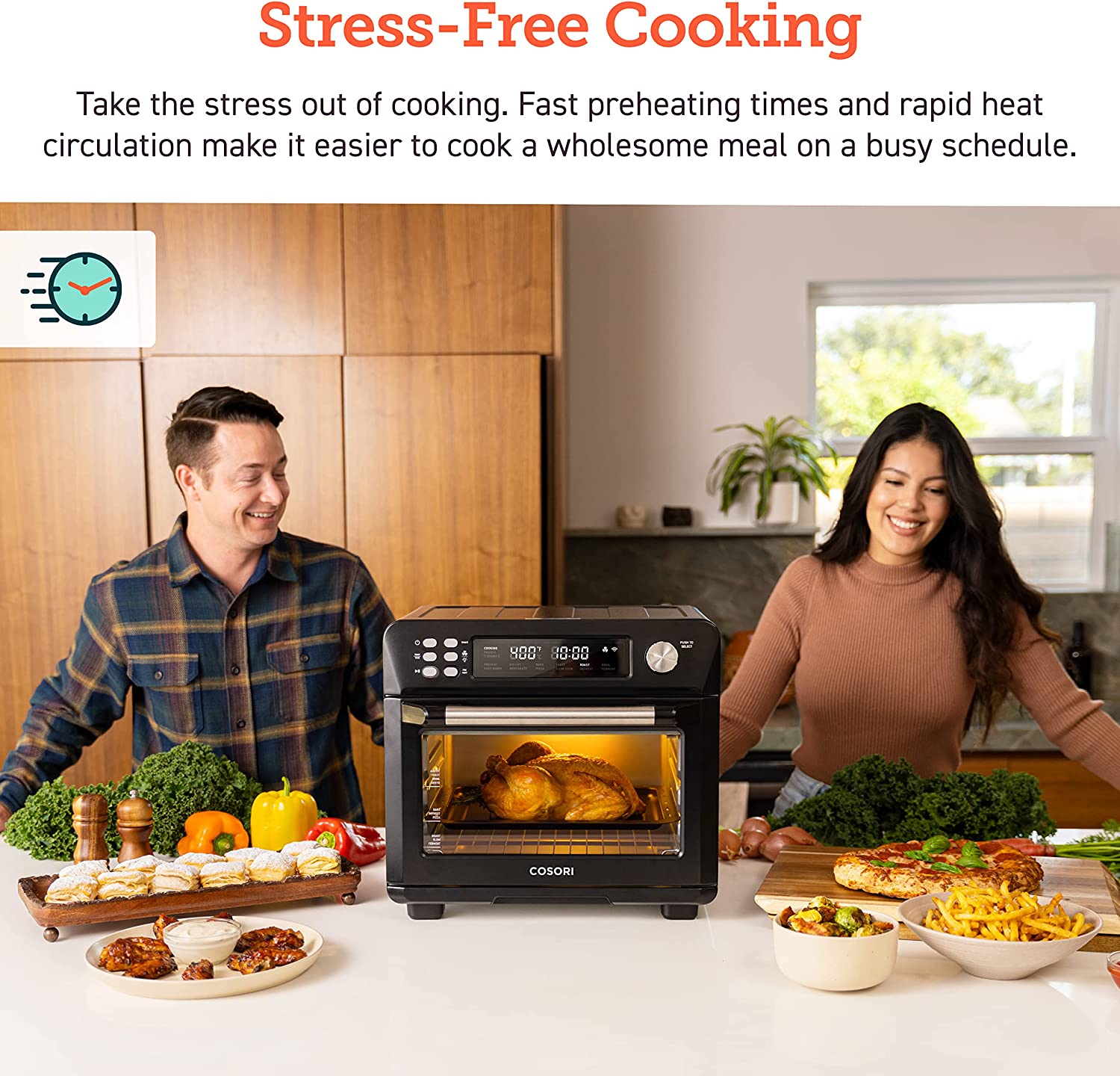 COSORI Toaster Oven New Air Fryer, Smart 26.4QT Large Stainless Steel Convection Oven, Black. 12 cook functions: The temperature range of 80F – 450F makes you enjoy a wide range of cooking functions including Air Fry, Dehydrate, Bake, Defrost, Ferment, and more. Easily access your comfort food favorites through 12 functions, and watch it fry to crispy perfection with crystal-clear windows and ultra-bright built-in light. 26QT Large Capacity: The oven’s 26 quart (25L) capacity fits up to 6 slices of bread, a 12-inch pizza, or whole chicken is not only an air fryer but also a family rotisserie oven. Smart Kitchen Assistant: Make cooking the easiest thing! Just pick up your smartphone and tap the VeSync app to make meals at the touch of a button, or with the sound of your voice using Amazon Alexa or Google Home. Flip through 30 chef-made recipes in the included cookbook with more on the VeSync app. Even people with no cooking experience can now make dreamy meals. Easy to clean: All accessories are removable and dishwashers safe. Enjoy the cooking process and delicious food without worrying about a series of issues such as cleaning. Upgrade Exclusive Model with a bonus Meat thermometer! Join Cosori, you will also be surprised with: 100 original recipes, fresh from the COSORI kitchen, a Large Online Cosori Users Community, and Direct Assistance from Cosori Chefs. 22 lb
