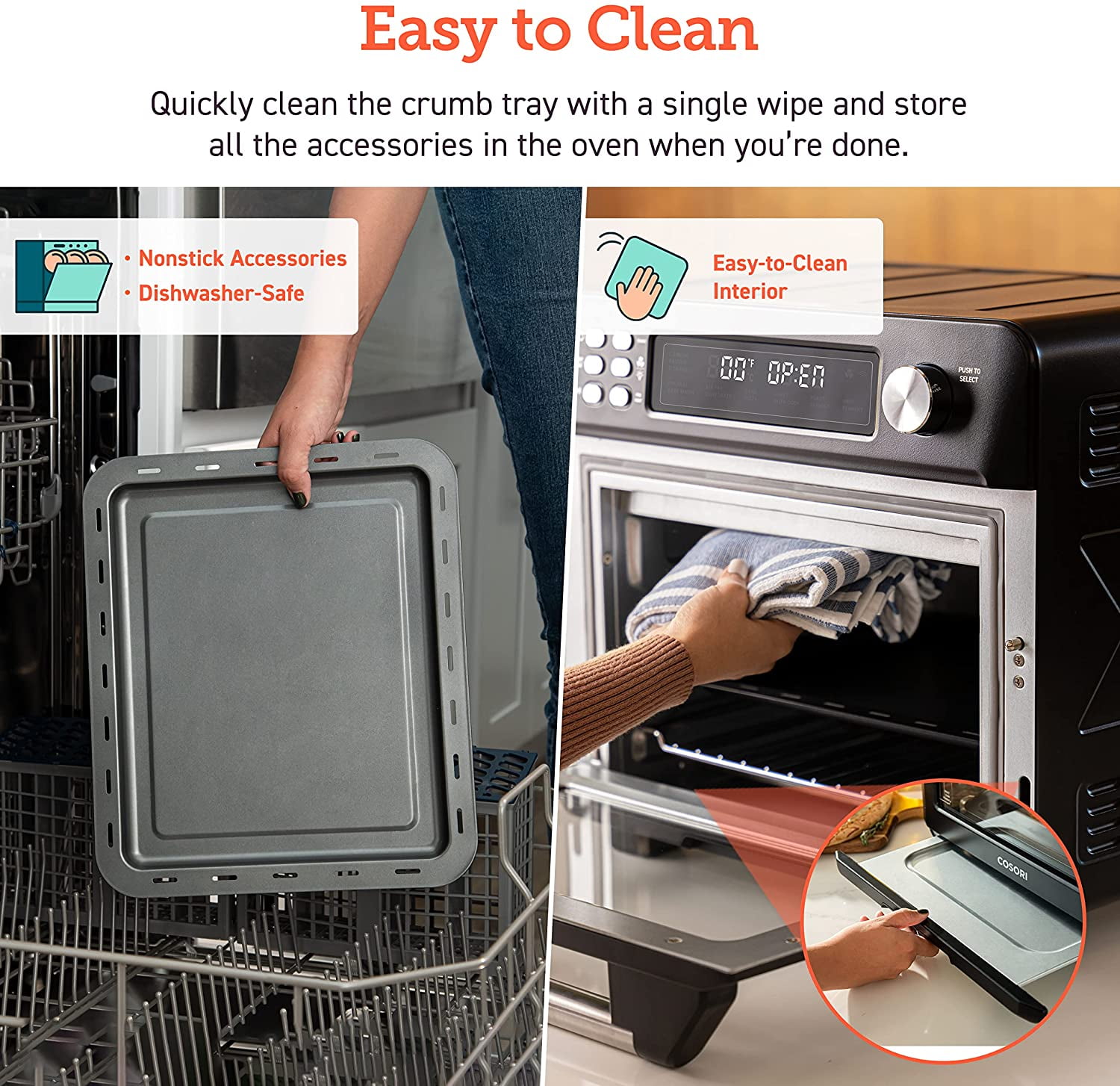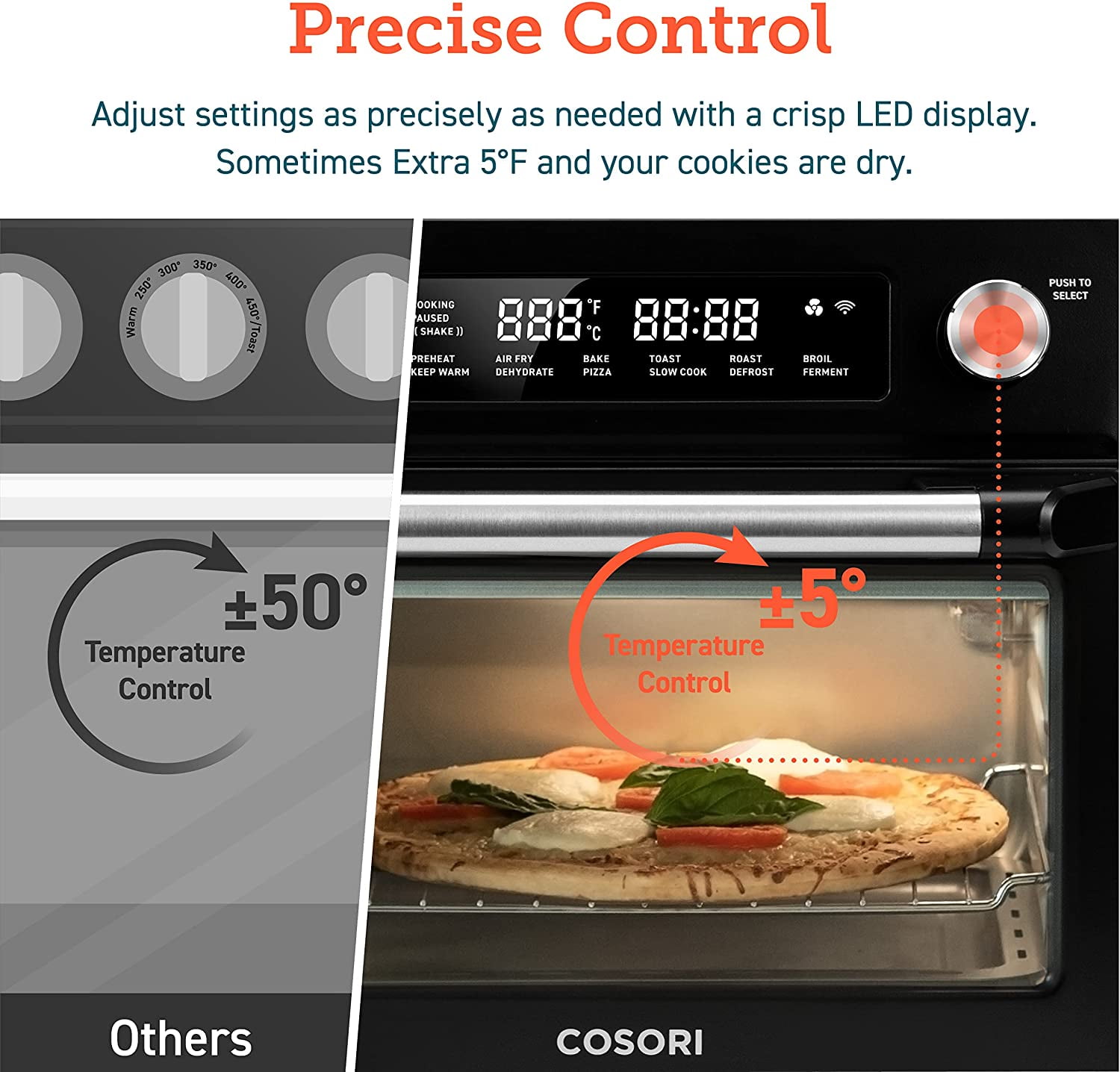 Capacity: 26 QT / 25 L,serves 5-6people Toaster Oven-Interior Dimension: 12.8 x 13.4 x 8.9 inches (D x W x H) LED Digital Display Exterior Dimension: 16.3 x 16.9 x 15.5 inches (D x W x H) Quick & Easy Cleanup Toast, Bagel, Pizza, Bake, Roast, Air Fry, Broil, Cookies, Rotisserie, Dehydrate, Ferment Item Weight: 22 lb / 9.98 kg (including accessories) Time Range: 0-24 Hours Select Warm to keep your food ready to serve Large Online Cosori Users Community Material: Stainless Steel+ Non-stick. Direct Assistance from Cosori Chefs Smart Features with Free VeSync App: Voice Control With Alexa/ Google Assistance Hassle-Free 2-Year Warranty Optional Interior Light Pizza: Fit a 12-inch pizza. Comes with: Air Fry Basket, Wire Rack, Food tray, Recipe Book, User Manual Safe Automatic Shutoff