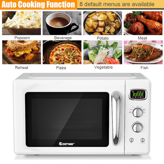 • The retro microwave oven has default cooking menu for popular foods such as popcorn, pizza, potatoes