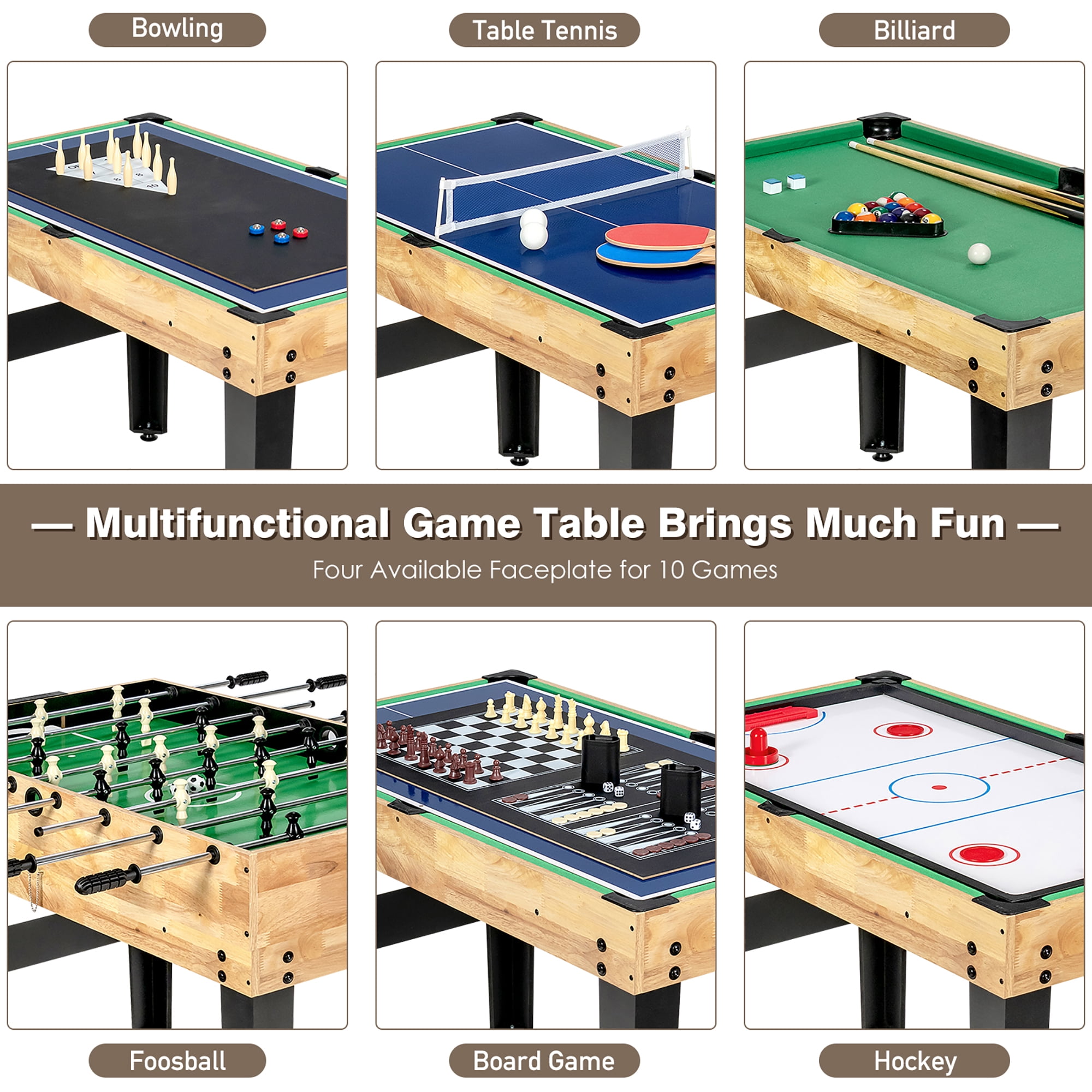 Are you looking for a family game table? Our 10-in-1 game table is the perfect choice for you! The multi-game table provides you with 10 game options, including foosball, bowling, table tennis, hockey, billiard, shuffleboard, checkers, cards, chess and backgammon, which meets all your needs and is suitable for family use. Therefore, you can enjoy blissful time with your kids. Besides, with stack up design, it is easy to switch different game boards, which is also space-saving. What’ s more, solid wooden frame and considerate leveler ensure the safety and sturdiness, preventing it from suddenly collapsing or wobbling. Its ideal height makes it suitable for both kids and adults. Each rod with anti-slip hand grip allows for a better gaming ex perience. In addition, it offers all necessary accessories for you. You and your family can immediately have fun together. Feature 10 game to satisfy your various entertainment needs Stack-up design to conveniently switch different games and save space Stable wood frame for ex cellent sturdiness and a long service life Two latches on the both side make additional safety Considerate leveler for ex tra stability and floor protection Tex ture hand grip, Gold box and scoring device for a better gaming ex perience Suitable for various places, such as home, office, bar, arcade, club, etc. Comes with all required accessories, including 2 hockey pucks, 2 soccer balls, 2 table tennis balls, 2 dice box es, 2 dices, etc All hardware and detailed instruction for easy installation Specification Color: As Picture Shows Material: MDF + Metal + Plastic + Melamine Table Base Dimension: 40.5” x 23” x 27” (L x W x H) Foosball Table Dimension: 41.5” x 24” x 31.5” (L x W x H) Dimension of Hockey Tabletop: 38” x 20.5” (L x W) Dimension of Bowling Tabletop: 31.5” x 16” (L x W) Net Weight: 53 lbs Recommended Age: Over 8 Years Old Package Includes: 1 x Table Base 1 x Foosball Tabletop 1 x Table Tennis & Hockey Tabletop 1 x Board Game & Bowling Tabletop 1 x Set of Bowling 1 x Set of Checker 1 x Set of Chess 1 x Set of Backgammon 2 x Hockey Pusher 2 x Hochey Puck 2 x Felt Pad 1 x Set of Billiard Ball 1 x Triangle 1 x Set of Shuffle Ball 2 x Soccer Ball 2 x Table Tennis Paddle 1 x Net & Post Set 1 x Deck of Playing Card 2 x Cue Stick 2 x Chalk 1 x Brush 2 x Latch 1 x Allen Key 1 x Instruction
