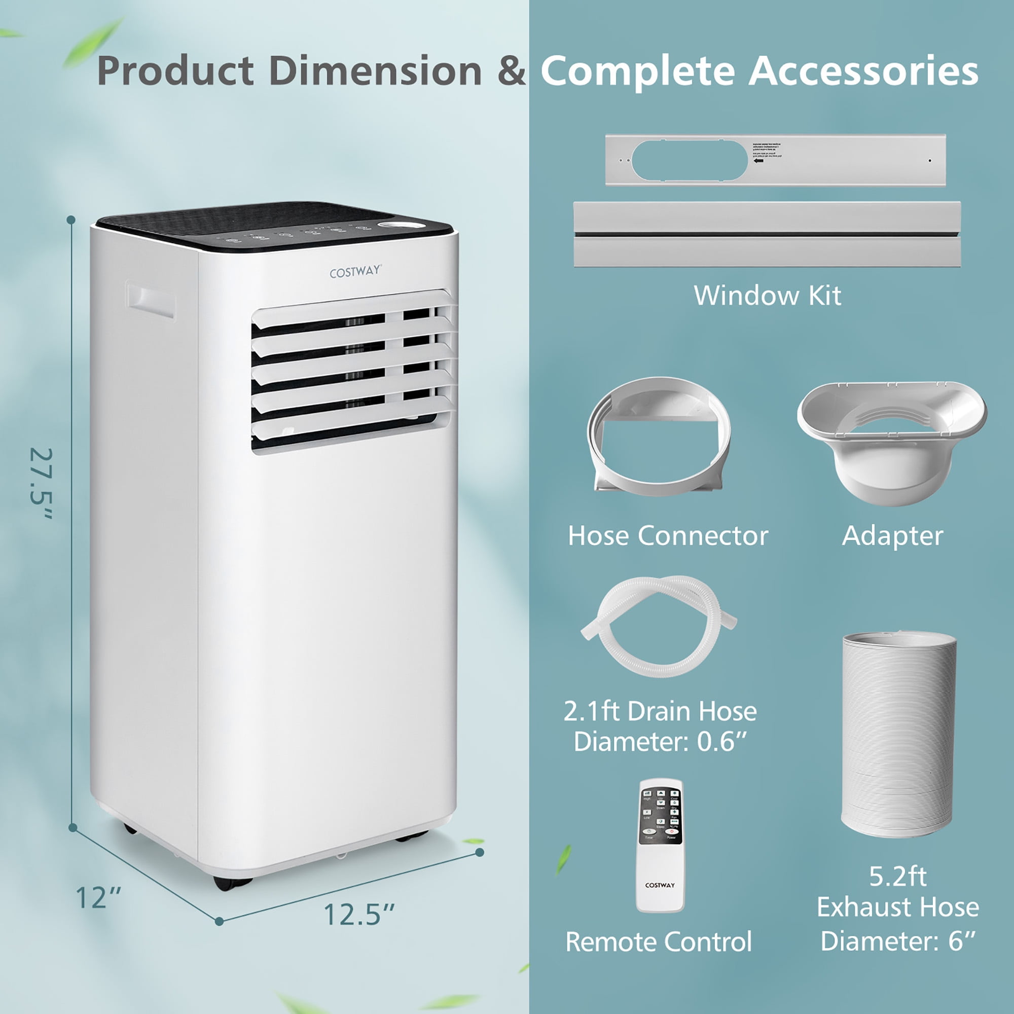 Enjoy a cool summer with this portable air conditioner! With a powerful 10000 BTU cooling capacity, this portable air conditioner is capable of cooling rooms up to 350 sq. ft, like the living room, dining room, bedroom, office, etc. This 3 in 1 air conditioner can be used as an air cooler, dehumidifier and fan to create a comfortable living environment for you. Additionally, to provide clean air flow, the AC is designed with a removable and washable filter. With the remote control, touch panel and digital display, you can adjust and check all the settings with ease. The 24-hour timer and quiet sleep mode can bring you a better sleep while saving energy. Moreover, the adjustable window kit fits various windows, including vertical sliding windows and horizontal sliding windows. Feature 3 in 1 design includes cooling, dehumidifying and fan 24H auto on/off timer offers convenience and saves energy Smart touch panel and remote control for easy operation Adjustable air flow direction: up/down manual swing 90° Low noise operation and sleep mode for a sweet sleep Adjustable temperature for customized comfort Easy to move with 4 wheels and built-in handles Removable & washable filter is easy to clean 2 speeds for you to choose from: high/ low Auto shut off when tank full Easy installation Specification Color: White Material: ABS Product Dimension: 12.5” x 12” x 27.5” (L x W x H) Cooling Capacity (ASHARE): 10000 BTU Cooling Capacity (SACC): 6000 BTU Amp: 7.8 A Air Flow Rate: 194 CFM Coverage: 350 sq.ft. Voltage: 115V/60Hz Dehumidifying Capacity: 51 Pints/Day Temperature Setting Range: 61℉~90℉ Noise Level: ≤55 dB Applicable Window Width/Height: 25.5”-47” Length of Exhaust Hose: 5.2 ft Diameter of Exhaust Hose: 6” Length of Drain Hose: 2.1 ft Diameter of Drain Hose: 0.6” Length of Power Cord: 5.9 ft Max Remote Control Distance: 16.5 ft Net Weight: 49.5 lbs Package Includes: 1 x Portable Air Conditioner 1 x Exhaust Hose 1 x Hose Connector 1 x Adapter 1 x Window Kit 1 x Drain Hose 1 x Remote Control 1 x User Guide