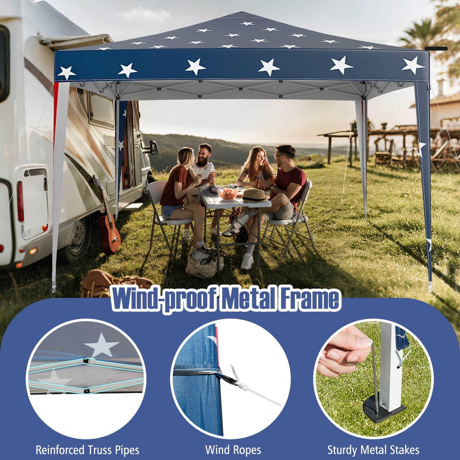 This attractive canopy shelter will offer a perfect shade solution for your outdoor space! Made of powder-coated steel and high-quality Oxford fabric, this canopy is sturdy and sturdy to withstand moderately severe weather. Equipped with four removable nets, it can protect you in the summer and make conversation more private. Featuring easy pop-up design and quick release button, this folding tent is easy to set up and take down. And the free carrying bag allows it easy to carry anywhere. Our canopy tent is ideal for camping, party and outdoor commercial events. Don’t hesitate to buy it! Feature Made of waterproof and sun-resistant Oxford fabric Powder-coated steel frame, rust and corrosion resistant Comes with ropes and ground nails for added stability Removable mesh walls, ventilated Easy to take down with a quick release button With a free tote bag for easy storage and transport Nice-looking American flag decoration pattern Ideal for parties, picnics, exhibitions or other outdoor activities Specification Material: 210D Ox ford Fabric + Steel + PP Size: 10’x 10’x 8.5′ (Lx Wx H) Net Weight: 25.5 lbs Package includes: 1x Canopy Tent 1x Carry Bag 1x Instruction
