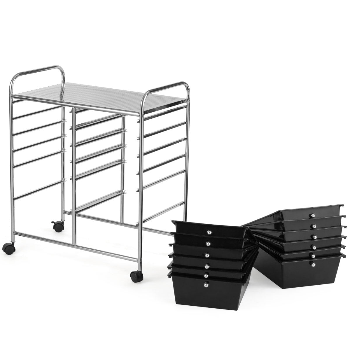 Do you want to have a storage cart which can be rolled smoothly from one place to another? Our 12-drawer rolling storage cart includes 4 bigger drawers and 8 smaller drawers, which provide enough storage space for you. Constructed of industrial-strength metal tubes and finished in chrome, the cart is sturdy toserve you for a long time. Equipped with easy-to-grab handles and 4 universal wheels, it is easy to move the lightweight cart. And 2 of the wheels have simple lock for stopping easily. With our practical cart, you can store various things from art and office supplies to clean or kitchen essentials.Itis Ideal to arrange your different stuff at office, home, school and garage or just about anywhere organization is needed. Feature 12 moveable drawers for storage, 4 big and 8 small drawers Metal frame and plastic drawers,sturdy andcan be used for long time 4 universal wheels(2 with lock) for easymovement and fixation Drawers slide through metal channels with noresistance Drawer with handle for easy closing and opening Easy to pull or push the cart with 2 handles on the top Ideal drawer storage cart for home, office, garageand school Drawers are easy to clean with soap and a damp cloth Easy to assemble in short time according to instruction Specification Color: Black Material: iron, plastic Overall size:25”x15”x29.5”(LxWxH) Inner Size of Big Drawer:13”x 10” x 4.5”(LxWx H) Inner Size of Small Drawer:13” x 10” x 2.5”(LxWx H) Diameter of wheel: 1.5” Weight of Cart: 13.5 lbs Maximum Weight of Top: 22lbs Maximum Weight of Large Drawer: 5.5lbs Maximum Weight of Small Drawer: 3lbs Package Include: 1 x 12 drawers rolling cart 1 x instruction