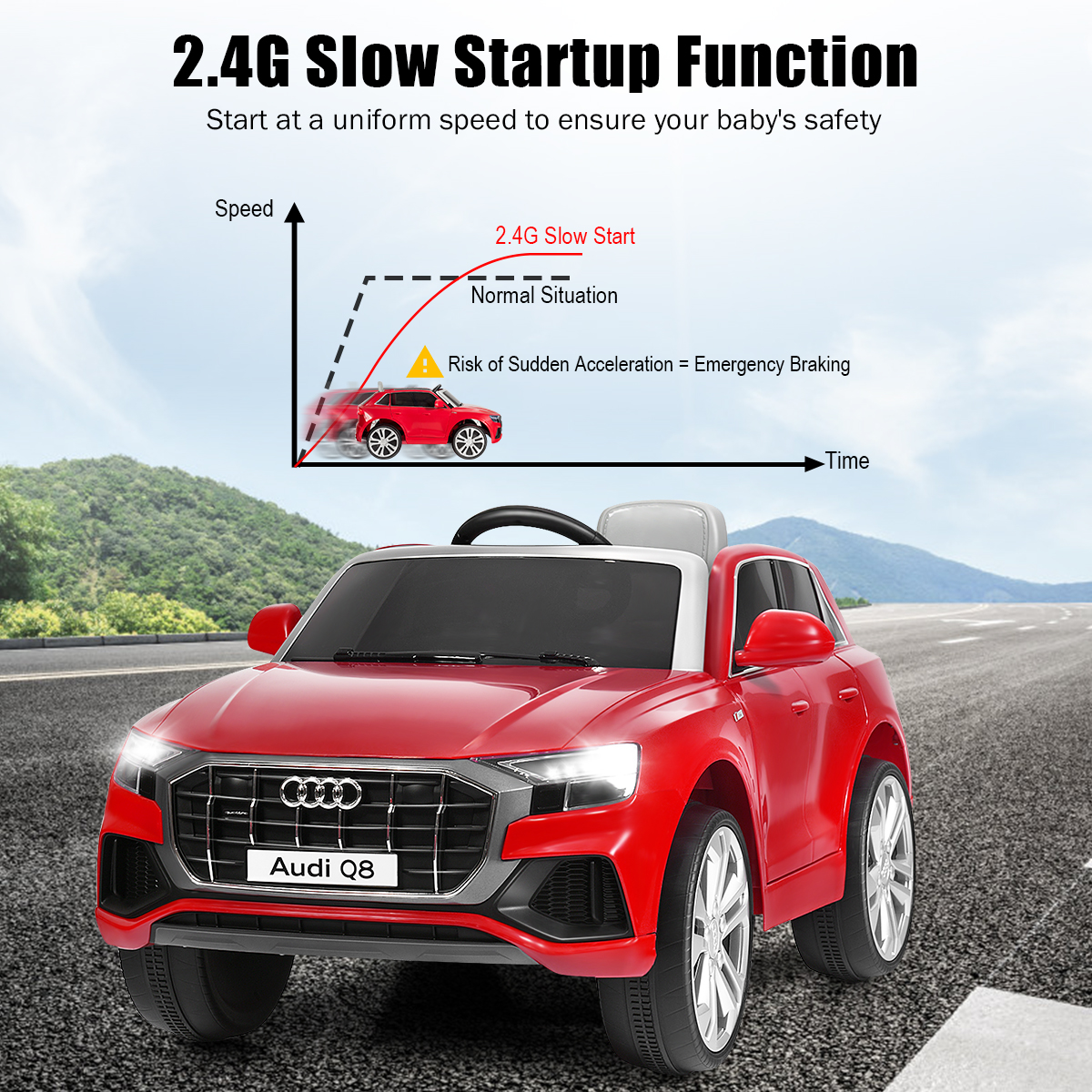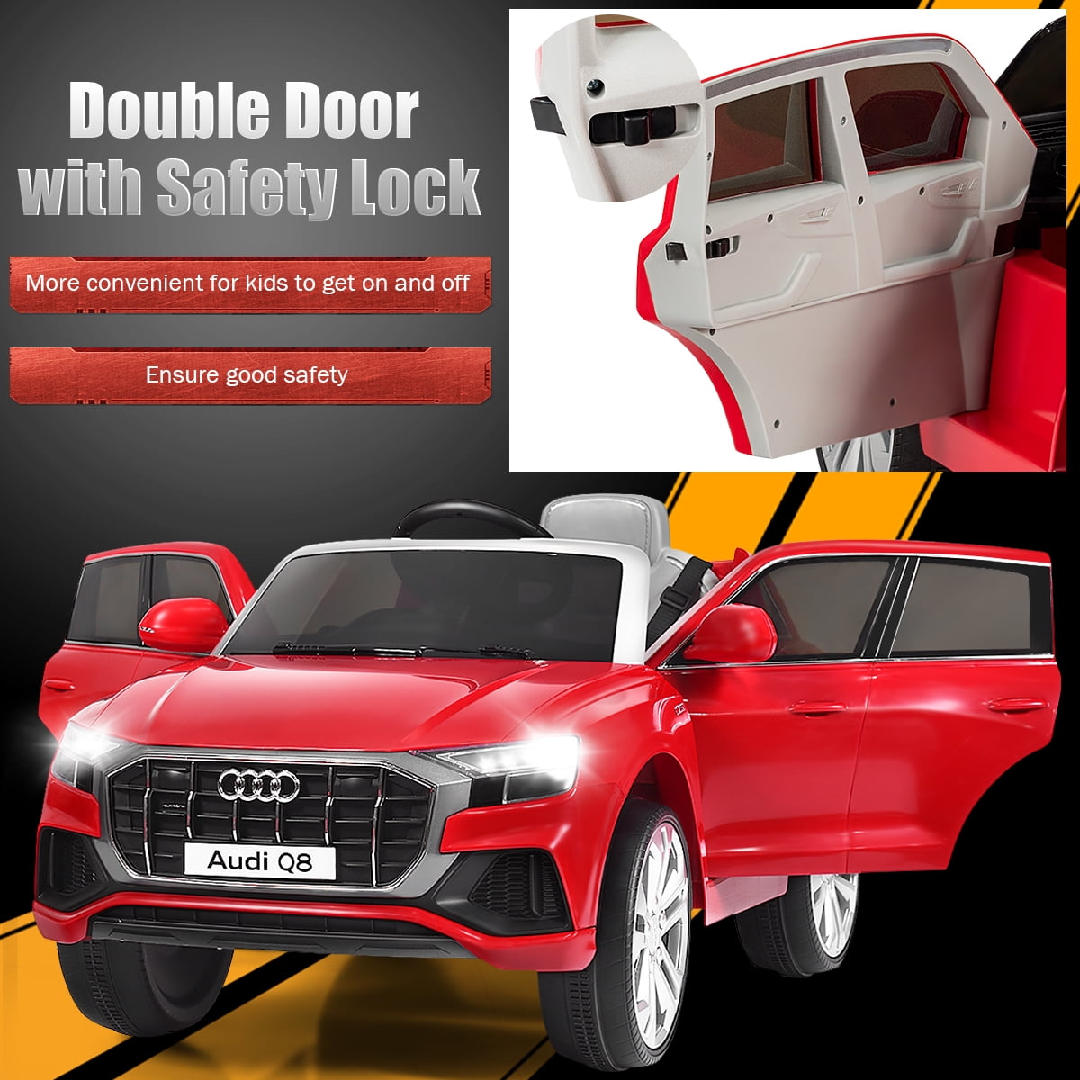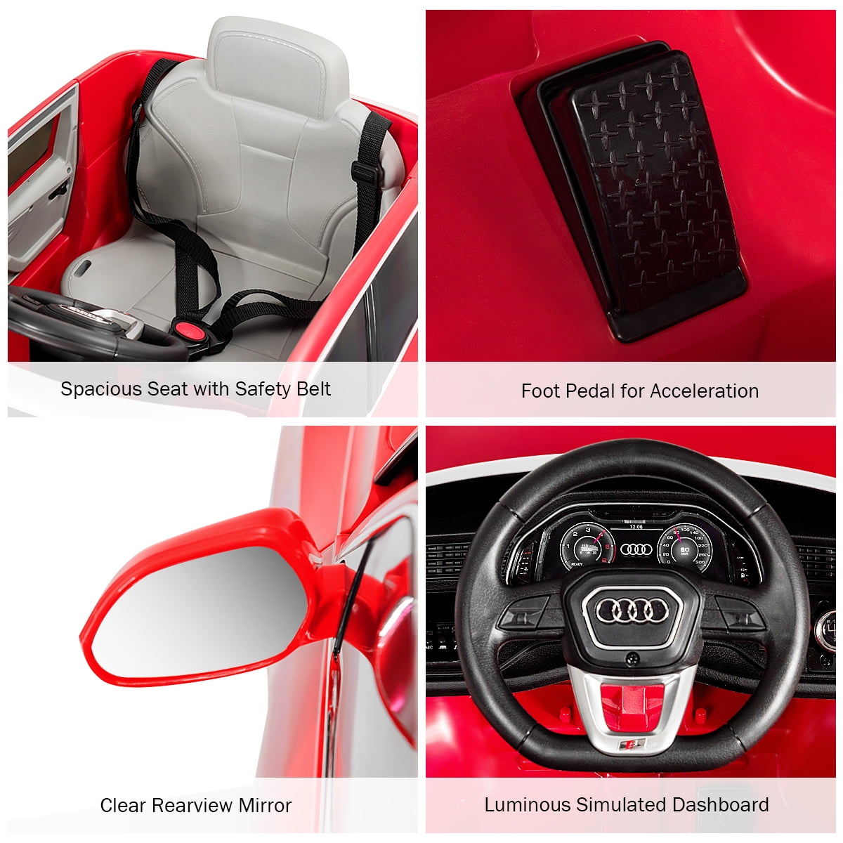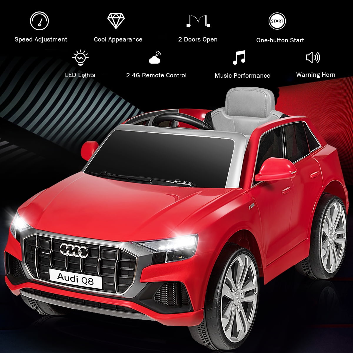 Are you bothered by your kids’ addiction to video games? Our ride on car is the perfect solution! This toy car is a small version of Audi Q8. Children can seat on the car to go for a ride, or parents control the car with 2.4G remote control. Spacious seat, operable pedal, forward/ reverse shifter, horn and steering wheel will give them wonderful and exciting driving experience. With slow startup design, wear-resistant wheels and belt, your little one will get the best protection. Kids can press the button to switch songs and listen stories, doubling their enjoyment. Feature This product is not for sale in California 12V Audi Q8 with specialized luxury appearance 2 powerful drive motors to reach 3-5 km/h speed Equipped with MP3 interface, USB port and TF card slot to connect external devices 2.4 G parental remote control mode (3 adjustable speeds) & battery operate mode (high/low speeds) Slow start function for gradual acceleration and reliable braking Spacious seat with safety belt for sitting and playing Bright LED lights, built-in music/ story function and horn sound to attract baby Shock-resistant rear wheels for long-time use Forward & reverse shifter and steering wheel for kids to operate easily Doors with safety lock to prevent kids from falling off the car One-button start design for enough convenience Comes with rechargeable battery and charger adapter Max weight capacity can reach 66 lbs Ideal for children aged 37-96 mo Specification Color: Red Material: PP + Iron Overall Dimensions: 42.5” x 25.5” x 21” (L x W x H) Net Weight: 33 lbs Weight Capacity: 66 lbs Speed: 3-5 km/h Charge Time: 8-12 hours Battery: 12V 4.5 AH Recommended for Ages: 37-96 months old Package Includes: 1 x Kids Ride On Car 1 x 2.4G Remote Control 1 x Charger 1 x MP3 Cable 1 x Instruction