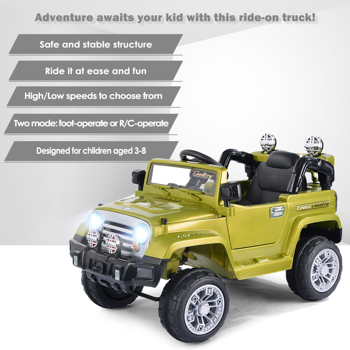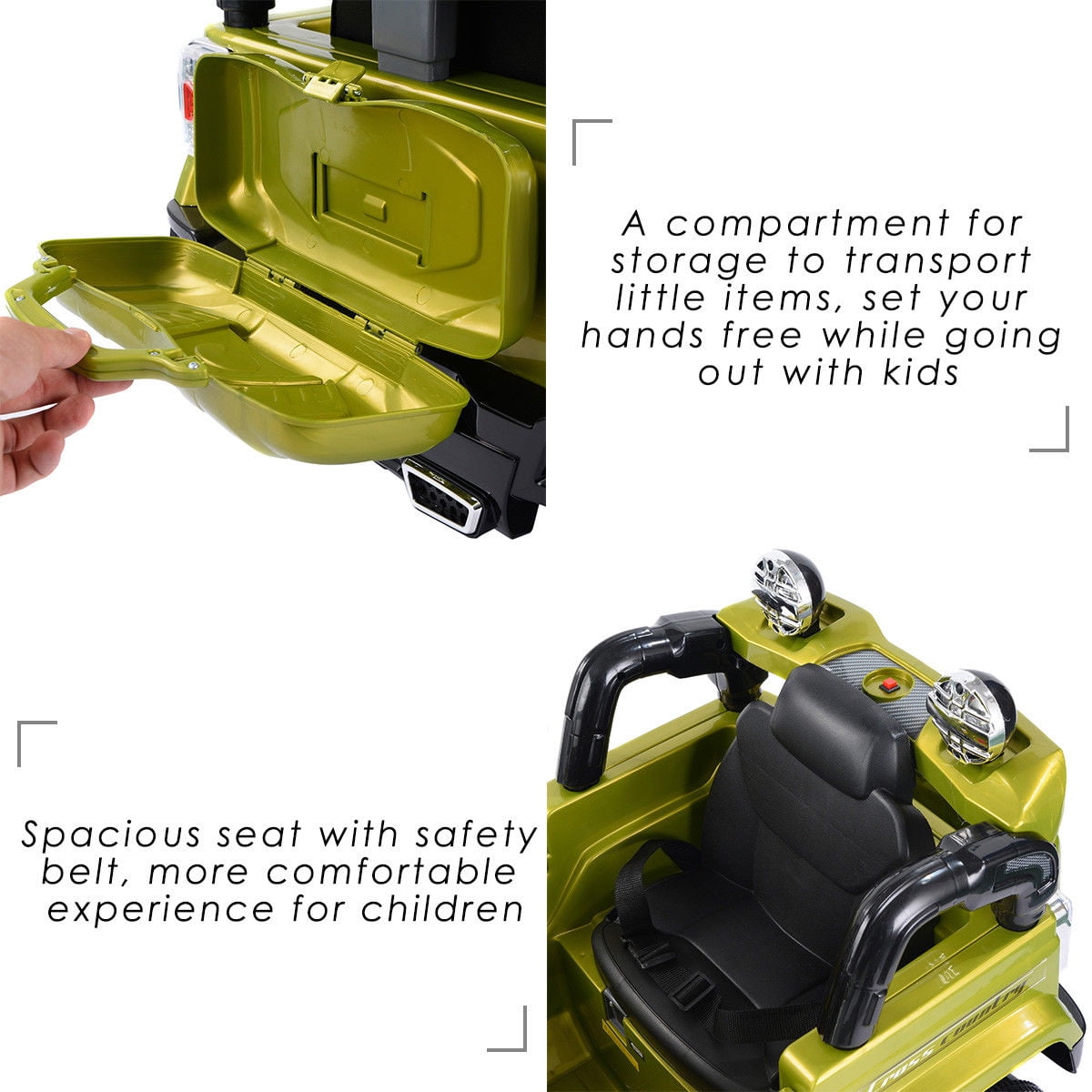 This Is Our Fantastic And Functional BABY RIDE ON Truck For Your Lovely Children. It is Beautiful Working Lights And movable wing mirrors Add To The Sense Of Being In A Real Car While The Comfortable Seat And MP3 Aux Provide An Enjoyable Environment For Your Babies When Playing. This Is A Perfect Gift For Your Kids! And The Fun Part Is – When Needed You Could Control It Too! Suitable For Child With Age From 37 To 96 Monthes Feature Drives On Flat Surfaces Designed for children aged 3-8 Safe and stable structure, ride it at ease and fun Adventure awaits your kid with this ride-on truck Battery Operated, Continuous Fun For More than 1 Hours With Parental Remote Control & MP3 Input Comfortable Seat With Safety Belt With Horn & Movable Wing Mirrors Working Headlights High/Low speeds to choose from Two Mode: foot-operate or R/C-operate Front and rear lights, cool and extraordinary Can be driven by kids or operated by parents with remote control A compartment for storage to transport little items, sent your hands free while going out with kids Spacious seat with safety belt, more comfortable experience for children Specification Main Material:Plastic Size:43” x24” x25”(L xW xH) Weight:about 34 Lbs Carrying Capacity:66 Lbs Ambient Temperature:0-40 degree centigrade Speed:3 km/h- 5km/h Battery:6V 4AH *2 Suitable For Child With Age From 37 To 96 Monthes Carrying Capacity:66 Lbs Charging Period:8-12 Hours Each Time Charger:12V 1000MA Charging Period:8-12 Hours Each Time Motor:12V *2 Package includes: 1 x kids ride on car 1 x remote control 1 x charger 2 x Rechargeable Battery 2 x motors 1 x instruction manual
