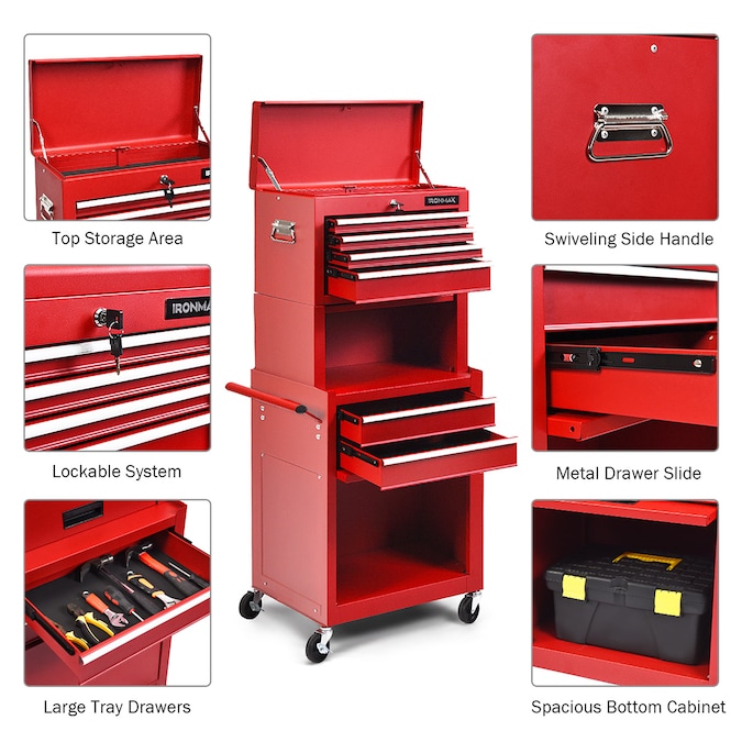 Upgraded with a riser, help you store and get tools conveniently during working;consist of top box, riser and bottom cabinet, all in one, provide ample storage space;different storage space, allow for classified tool storage according to the size of tools;the top box, detachable, lockable and portable, multi functional for your daily use;liner inside can protect tools from scratching and corrosion;premium cold-rolled steel, sturdy, solid and durable, for longer life span;stable structure, large capacity, hold as many tool as possible;frosted surface features superior metallic texture;4 universal casters and 2 of them are lockable, combine mobility with security;single-sided handle enable you to control the rolling tool cart easily;ball-bearing drawer slides, smooth slide doors, easy to open and close;removable hooks on sides enable you to hang some tools for an easy access;color: red;material: steel;top box dimension: 20 x 10 x13.5 inch(L x W x H);bottom cabinet dimension: 23.5 x 13 x 26 inch(L x W x H);overall dimension: 23.5 x 13 x 52 inch(L x W x H);handle length: 12.5 inch;net weight: 60.5 lbs;weight capacity of each drawer: 22 lbs;weight capacity: 200 lbs;Package includes:1 x 3-in-1 tool chest;1 x user manual.