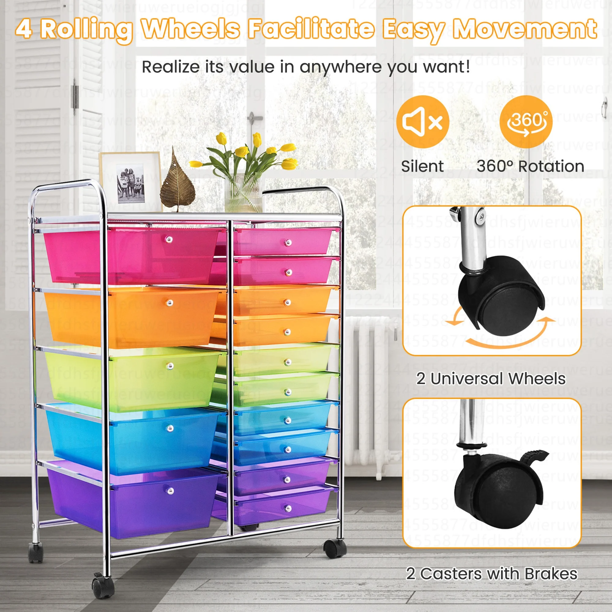 Costway 15 Drawer Rolling Storage Cart Tools Scrapbook Paper Office School Organizer Colorful
