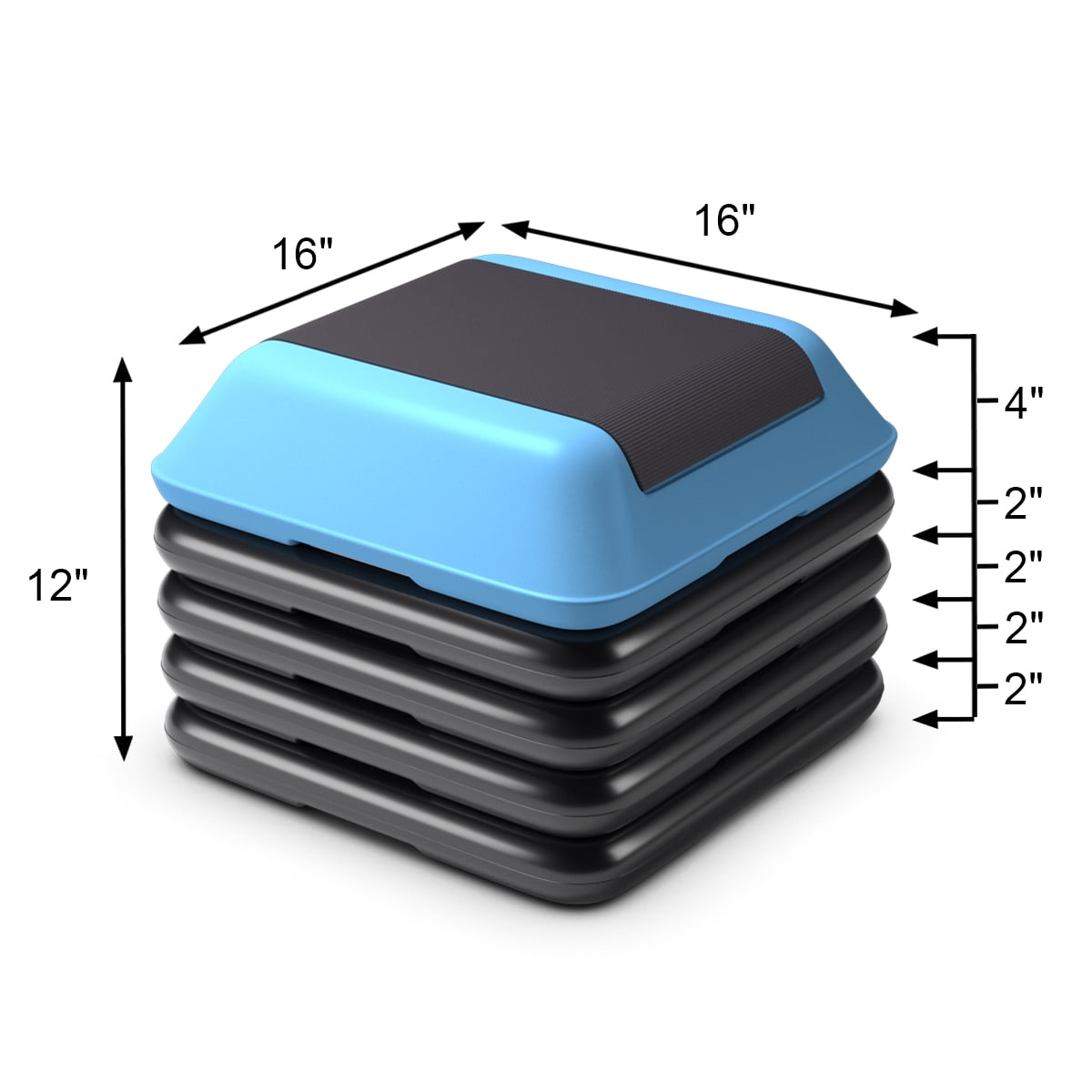 Adjustable height from 4” to 6” to 8” to 10” to 12” Lightweight and easy to carry and assemble With non-slip surface PVC to keep safe Max weight capacity can reach 550lbs Overall Dimensions:16” X 16” X12”(LxWxH)