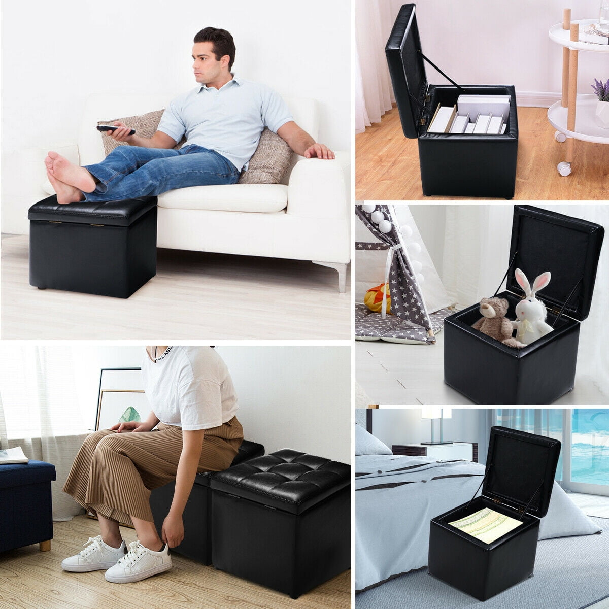 This is our storage ottoman, which is really ideal for storing and organizing your toys, blanket, books and gaming accessories, etc. It is covered with durable faux leather and constructed with a sturdy wood frame. It will really makes stores easily beside closets, drawers or beds and sofas. It will add a touch of elegance to your home whilst providing a stylish storage solution.If you are looking one ,do not hesitant to buy it from us! Feature High quality Simple cube Faux Leather Ottoman Pouffe Storage Box Functional design with Hinge Top Cushioned top seat for delicate and comfortable seat Ideal for storing and organizing your toys, blanket, books and daily accessories, etc Specification Color:Black Material:PU leather, wood frame and sponge weight Capacity:330Lbs Size of Cube:16” x 16” x 16”(L x W x H) Package include: 1 x storage ottoman