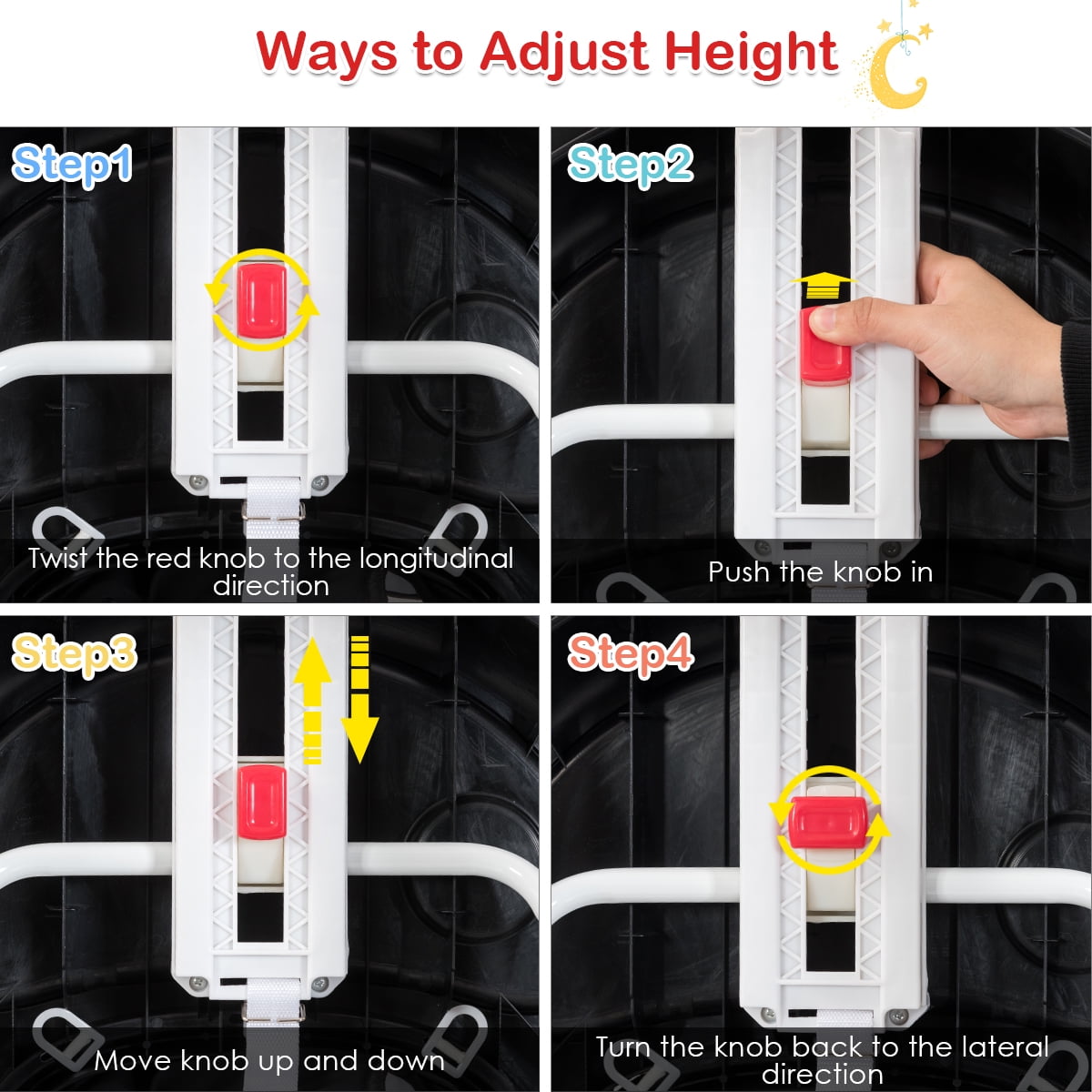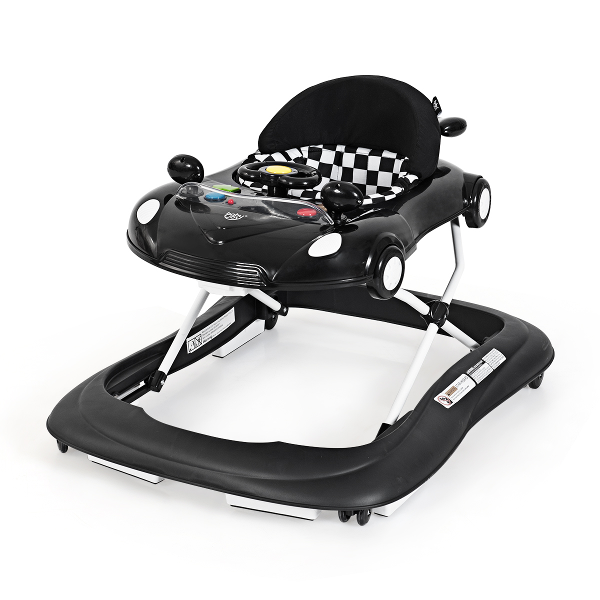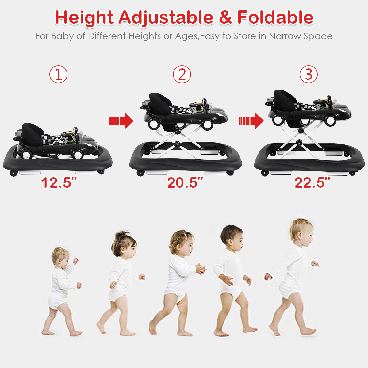 Pay attention to the healthy growth of baby. There are two heights available to adjust according your baby’s age. The top steering wheel is rotatable with a horn. Push the bottom at two sides then you will hear lovely music. The volume is controllable to prevent hearing damage. Feature Height adjustable design fits baby in different ages and heights Simulated sound effect and rotatable steering wheel Adjustable volume protects children’s hearing Damping rear wheel prevents over speeding “driving” 6 antiskid devices avoid rolling over while sliding on slopes Can be stored in narrow spaces with foldable design Easy to clean up with cushion of detachable design Specification Color: Black Material: PP, Peach Skin, Expansion Size: 31” x 25.5” x (12.5”-22.5”) (L x W x H) Weight Capacity: 26.5lbs Applicable Age: 6-18 Months Net Weight: 10lbs Package Includes 1 x Baby Walker 1 x User Guide