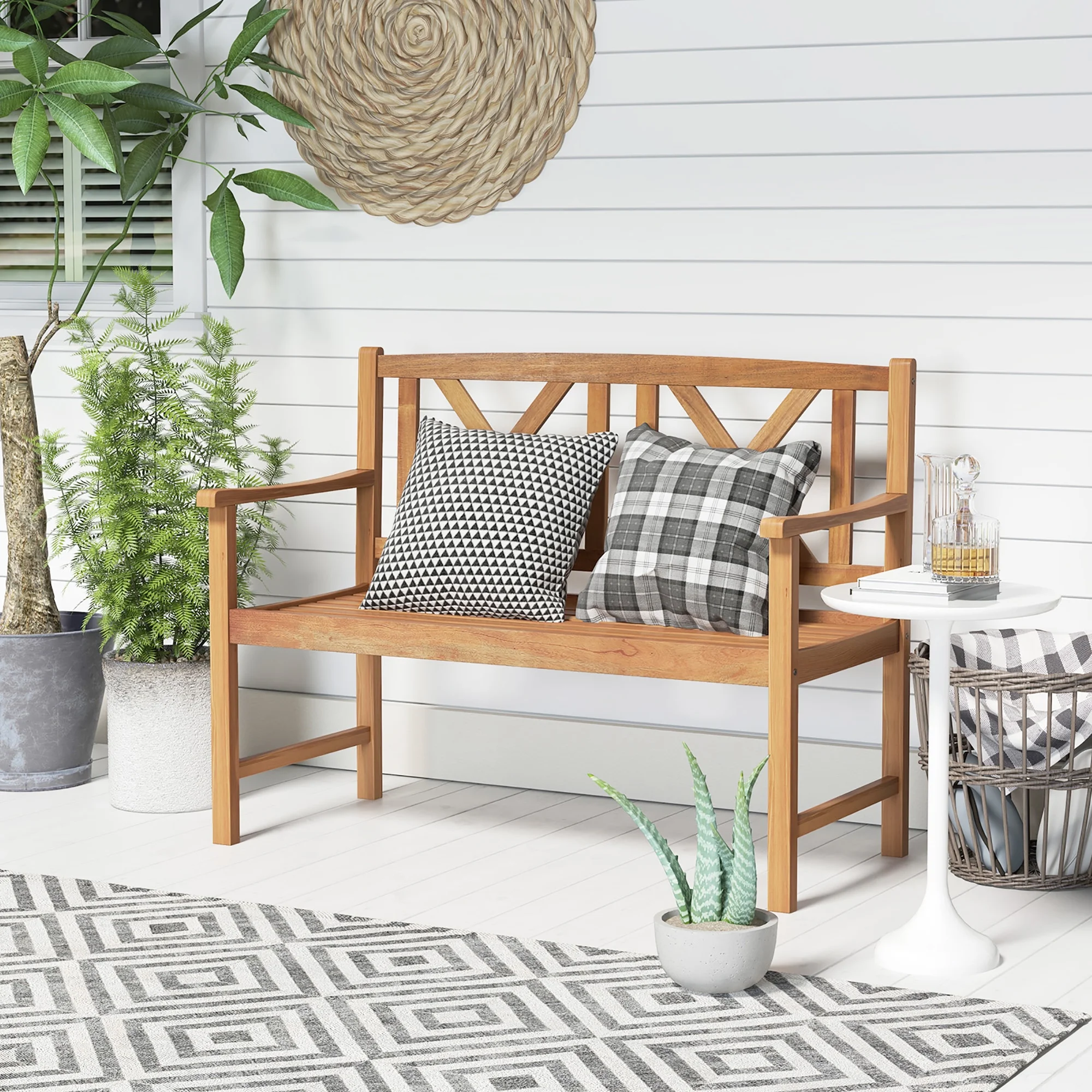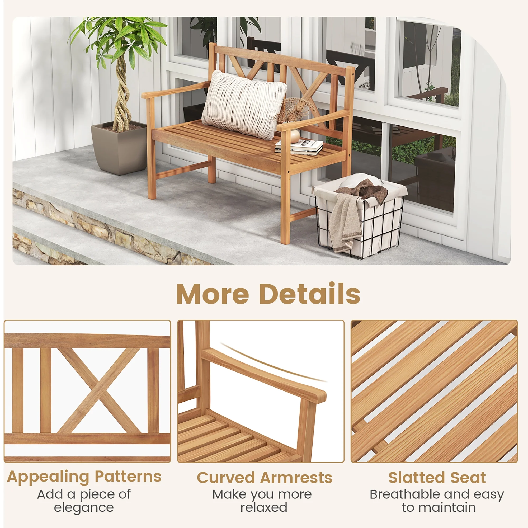 Cozy 2-Person Bench: With 44” x 18.5” (L x W) spacious seat, this patio bench allows 2 adults to sit together. Designed with curved armrests, the bench will make you more relaxed. And the slatted seat is breathable to sit and easy to maintain. Selected Acacia Wood: The loveseat bench is constructed of top-grade acacia wood, which is natural, well crafted, abrasion resistant and sturdy. Therefore, the thoughtful material selection ensures prolonged serving time. Heavy-Duty Wood Structure: The solid and sturdy acacia wood frame of the bench also ensures high stability. Moreover, the bottom crossbars on the two sides strengthen the overall structure. The whole bench features strong load capacity which is up to 800 lbs. Ideal Outdoor Addition: With appealing patterns on the backrest, the patio bench adds a piece of elegance to the surroundings. It will be a perfect addition to garden, backyard, patio, front porch and so on. Note: please avoid rain exposure for longer service life. About Installation: The clear instruction and complete hardware are provided for correct and efficient assembly. Please do not tighten all the screws until all the holes are aligned. Dimension of bench: 47.5”x 22” x 34” (L x W x H). Seat height: 17.5”.