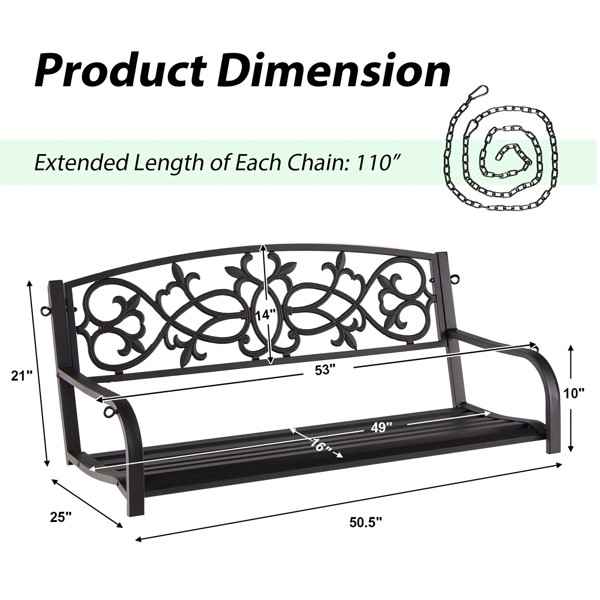 Solid Metal Structure: Made of high-strength metal pipes, the main frame of the porch swing bench is not easy to deform or bend. Furthermore, the entire surface of the swing bench is sprayed with plastic treatment, effectively avoiding rust and highly prolonging the service life in outdoor occasions. Safe Swing Bench: The thickened metal chainsare securely connected to the swing bench, ensuring high-level stability and safety. And each sturdy chain measures 110”, which is much longer than others. The entire metal patio swing bench has a weight capacity of up to 485 lbs, allowing you to enjoy outdoor leisure time with your best friend. Comfortable & Spacious Seat: The 49-inch-wide seat can fully accommodate two people, and thus you can have fun swinging with your friend. The curved armrests and slatted seat are ergonomically designed to bring you the ultimately comfortable swinging experience. And the wide backrest, on the other hand, allows you to relax and lean back to relieve your fatigue. Elegant Design & Wide Application: The backrest of this metal swing bench is designed with hollow-carved elegant patterns, which creates a classical atmosphere and can be integrated with multiple occasions of different styles. This uniquely designed swing bench is perfect for many places, such as backyard, park, balcony and front porch. Quick & Easy Assembly: All accessories and hardware are included in the package. And the easy-to-follow instruction will help you correctly finish the assembly. Moreover, the functional carabiners and screw-in eye bolts included make it much simpler to hang this porch swing.