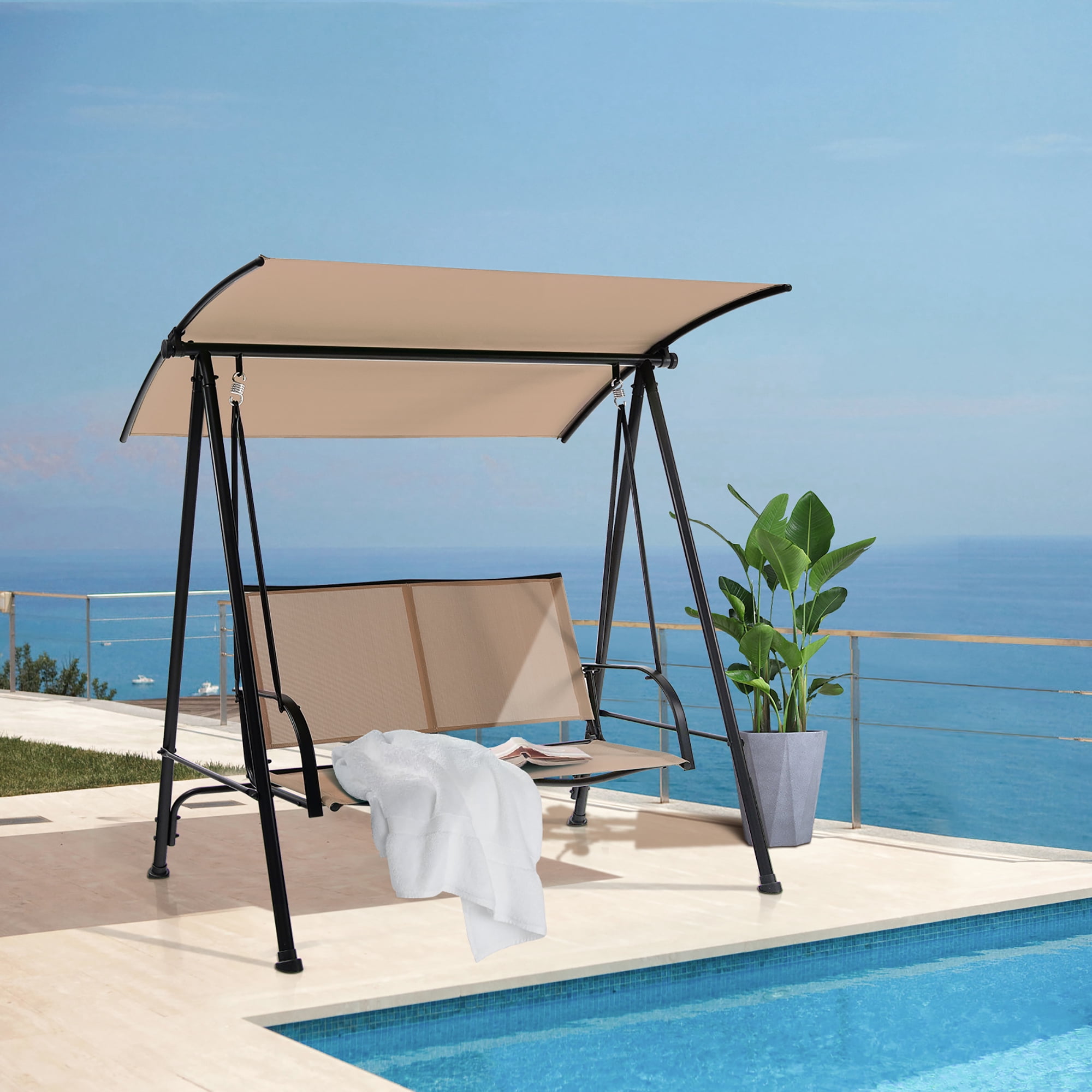 Costway 2-Seat Patio Swing Porch Swing with Adjustable Canopy for Garden Dark Beige