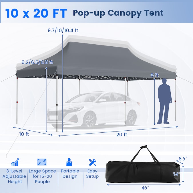 - Thanks to the hassle-free pop-up design, setting up and taking down this outdoor instant shelter is a breeze, no tools are required, additionally, it boasts a 3-level adjustable height (9.7/10.1/10.4 ft, ), providing flexibility to customize the canopy to the desired height and create an ideal outdoor space for any occasion.