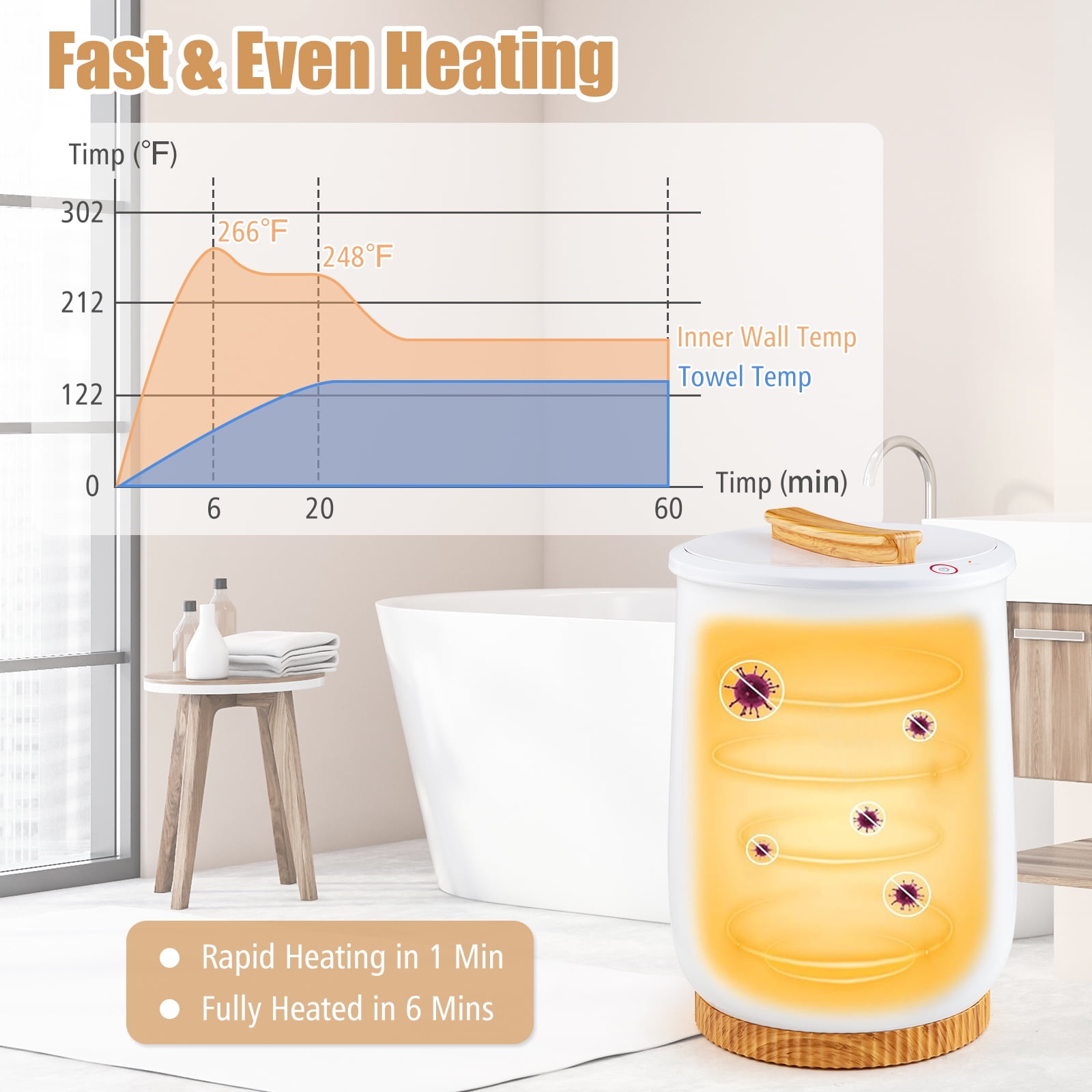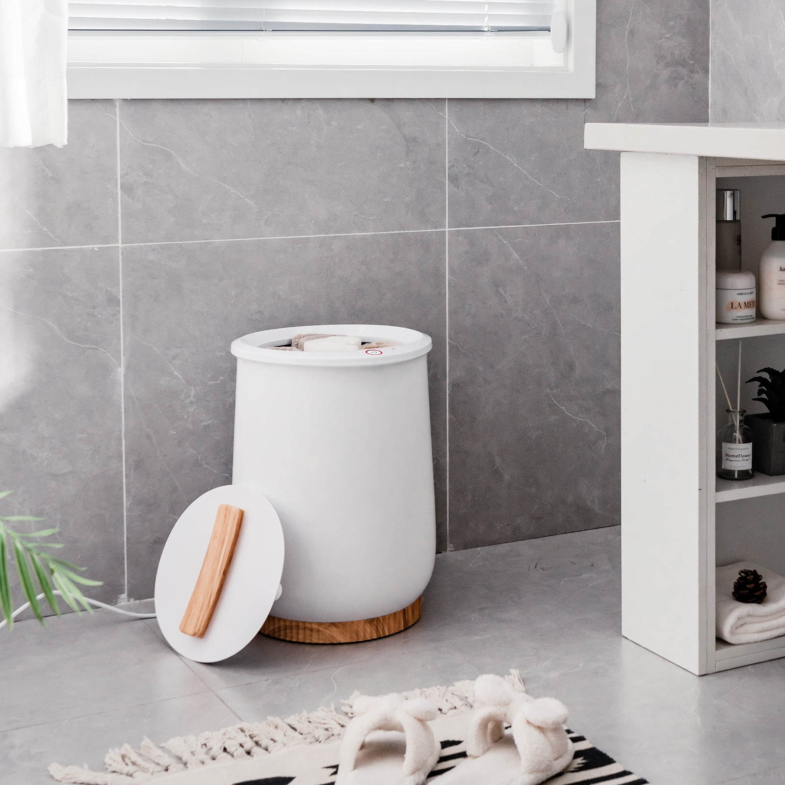 20L Large Capacity: The towel warmer bucket provides ample space to accommodate two 40″ x 70″ oversized towels, a blanket or a pajama at once, giving you the luxury of a warm towel. Please note that it can only hold dry items. Fast & Even Heating: With its powerful heating element, this towel warmer boasts rapid heating in 1 min and can be fully heated in 6 mins. Plus, the dual thermostat design can effectively keep the towel temp at a constant level. Ultimate Convenience: With one-button control and 60-min auto off design, the towel heater offers hassle-free operation for all users. In addition, there’s a hot surface indicator to inform you of high temp. Do not touch the surface when the light is on. Safety is Priority: Crafted with a double-layer insulation structure, this hot towel bucket is designed for safe use. It also features built-in safety mechanisms to prevent overheating and overloading, ensuring reliable performance. Thoughtful Details & Versatile Use: With built-in fragrance disc, the bath towel warmer allows you to enjoy warmth and fragrance every day. Together with its compact size, the bucket is an ideal choice for bathroom, hot tubs, spas and salons.