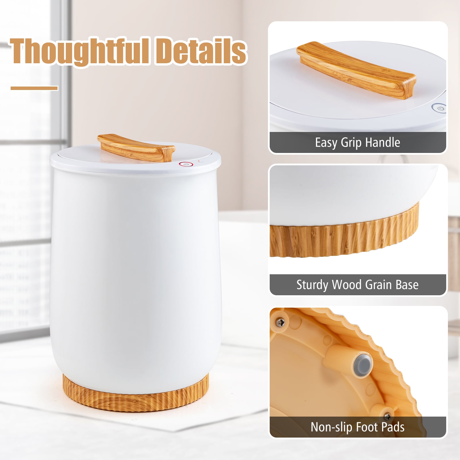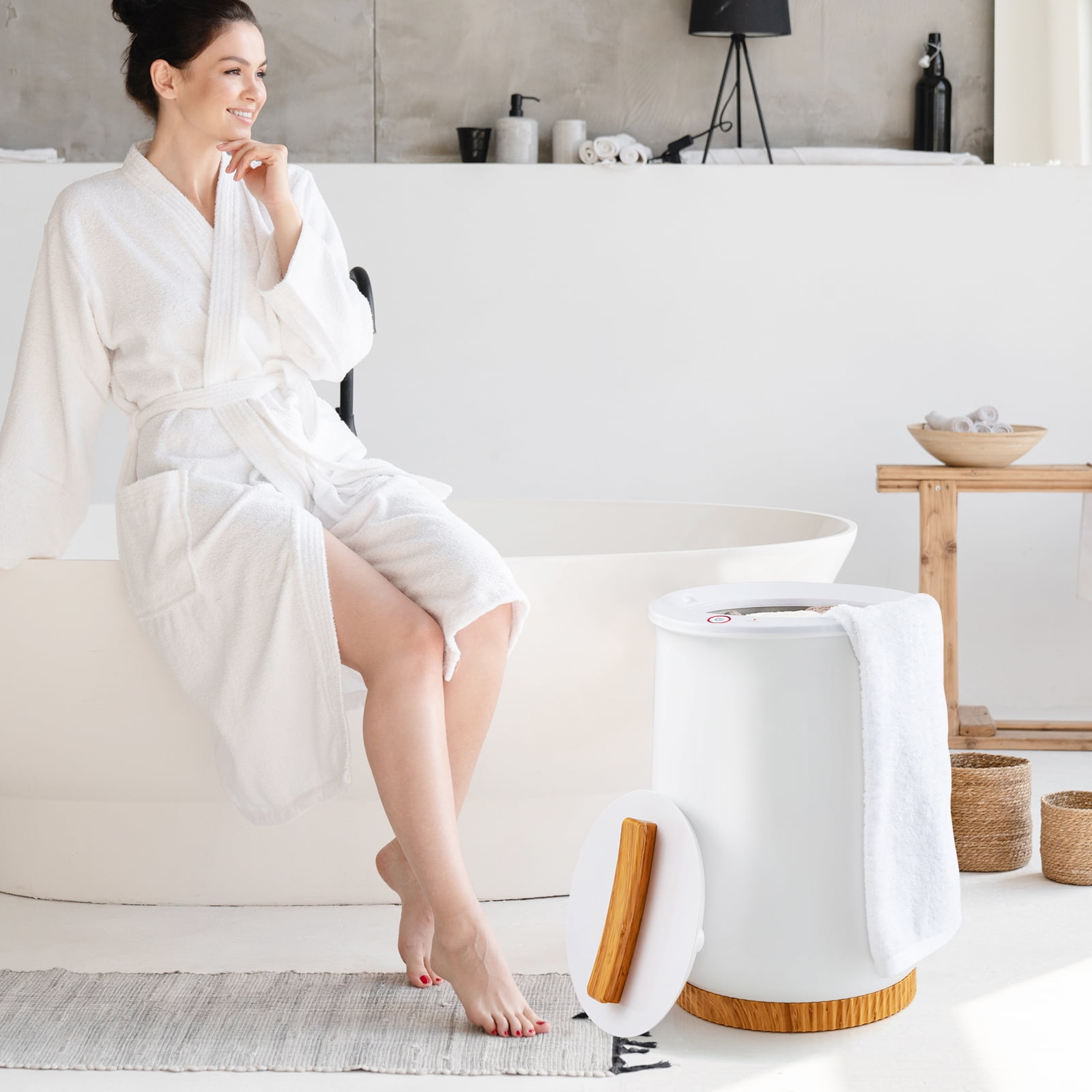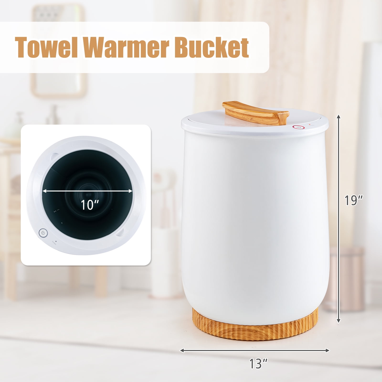 Experience ultimate warmth and luxury with our 20L towel warmer bucket! With generous capacity, the towel bucket can effortlessly accommodate dry towels and blankets, offering the ideal warmth in cold winter days. Designed for safe & convenient use, the towel heater is equipped with powerful heating elements and thermostat system. There’s only one control button, making operation a real breeze. You can use with confidence as the towel warmer is designed with 60-min auto off and over load protection. You can also add your favorite aroma tablet (NOT included) to eliminate odors and keep the towels fresh. Plus, with the sturdy wood grain base and non-slip foot pads, our hot towel warmer is an absolute must-have for bathrooms, hot tubs, and spas. Get yours now and indulge in the lap of luxury. Feature Large capacity buckets holds towels, PJ’s, or blankets to meet your needs Efficient heating system gives you ideal warmth as soon as possible Intuitive dual thermostats to prevent over heating and keep a constant temp Auto shut-off and over-load protection for safety concerns Only one control button for ultimate convenient use Easy grip handle allows you to easily open the lid and fetch the towel With built-in fragrance disc for customized fragrance Compact and sturdy for multi-scene use Specification Color: White + Natural Material: PP, Galvanized Metal, Plastic Overall Dimensions: 13″ x 19″ (Dia. x H) Interior Diameter: 10″ Rated Voltage: 120V/60Hz Max. Power: 450W Capacity: 20L Max. Inner Wall Temp: 266℉ Net Weight: 7 lbs Note: For dry items ONLY! Package Includes: 1 x Towel Warmer Bucket 1 x Instruction