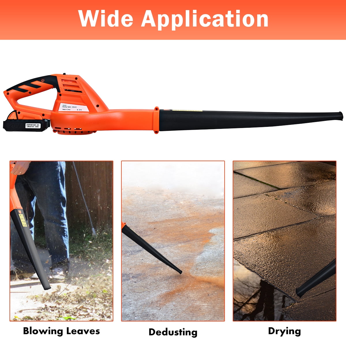 Do you have trouble clearing dust from dead spots? This lithium battery powered leaf blower is designed to solve this problem. With air speed of 130 mph and 90 cfm air volume, it can easily clear dust from hard surface like driveways, decks, garages, and especially hard-to-reach areas. After charging for 80 minutes, this leaf blower has an extremely long standby time, up to 25 minutes, which can help you finish a lot of clearing work. Except for that, ergonomic design ensures that long-term use will not make you feel tired. Don’t miss our lithium battery powered leaf blower to keep your patio tidy and clean. Feature Made of high quality PP material, lightweight and sturdy ETL certified 20V, 2.0Ah Lithium-ion battery pack High performance with 130mph, suitable for many occasions Low noise levels and smooth operation, 90 cfm air volume Handle conforming to ergonomic design, comfortable and easy to use Perfect for clearing debris, leaves and sticks Suitable for driveways, decks, garage, courtyard, garden and patios Specification Color: Orange Material: Polypropylene Voltage: 20V Overall Length: 35.5” Net Weight: 4 lbs Maximum Speed: 130 Miles per Hour Air Volume: 90 Cubic Feet per Minute Charge Time: 80 Minutes Run Time: 25 Minutes Battery Capacity: 2.0Ah Power Source: Battery-Powered Are Batteries Required: Yes Batteries are Included:Yes Package Includes: 1 x Leaf Blower 1 x 20V Lithium-Ion Battery Package 1 x Charger 1 x Instruction