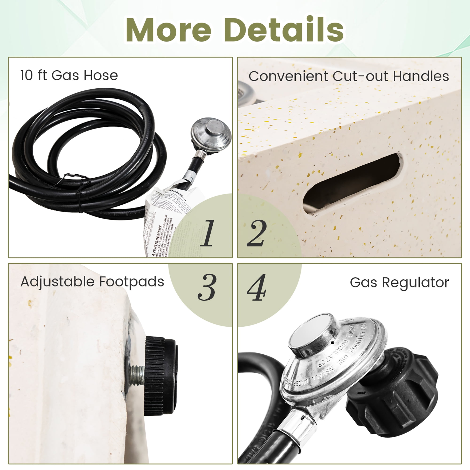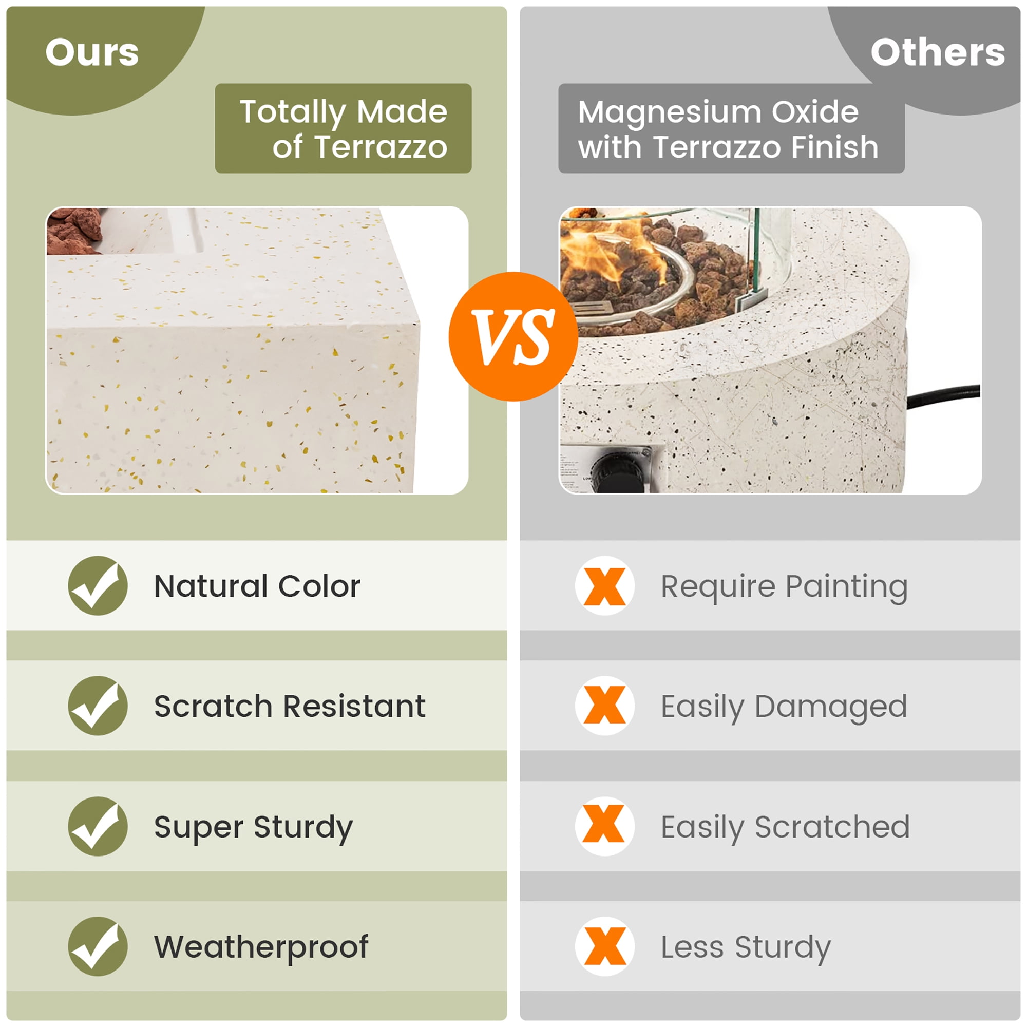High-Efficiency Heating: This patio fire pit table features 40,000 BTU heat output, providing endless warmness for you. The lava rocks are included and adds more elegance to the burning fire. Therefore, you can enjoy warmness and appealing dancing flames at the same in outdoor places. Premium Ignition System: The convenient ignition system makes it much easier to ignite and adjust the flame size. You just need push the ignition button and then push and turn the control knob for ignition. Also, the fire pit table has gained CSA certification, so you can use it at ease. Top-Grade Material: The main body of fire table is totally made of selected terrazzo. Different from others made of Magnesium Oxide which will be easily damaged or scratched, this terrazzo fire table is much sturdier and scratch resistant, and features natural color. Apart from that, the stainless steel burner in the middle also ensures long-time usage. Functional PVC Cover: Coming with a PVC cover which resists to water and heavy sunlight, the fire table can be left outside whether it’s rainy or sunny. Note: Please do not use the cover until the burner has cooled down. No Assembly Needs: The fire table will be fully assembled before delivery, so you can directly use it after arrival. The clear instruction will help you correctly connect the gas tank to the fire table. And a tank seat with fixing knob is included in the package, which suits for 20 lbs standard gas tank.
