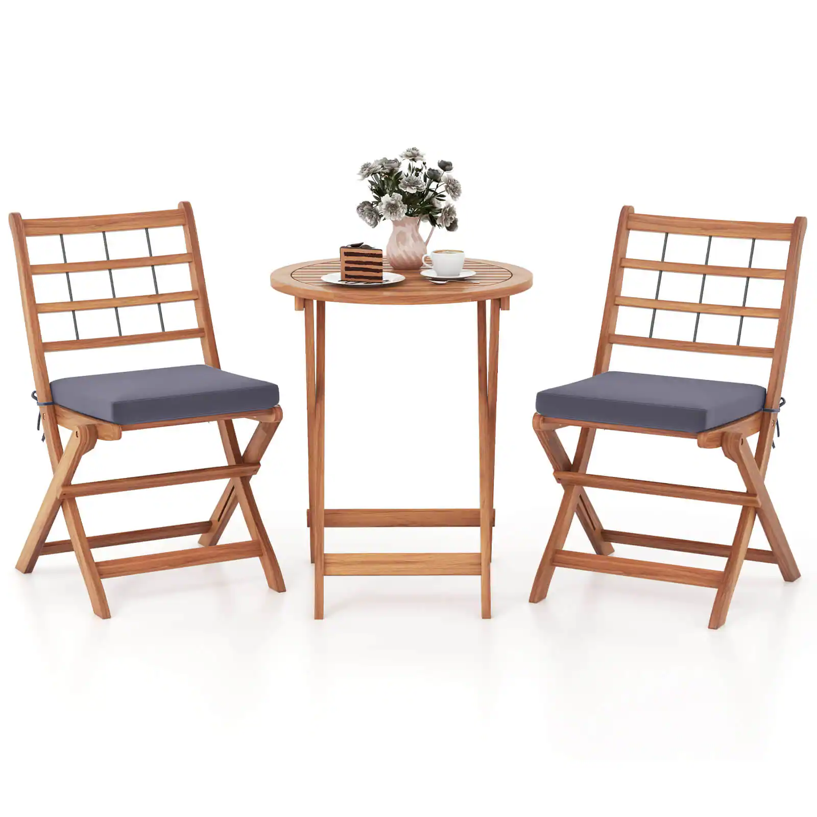 Carefully made of fade-resistant and sun-protective mix brown PE rattan, as well as solid acacia wood with reinforced triangular structure, this outdoor furniture folding table and chair set not only stands the test of time but ensures strong stability.