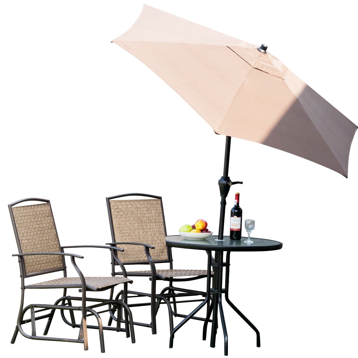 Do you want to have a rocking chair to sit on and enjoy sunshine? Our rocking chair is a good choice for you. Made of fabric and heavy iron construction, it is sturdy and sturdy to serve you for long time. The slightly sloping back and armrest will provide comfortable sitting experience. You can relax yourself by sleeping or napping on the chair. With slowly and gently swing, the chair will bring you fantastic feeling. In addition, you don’t need to worry about slipping or moving of the chair because there are four pads at the bottom. And the rocking chair is perfect to be placed in your outdoor space such as garden, patio and backyard. It is a great rocking chair you can’t miss. Feature Wrought iron and powder-coated frame ensures sturdiness and sturdyness Armrests and little sloping backrest provide comfortable experience 4 pads at the bottom prevent slipping and protect ground Premium fabric of seat and back is breathable and not easy to tear Good choice for relaxing, sleeping and entertaining Perfect to be placed in deck, patio, garden, backyard and backyard Simple assemble need and all the hardware included Specification Material: fabric, iron Color: brown Dimension of Chair: 23” x 27.5” x 37” (L x W x H) Height of Seat: 17” Height of Armrest: 24.5” Weight of Chair: 17.6 lbs Weight Capacity: 330 lbs Package Include: Rocking chair x 2 Instruction x 1