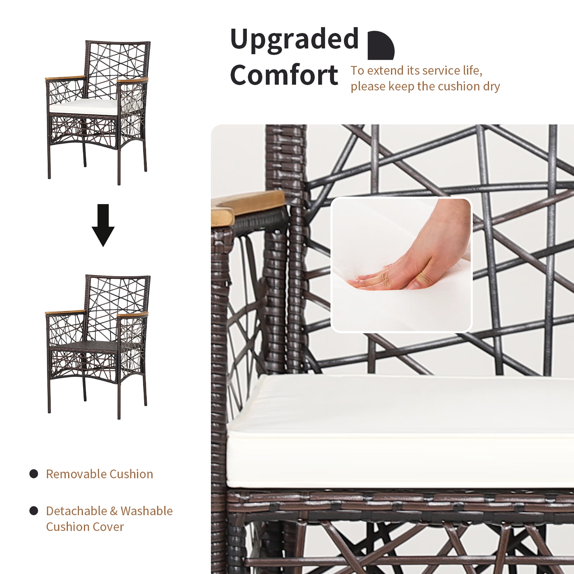 sturdy Design & Sturdy Structure: Covered with weather resistant PE rattan, these outdoor dining chairs are not afraid of different weather conditions, such as sunny, rainy and snowy so that you place them outside without worry. Likewise, the anti-rust steel frame ensures great stability up to 350 lbs for each chair. Upgraded Comfort for Ergonomics: When you sit on them, these patio bistro chairs can provide ultimate coziness. First, they are good for breathability with hollow backrests for summer use. And they support your arms cozily with selected acacia wood armrests that are exquisite workmanship. Besides, the 2 chairs bring comfy sitting experience with wide seats. Soft and Removable Cushions: The 2 soft padded cushions can be removed based on your preference. Hence, these chairs will be the perfect choice for hot summer and cool autumn. In addition, the detachable and washable cushion covers make maintenance easier. To extend the service life, please keep the cushions dry. Widely Use in Different Places: Designed with appropriate heights, these outdoor armchairs are able to match with different types of tables, such as coffee tables, dining tables and firepit tables (not included). Therefore, these outdoor dining chairs will not be restricted by patio, poolside, backyard and other outdoor places. Simple Installation: The clear instruction and necessary accessories are included for easy assembly. Please do not tighten all the screws until all the holes are aligned. And the well-made details ensure the durability. Overall dimension of each chair: 24” x 23” x 35” (L x W x H). Please refer to the size description before purchase (there may be small dimensional discrepancies because of the manual measurement).