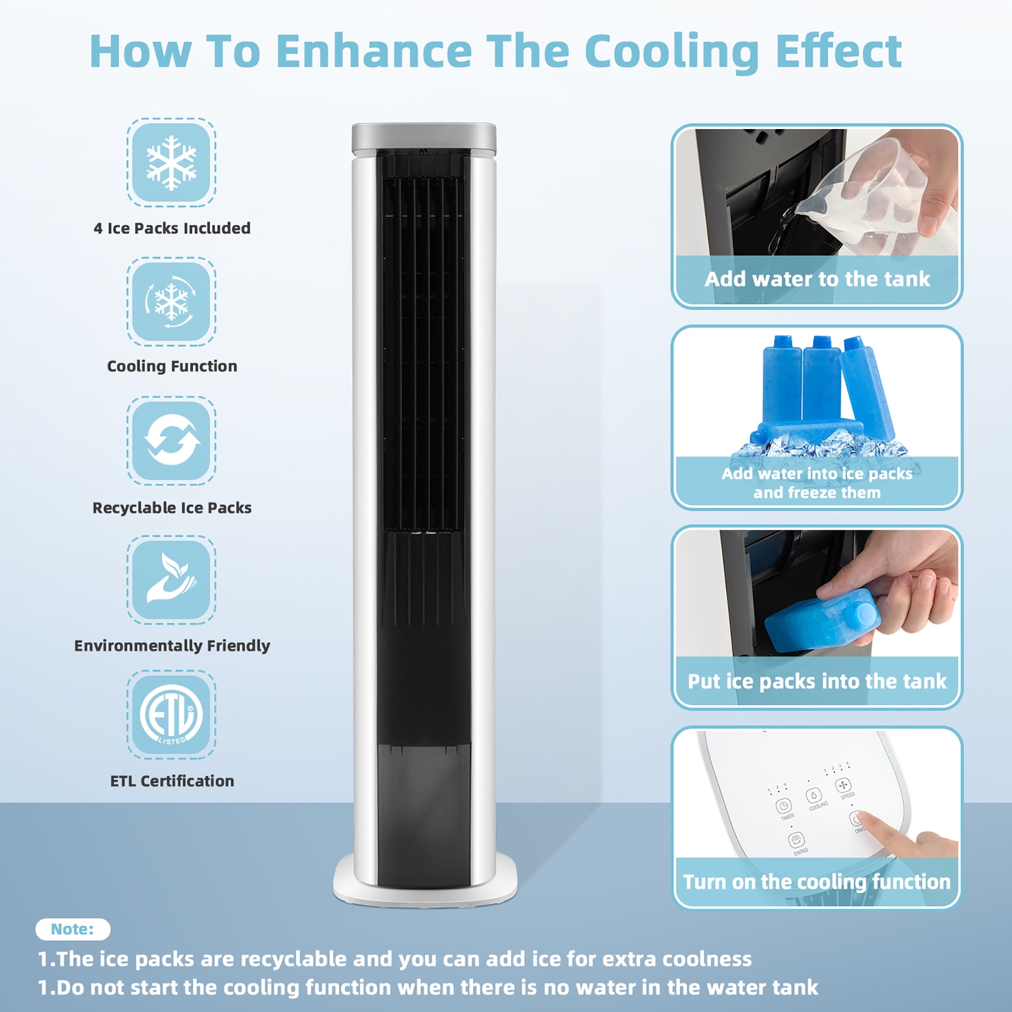 Keep cooling all day in the hot summer with our 3-in-1 evaporative air cooler! Designed with 4 fan speeds and 60° oscillating function, this floor air cooler can provide customizable and widespread cool air coverage for you. It is multifunctional to be used as a fan, humidifier or air cooler to meet your different needs. On hot days, you can add water and ice boxes to the water tank, and then turn on the cooling mode to enjoy coolness and comfort in seconds. The large 1.3-gallon water tank ensures continuous cooling for hours without frequent water addition. Please note: add water not to exceed the ”MAX” mark nor lower than the ”MIN” mark. The 1-7h timer and low-noise operation ensure you have a sweet sleep through the night. Besides, you can control all settings conveniently through the included remote control and top touch control panel. Thanks to the compact design and built-in carry handle, you can move and transport this evaporative air cooler anywhere effortlessly. Assembly and Display Video: Feature 4 fan speeds and 3-in-1 multipurpose design meet various needs Smart touch panel and handy remote control offer convenient use 60° oscillation offers a wide coverage of cool air circulation 1.3 gallon water tank with enough water can last several hours for one time Visible water level makes it easy to check the amount of water in the tank Bladeless design protects your child or pets from potential danger 1-7h timer regulates power consumption and reduces energy costs Ultra quiet operation ensures you a peaceful and cozy sleep Removable dust filter and cooling pad ensure easy maintenance Space-saving design and built-in handle for easy storage and carry Round base with drain plug ensures stability and convenient drainage 4 ice crystal boxes are included for better cooling effect Perfect for the living room, bedroom, dining room, office, etc Specification Material: ABS Cover Product Dimensions: 10” x 7.5” x 40” (L x W x H) Size of Base: 11” x 10” (L x W) Rated Power: 90W Voltage: 120V/60Hz Timer: 1-7 Hours Water Tank Capacity: 5L /1.3 Gallon Oscillation Angle Range: 60° Noise Level: 60.5dB Length of Power Cord: 193cm/ 6.3ft Net Weight: 12 lbs Package Includes: 1 x Air Cooler Fan 4 x Ice Box 1 x Remote Control 1 x Instruction