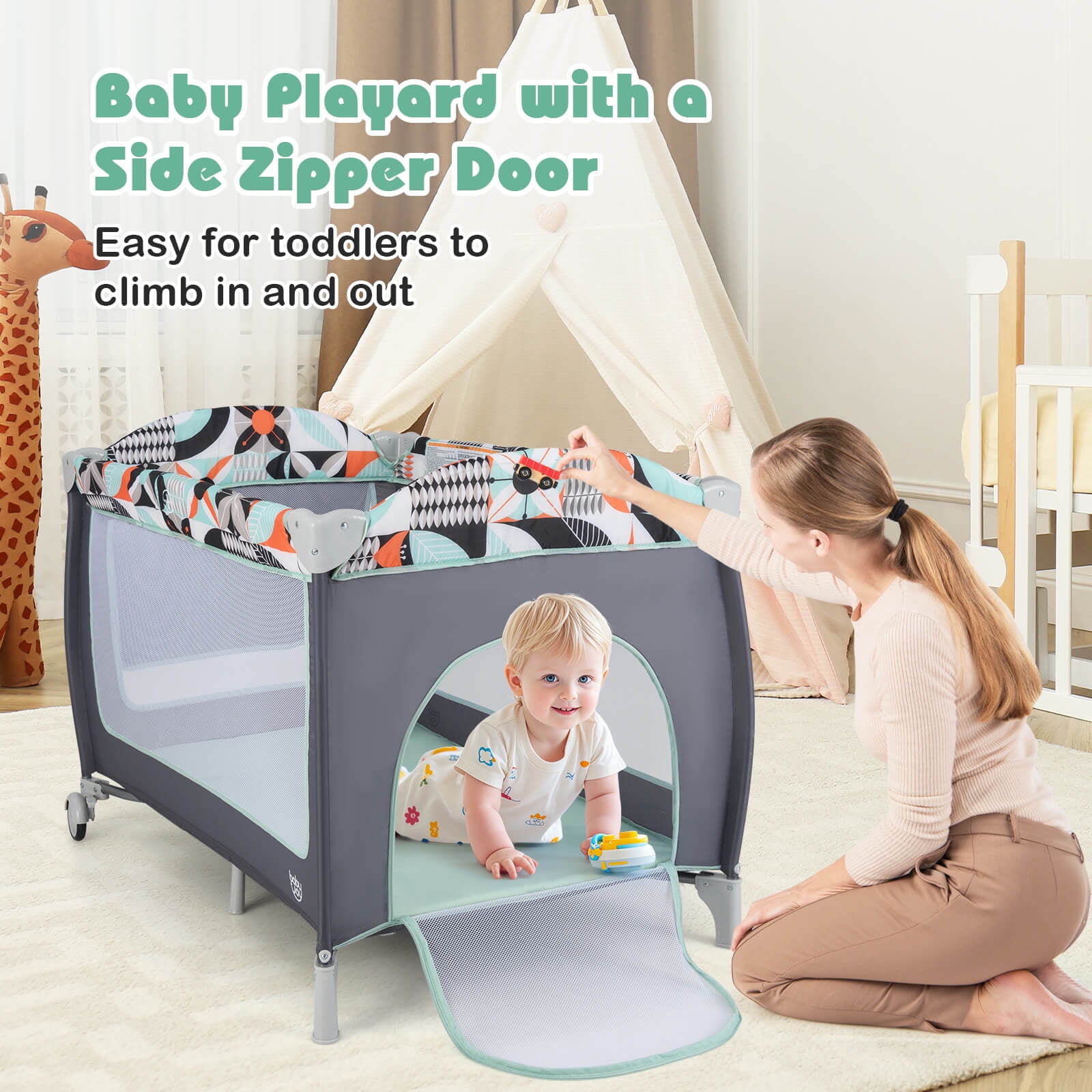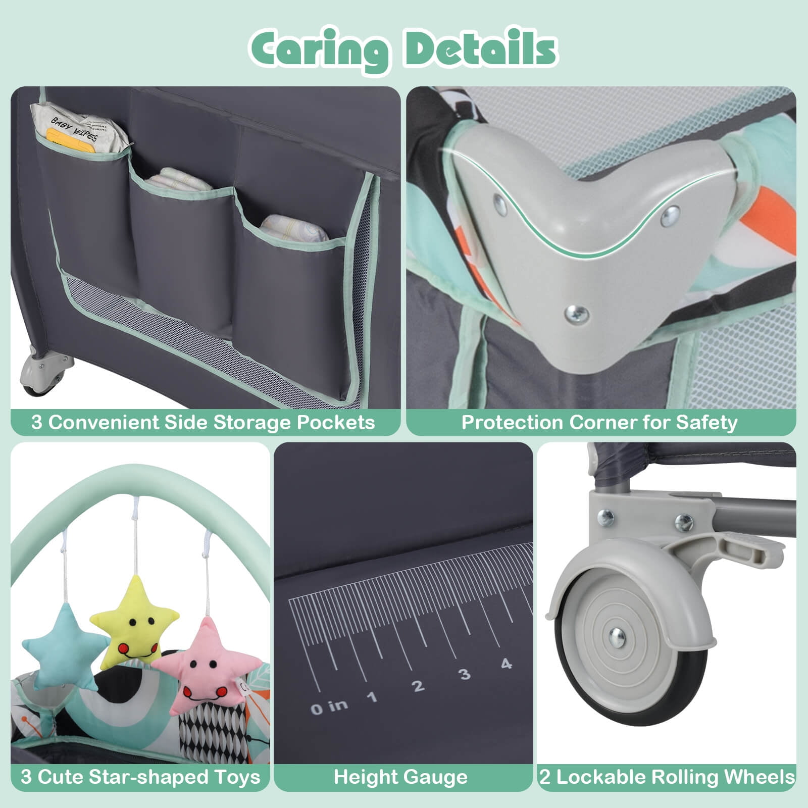 3-in-1 Multifunctional unisex Baby Playard: Combining a bassinet bed, diaper table and activity center, our baby playard can meet various needs for 0-36 months. The diaper table frees parents from bending over to change diapers, and the soft mattress provides a place for the baby to sleep. Besides, the roomy playpen gives a cozy space for the baby to stand and play freely. Cute Toys & Zippered Door Design: 3 attractive hanging star-shaped toys can not only promote the baby’s visual development but also improve the grasping ability. In addition, the side of the playpen is designed with a zippered door for easy opening, making it convenient for kids to climb in and out while adding more fun. sturdy Material & Safety Details: Made of wear resistant and soft oxford cloth, this baby playpen ensures great durability and provides your baby a comfortable touch. Moreover, the 4-sided breathable mesh fabric ensures healthy air circulation and provides better visibility for parents to observe the baby at any time. Stable Structure & Free Movement: Scientific 7-point metal tube supporting structure at the bottom can evenly distribute weight and improve overall stability. What’s more, 2 wheels make it convenient for parents to move the baby playpen from room to room and the lockable design ensures added stability and safety. Detachable & Folding Design: The diaper table, mattress and toy rack can be easily removed from the baby playard. After removing these parts, the playpen can be quickly folded up without extra tools for easy storage and transportation when not in use. And you can take it anywhere with the provided carrying bag.