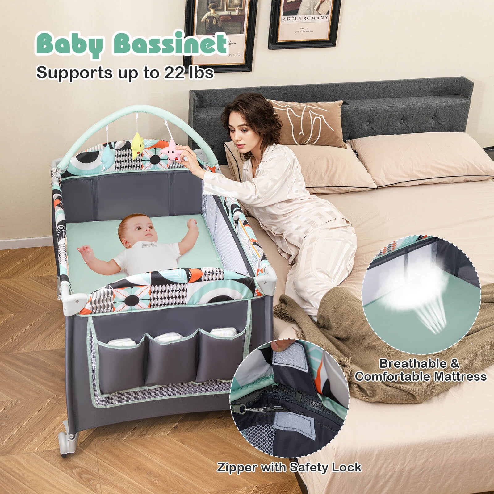 Our 3-in-1 unisex baby playard is an ideal choice for newborns to sleep safely and have fun! Made of solid iron pipe frame and sturdy oxford cloth, this baby playard ensures great stability and long-lasting use. Combining a bassinet bed, diaper table and activity center, our baby playard can be used in various ways and can accompany the growth of your baby. The diaper table can help parents change diapers easily without bending over. And the soft mattress offers a comfortable space for babies to rest or sleep. The breathable mesh netting is high enough to keep the baby in place and ensures great visibility for parents to observe the baby at any time. The zippered side door offers baby easy access to the playpen. 3 cute toys can bring a lot of amusement to the baby while making them fall asleep quickly. There are 2 casters with brakes equipped for easy moving and relocation, and all corners are covered to protect babies. The folding design makes the playpen easy to store and carry. Feature 0° inclined angle which is under 10 degrees makes it a qualified bassinet Multipurpose design includes baby playpen, changing table and bassinet No more bending over to change diaper or massage for babies Detachable and foldable design provides convenience in daily use Side door with a zipper offers baby easy access to the playpen Ventilated mesh walls with proper height ensure high safety 3 adorable star-shaped toys bring your baby great amusement The soft and thick mattress provides a comfortable sleeping space Large side storage bag to hold diapers, wipes and other baby stuff 7-point metal tube structure ensures great stability and load capacity 2 wheels with brakes increase safety and ensure easy movements A carrying bag is provided for easy storage and transportation Easy to assemble with detailed instructions Specification Color: Green Material: Mesh, Oxford Cloth, Iron, Sponge Product Dimension: 43” x 32” x 32” (L x W x H) Diaper Table Size: 28” x 19” (L x W) Weight Capacity of Basic Playpen: 33 lbs Weight Capacity of Diaper Table: 24 lbs Weight Capacity of Baby Bassinet: 22 lbs Net Weight: 23 lbs Applicable Age: 0-36 Months Package includes: 1 x Baby Playard 1 x Carrying Bag 1 x Instruction