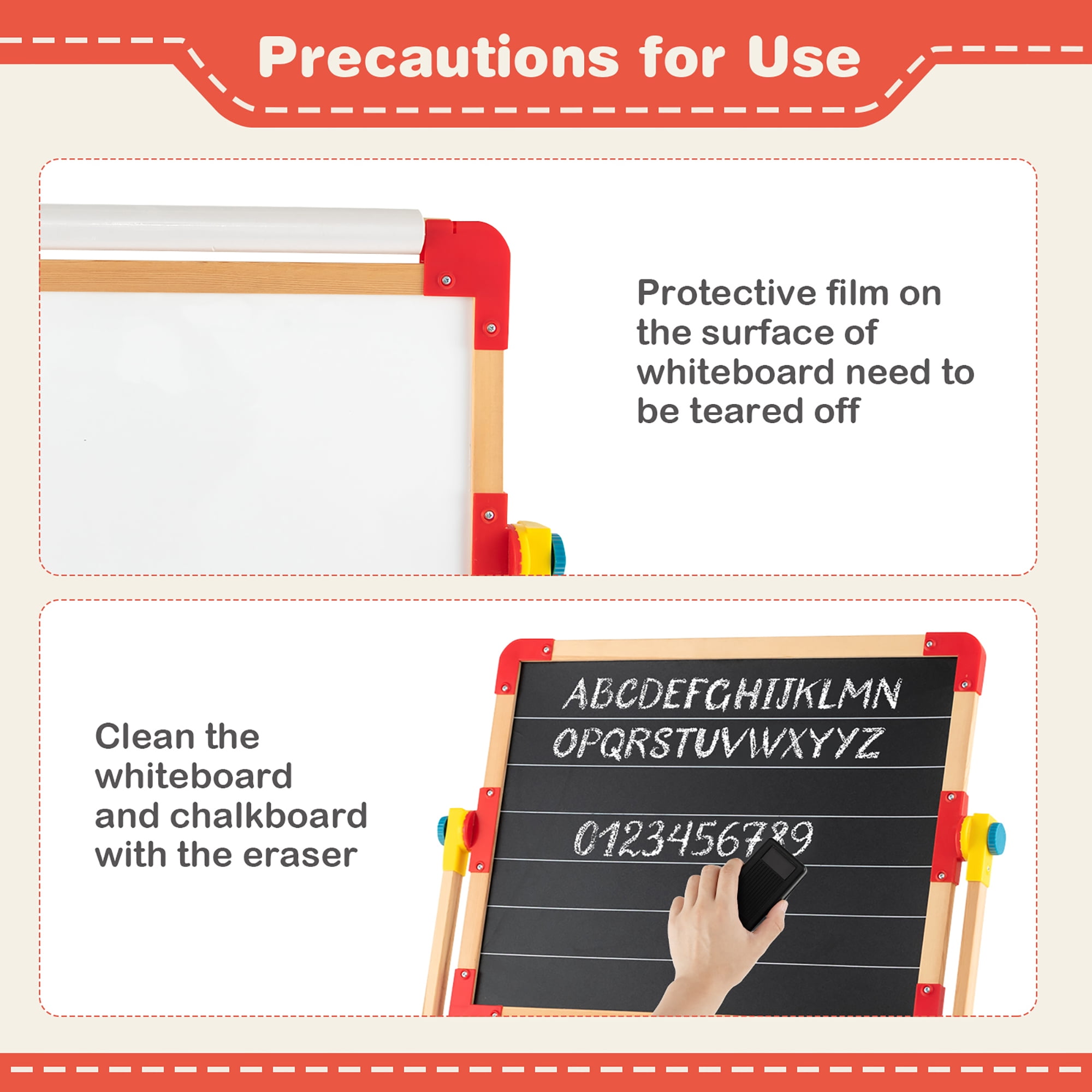 Double Sided Kids Art Easel: This multifunctional kids art easel is integrated with a chalkboard and a magnetic whiteboard, which is suitable for kids to draw and learn. This art easel for kids also comes with a replaceable paper roll for painting and drawing. This 3-in-1 kids art easel will accompany the growth of your kids. Adjustable Drawing Board: By rotating the knob, the double sided drawing board is 360° rotatable and be locked at any angle to satisfy different needs. Also, kids of different age stages will find the most comfortable position of this standing drawing board. What’s more, the storage space offers ample space for painting tools and other accessories. Reliable Safety & Durability: Made of selected pine wood, this wooden easel for kids features a sturdy and sturdy construction. The non-slip foot pads add more stability to the triangular structure. And the rounded edges and screws are crafted to prevent scratching and bumping. Inspire Active & Fun Learning: Designed with an abacus and alphabet, this kids standing easel also features educational function and encourages your kids to practice alphabet, counting and math skills. Moreover, the lock helps to create a real atmosphere of school, which keeps kids immersed into studying. Easy Assembly & Rich Accessories: The package comes with step-by-step instructions to provide you with hassle-free assembly. This kids art easel set includes many art and learning accessories: 26 x magnetic letters, 1 x paper roll, 2 x dust-free chalk, 1 x eraser, 1 x whiteboard marker. Precaution for use: protective film on the surface of whiteboard need to be teared off.