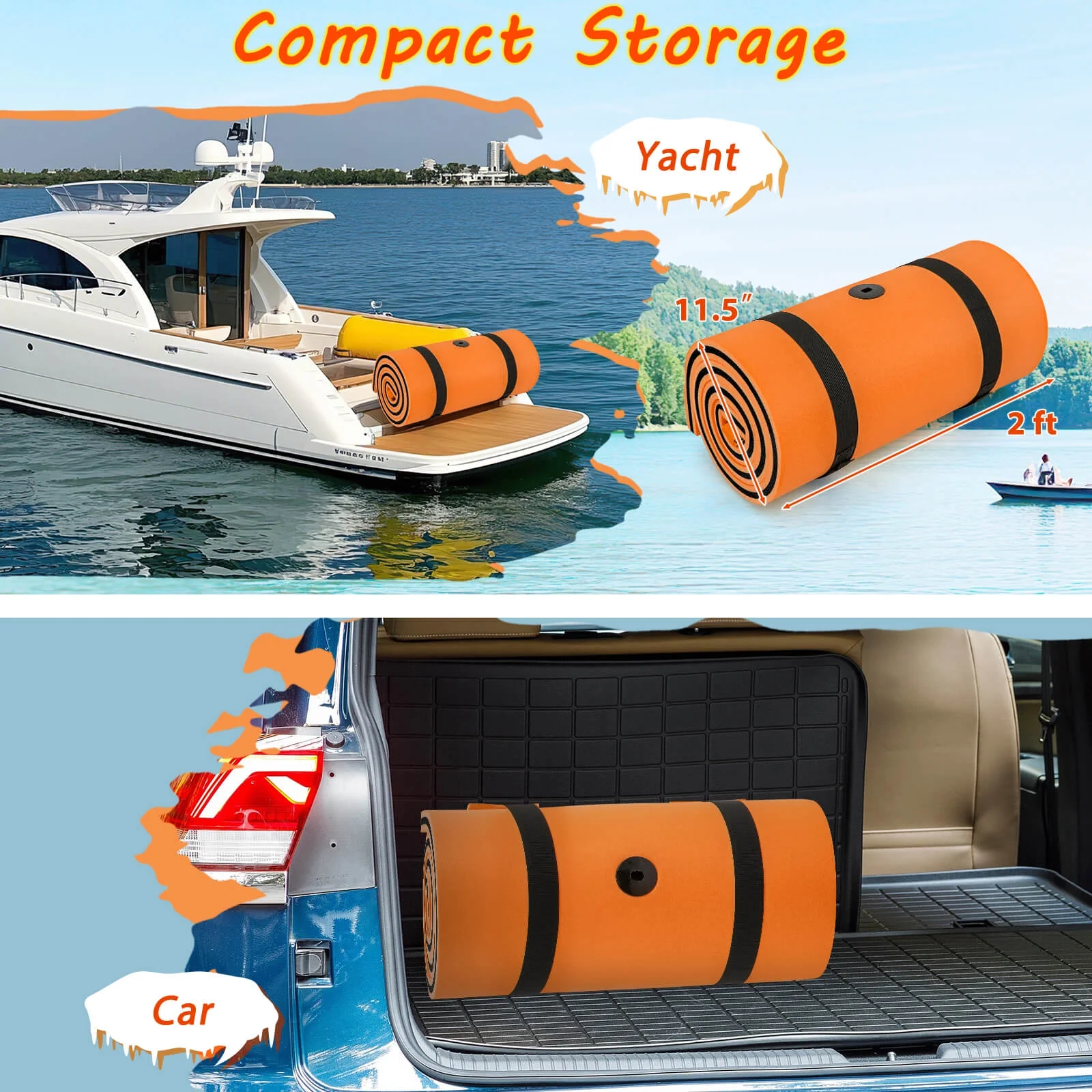 Do you want to enjoy the fun on the water? Our floating water pad can bring you cool and laughter on a hot summer day. You can take it to water parks, swimming pools, lakes, beaches and the sea for water games, sunbathing and relaxation. Made of three layers of tear-resistant XPE foam, it has strong bearing capacity and good durability, no water absorption and no deformation. You can easily anchor this floating pad in your lake or to a dock using the included 5′ bungee tether to prevent yourself and the pad from drifting away. The rolled up rolling sleeper design can provide excellent buoyancy and head support. And it is lightweight and easy to store and carry when rolled up, saving your space. Feature Support to 132 lbs of evenly distributed weight and is suitable for adults or kids Suitable for water parks, swimming pools, lakes, beaches, the sea and more Made of tear-resistant XPE foam, not easy to decompose, odorless, bouncy, safe and sturdy The three-layer XPE foam is compounded, with strong buoyancy, no water absorption and no deformation Rolling pillow design can support your head area and relax your body Use the included 5′ bungee tether to prevent yourself and the pad from drifting away Smooth surface, comfortable and cool, easy to clean, can be used on both sides Roll up for easy carrying and storage, saving your space Bright colors with high visibility and safety Specification Material: XPE Foam Color: Orange+Black Overall Size: 83” x 26” x 1.5” (L x W x H) Net Weight: 3.5 lbs Weight Capacity: 132 lbs Package includes: 1 x Floating Water Pad 2 x Storage Strap 2 x Pillow Rope 1 x Bungee Tether