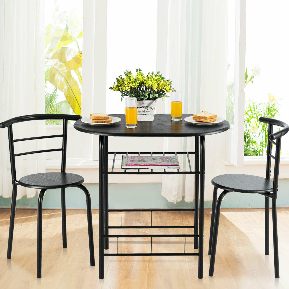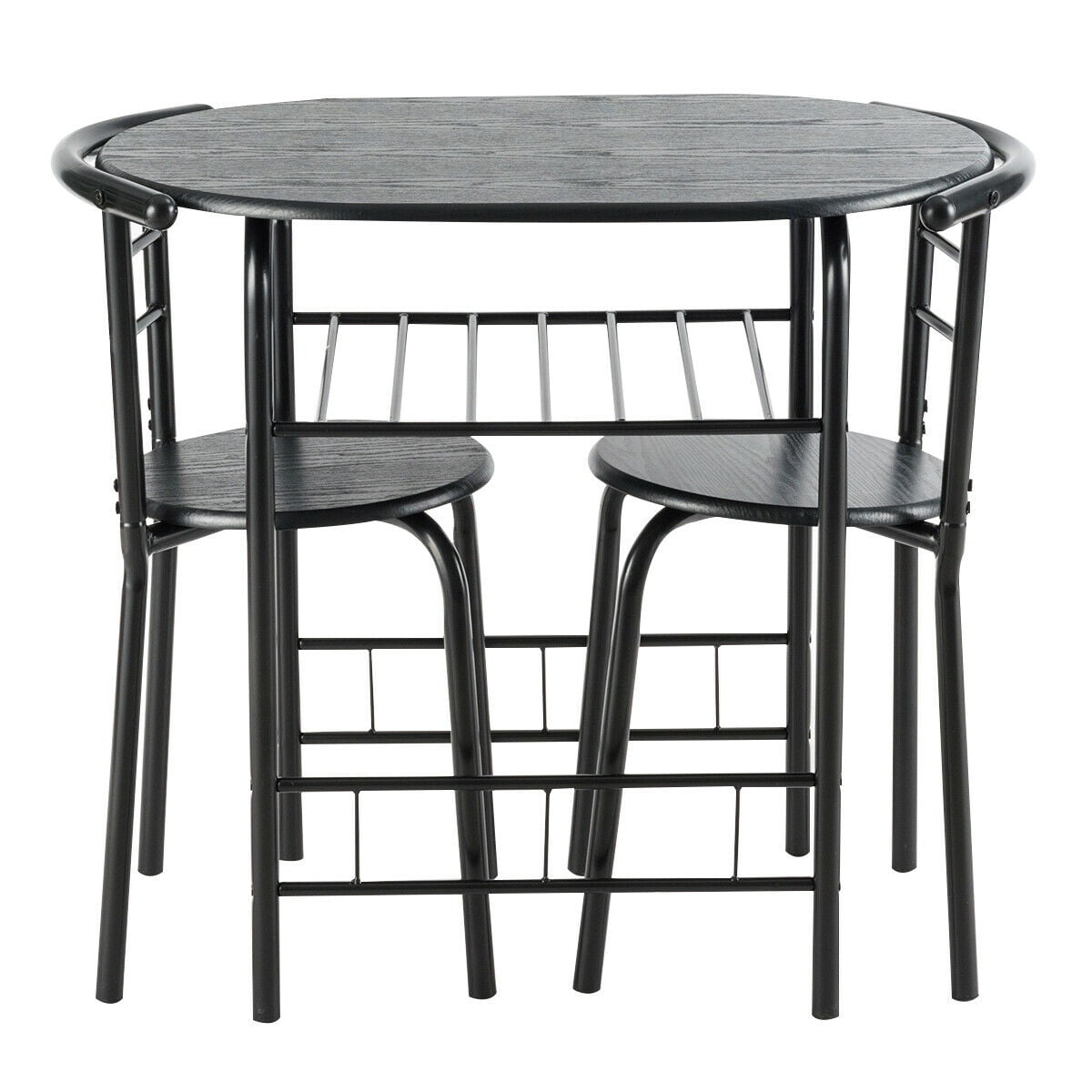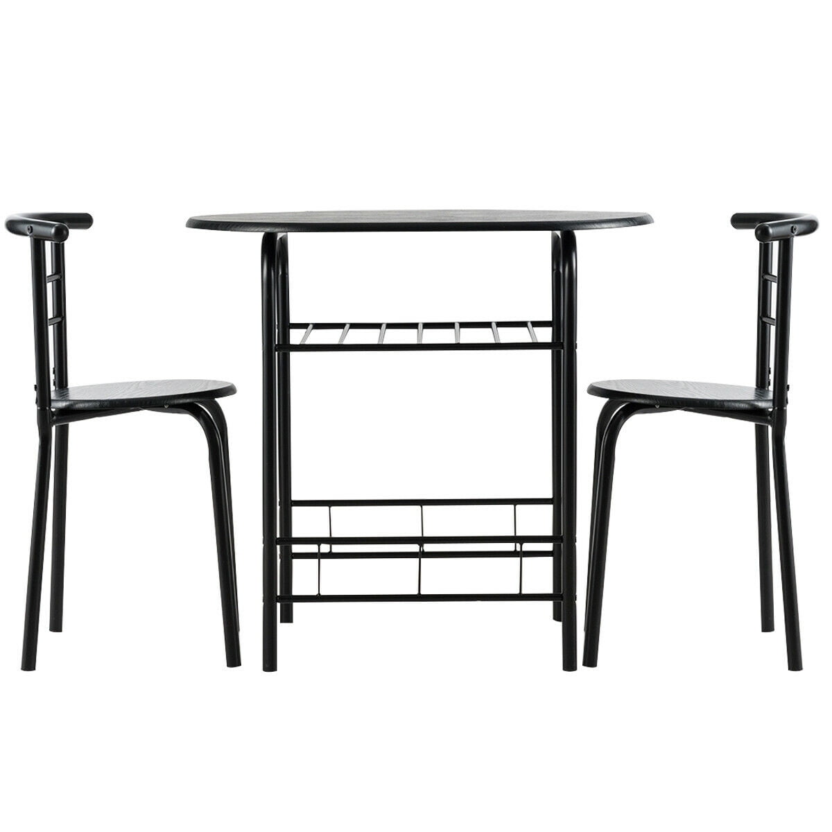 Our 3-piece table and chair set is a perfect addition to compact space. Consisting of MDF and painted iron pipes, this table and chair set can be used for many years. Under the tabletop is an extra storage rack that can be used to store drinks, magazines, cups, bowls according to your needs. The curved chair backrest is ergonomically designed to make you feel comfortable, and most importantly the curved shape fits perfectly with the edge of the table so the 2 chairs and the table can be integrated when not in use to save space. Let this table and chair set creates an elegant dining environment for you. Feature Made of MDF and iron pipes, it is sturdy and sturdy Includes a sturdy oval table and two chairs Compact design suitable for small space, such as bistro, kitchen, apartments, There is an extra rack under the desktop to provide storage space The oval table top and round chair top ensure the safety of the family Ergonomic armless chairs with curved back gives you a comfortable sitting experience Simple design can be blended into any decoration style Easy to install with clearly instruction Specification Color: as the picture shown Material: MDF + iron Overall size of table:31.5” x21”x29.5”(LxWxH) Overall size of chair: 19”x15”x29.5” (LxWxH) Seat diameter: 14” Height from seat to ground: 18” Back size: 19”W x 12.5”H Size of wine rack: 18.5”L x 17.5”W Weight capacity of table: 176Lbs Weight capacity of each chair: 220Lbs Package includes: 1x Table 2x Chair