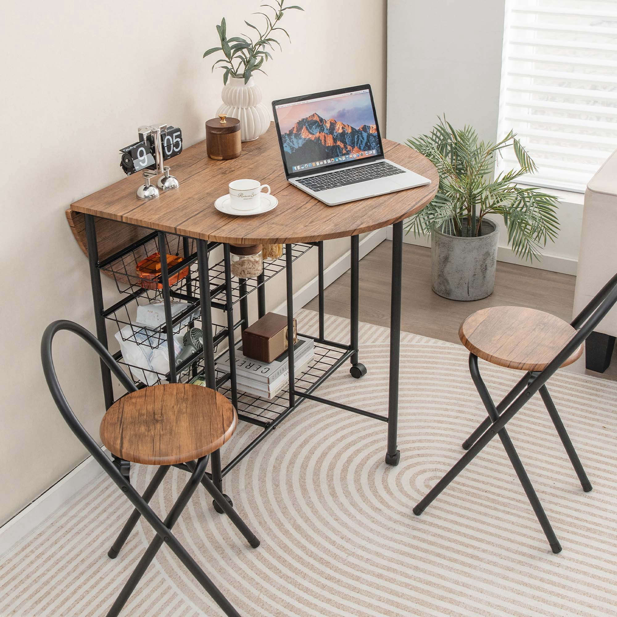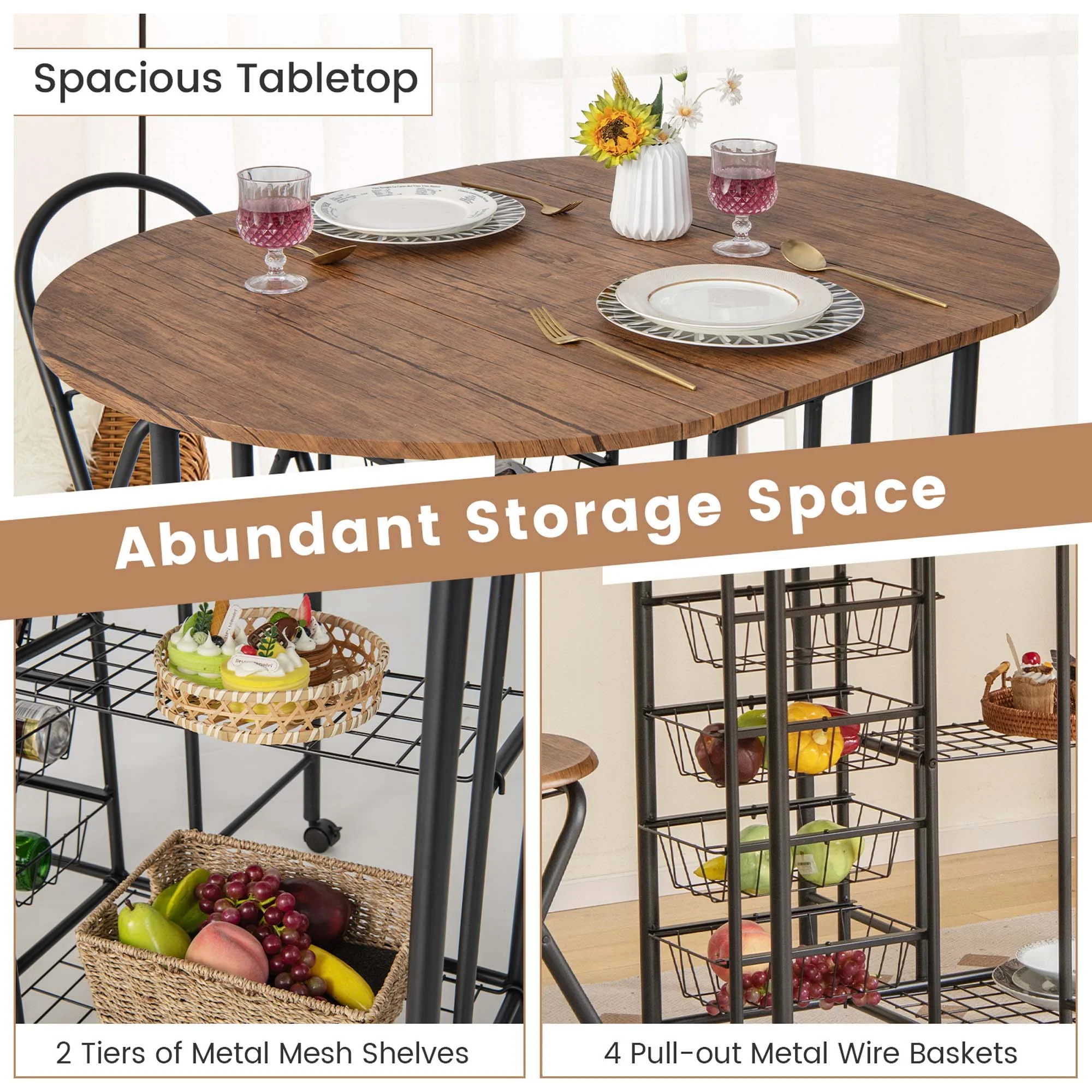 Multifunctional Folding Dining Set: The 3 pcs folding dining table & chair set is a good choice for limited rooms, like apartments. The drop leaf table has 3 folding modes and can serve as a dining table, a bar table, a writing desk or a console table. Abundant Storage Space: When fully expanded, the tabletop measures 44”L x 33”W to accommodate dishes of a romantic meal. Underneath the tabletop there are 2 tiers of metal mesh shelves and 4 pull-out metal wire baskets for kitchenware, plates and other stuff. Easy to Move & Lock: The collapsible table sits on 6 smooth & quiet casters for easy movement. Thus, you can also use it as a serving cart for a buffet or BBQ party. Four of the casters are equipped with brakes to stop the cart in place. Sturdy & Comfortable Stool: The space-saving folding chairs consist of round seat panel and sturdy X-shaped frame, allowing comfortable seating and large bearing capacity. And the metal legs are fitted with protective foot pads to protect your hardwood floor. Easy Assembly & Maintenance: The dining chairs come fully-assembled, so you just need to put the table together according to the detailed instruction. Besides, the high-quality material and waterproof surface make daily cleaning a breeze.