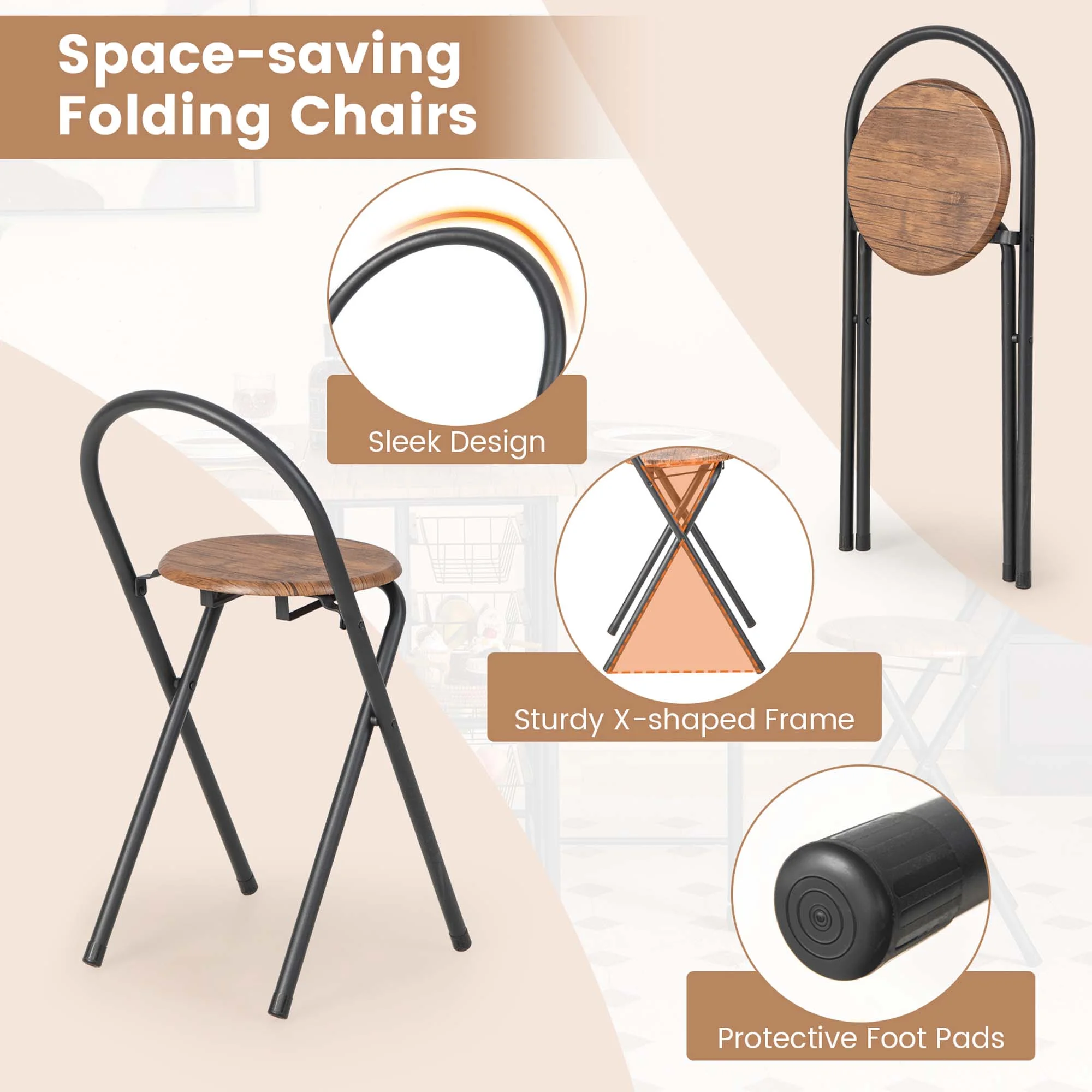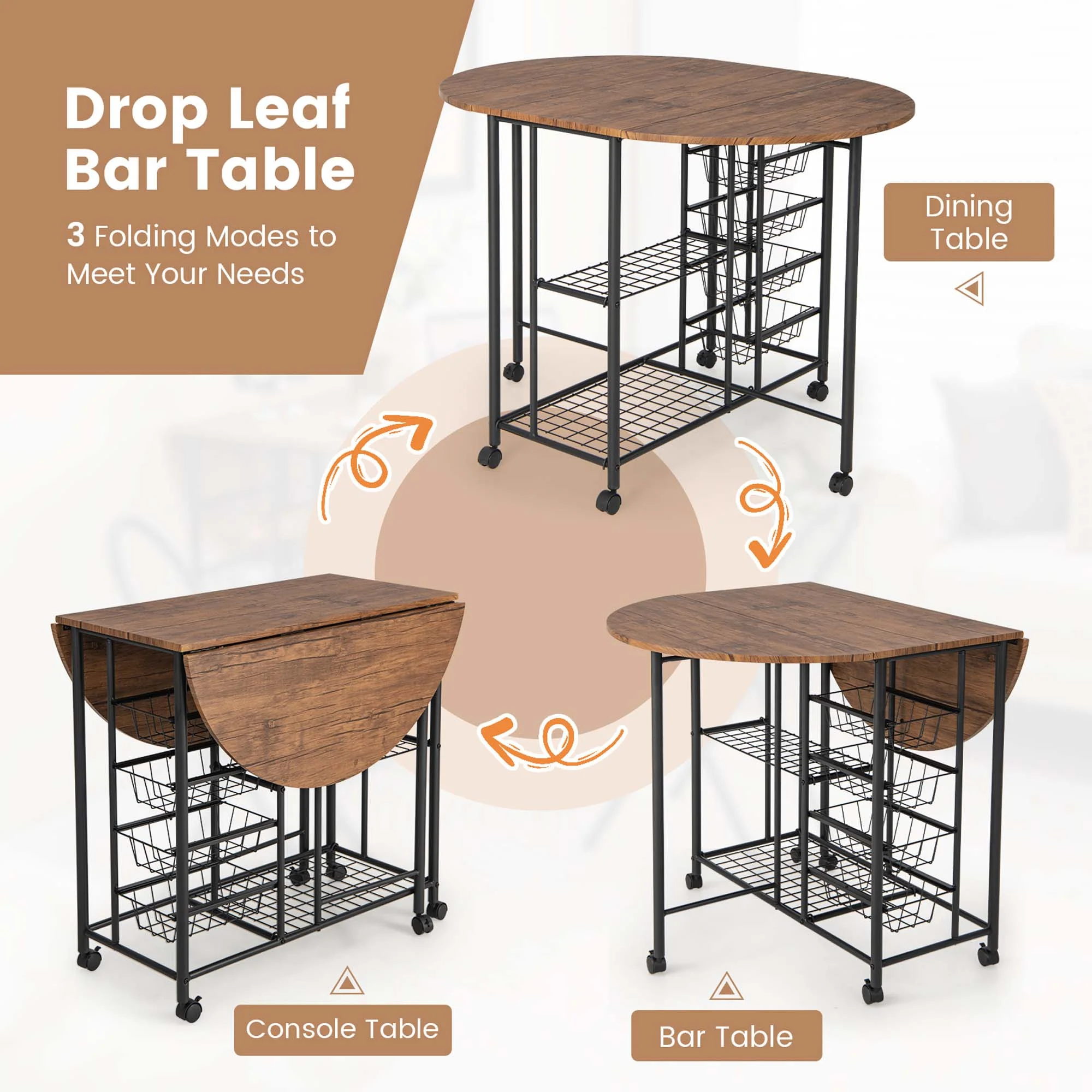 Our 3-piece multifunctional folding dining set is the ultimate space-saving solution for modern apartments and small spaces. With 3 folding modes, this versatile set is a dining table, bar table, writing desk, or console table all according to your needs. You’ll have all the space you need to entertain guests or enjoy a romantic dinner for two. The spacious tabletop comes with 2 metal mesh shelves and 4 pull-out metal wire baskets, perfect for storing kitchenware, plates, and small items. The chairs are comfortable and sturdy, with round seat panels and X-shaped frames fitted with protective foot pads. What’s more, with 6 smooth rolling casters, moving this set is a breeze. Take this dining set home and transform your small space into a stylish and functional haven! Feature 3-piece set perfect for dinner of 2 Drop leaf bar table can serve different purposes 3 folding modes to meet your needs 2 shelves and 4 pull-out baskets provide ample storage space 6 universal casters, 4 with brakes, for free movement Folding chairs with sleek design offer a comfortable experience Stable and robust metal frame ensures long lifespan Fitted with non-slip foot pads to avoid scratching floor Pre-installed folding chair is easy to set up Specification Color: Rustic Brown Material: P2 MDF, Metal Overall Dimensions of Table (Expanded): 44” x 33” x 31.5”(L x W x H) Overall Dimensions of Table (Folded): 18” x 33” x 31.5” (L x W x H) Shelf Height: 13” Clearance Between Baskets: 5” Overall Dimensions of Stool: 16.5” x 14” x 29” (L x W x H) Dimensions of Stool (Folded):14” x 3” x 32.5” (L x W x H) Seat Diameter: 12” Seat Height: 20” Weight Capacity of Tabletop (Expanded): 220 lbs Weight Capacity of Tabletop (Folded): 176 lbs Weight Capacity of Stool: 220 lbs Net Weight: 43.5 lbs Package Includes: 1 x Folding Table 2 x Folding Stools 1 x Instruction