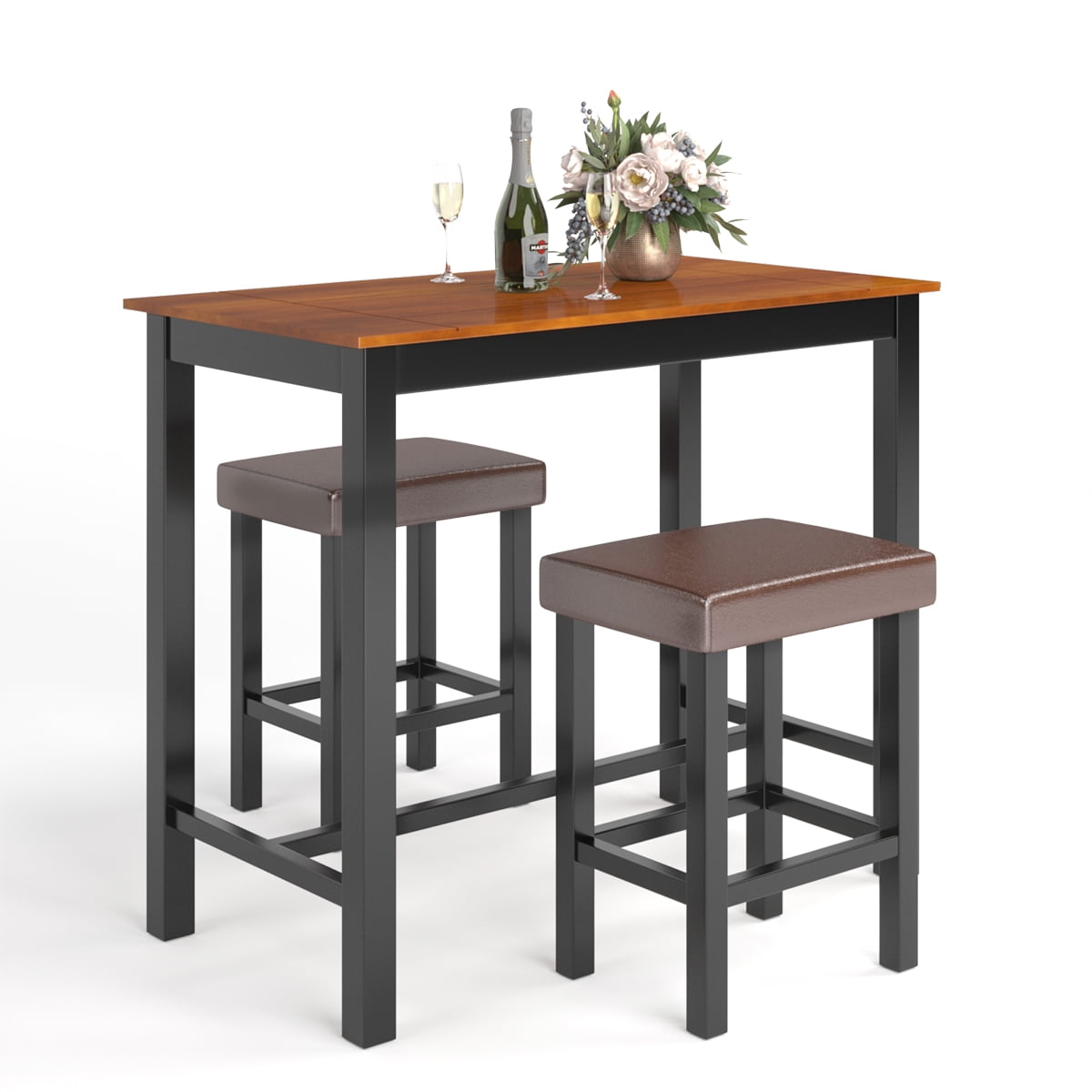 Premium Material & Sturdy Construction: Carefully crafted from MDF and eco-friendly rubber wood, the pub dining table set is promised to be super sturdy and sturdy with a longer service life. Heavy-duty frame with multiply reinforced connecting bars always keep the table set stable and bring a high load capacity. Compact & Space-saving Design: The pub dining table set features a compact design to be perfect for small room and apartment. You can store the pub table and bar stool together in any home space, and its compact size allows you to maximize the space and keep room organized for more convenient use. Upgrade Comfortable Cushion: The bar stool consists of an upgrade PU leather upholstered cushion filled with sufficient soft sponge for boundless comfort and easy maintenance. What’s more, there are several horizontal posts in the middle that can be used as a foot pedal as well to relax your legs. Stylish & Multi-functional Use: A smooth tabletop with black legs adds a modern and stylish feeling to any living space as an attractive decoration. It is perfect for kitchen, living room to be used as a bar table set, breakfast table set, desk table, providing spacious space to enjoy dining time with friends and family. Easy Assembly Required: Provides with all necessary tools and assembly part with detailed instruction, the pub table set can be installed in a short time. Just attach the legs to the tabletop and seat with rust-proof screws, you can finish the whole process and enjoy using.