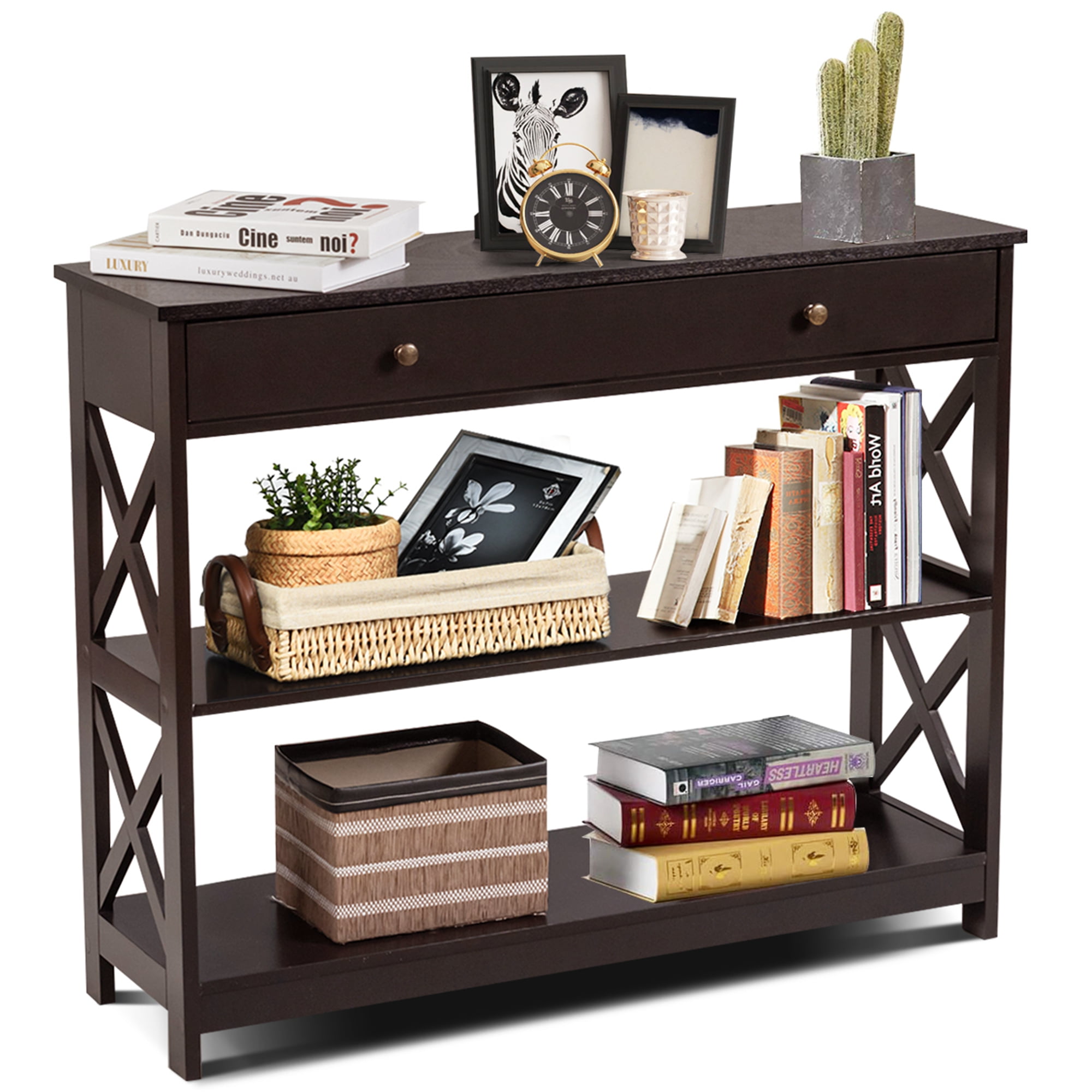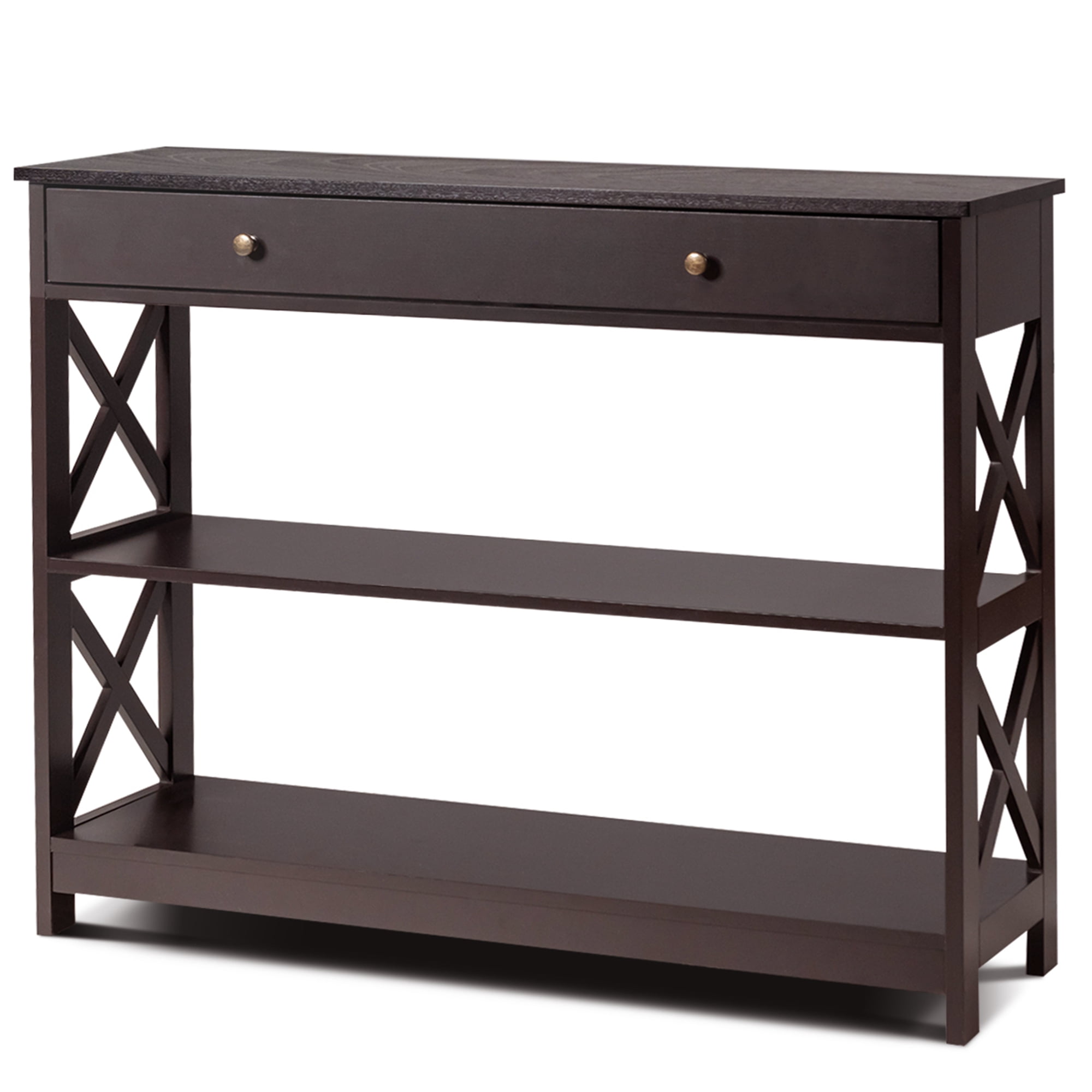 Costway 3-Tier Console Table X-Design Sofa Entryway Table with Drawer & Shelves Espresso