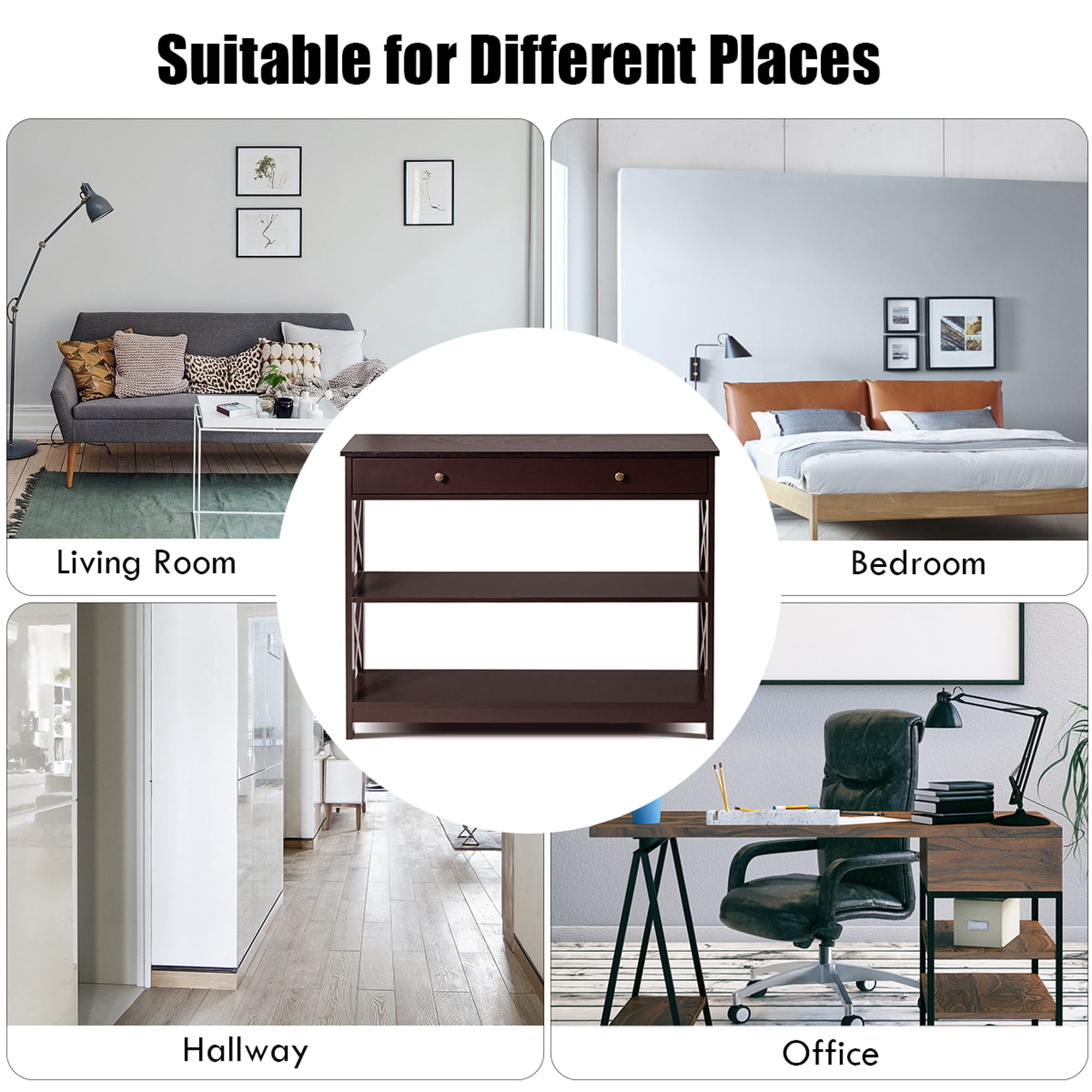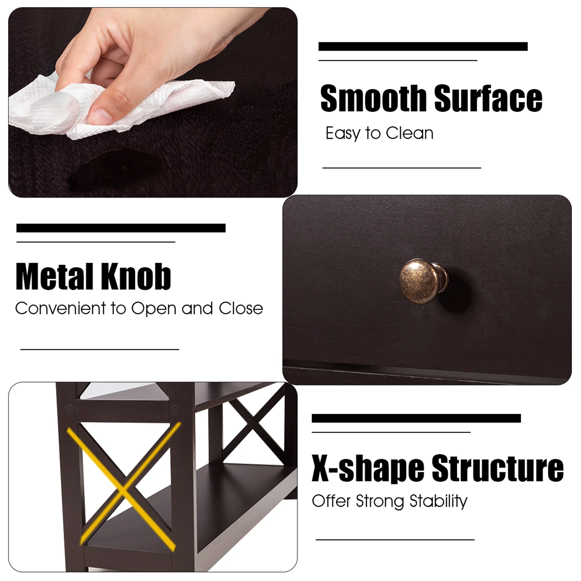 Are you still wasting time looking for keys when you go out? This 3-tier console table is the perfect solution for you! Designed with the spacious table, the large drawer and 2 storage shelves, this wooden sofa table comes with ample storage space for your belongings, such as key, sunglasses, photo frame and more. Made of solid MDF with odorless painting finish, this premium entryway table is durable and stable to hold up to 209 lbs. Measuring with 39” x 12” x 31” (L x W x H) in dimension, this 3-tier console table will make a timeless addition to your living room, hallway and entryway, keeping your home clean and tidy. Feature Spacious storage space for accommodating key, sunglasses, and shoes, etc Highly durable and odorless thanks to its MDF with painting Increases its stability to hold up to 209 lbs with X structure Serves as console table, sofa table and entryway table, etc Suitable for the living room, hallway, entryway and office, etc Makes an eye-catching addition to the whole home décor The toppling preventing device for best protection Convenient to assemble with the detailed manual Specification Color: Espresso Material: MDF with painting Overall dimension: 39” x 12” x 31” (L x W x H) Net weight: 41 lbs Weight capacity of tabletop: 110 lbs Weight capacity of drawer: 11 lbs Weight capacity of storage shelf: 44 lbs Package includes: 1 x Console table 1 x Instruction