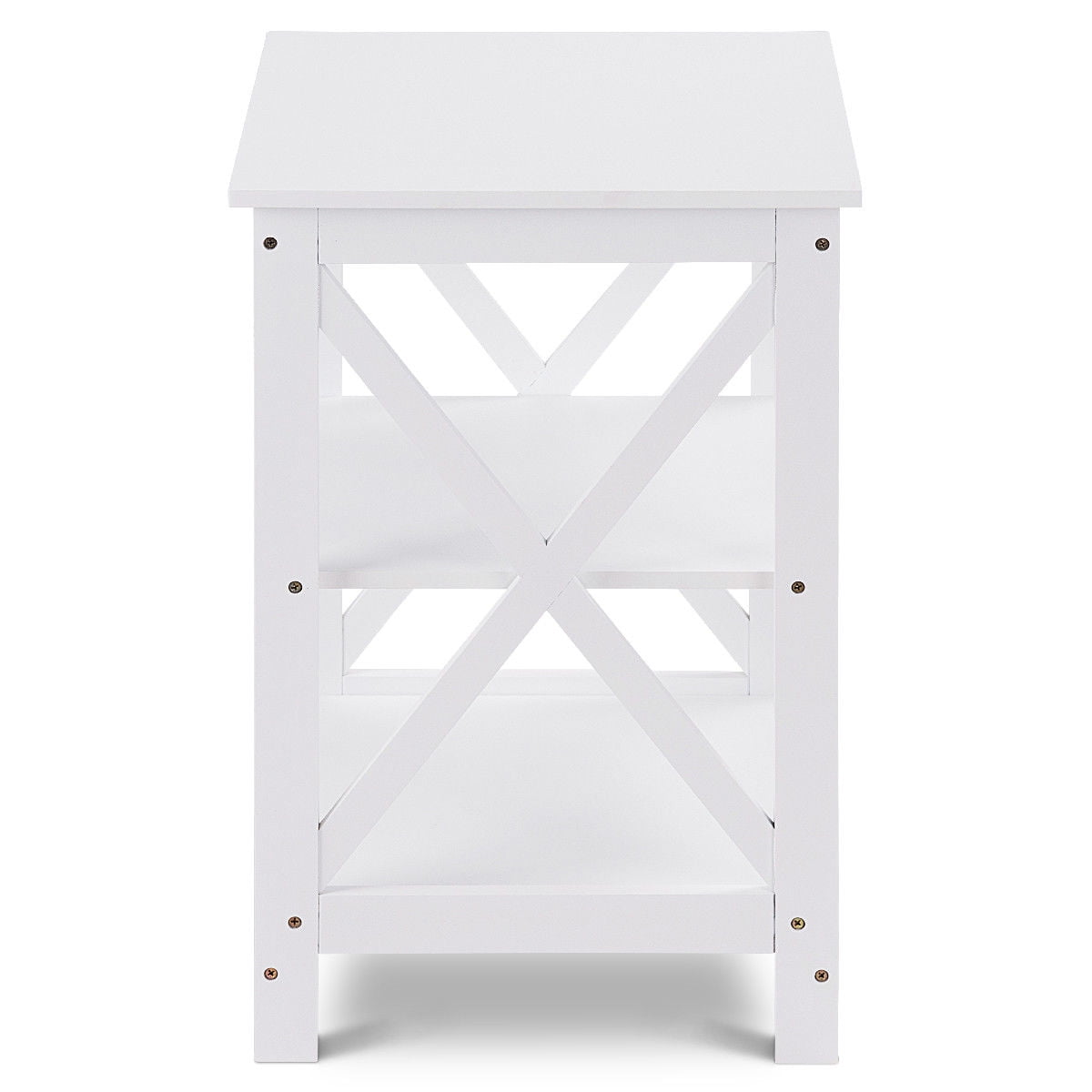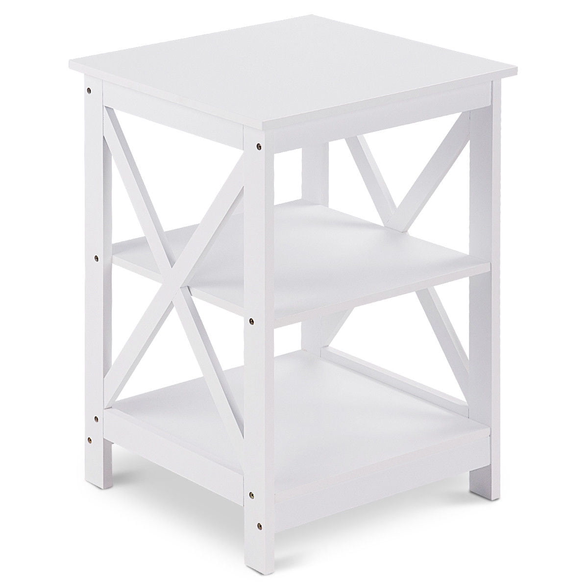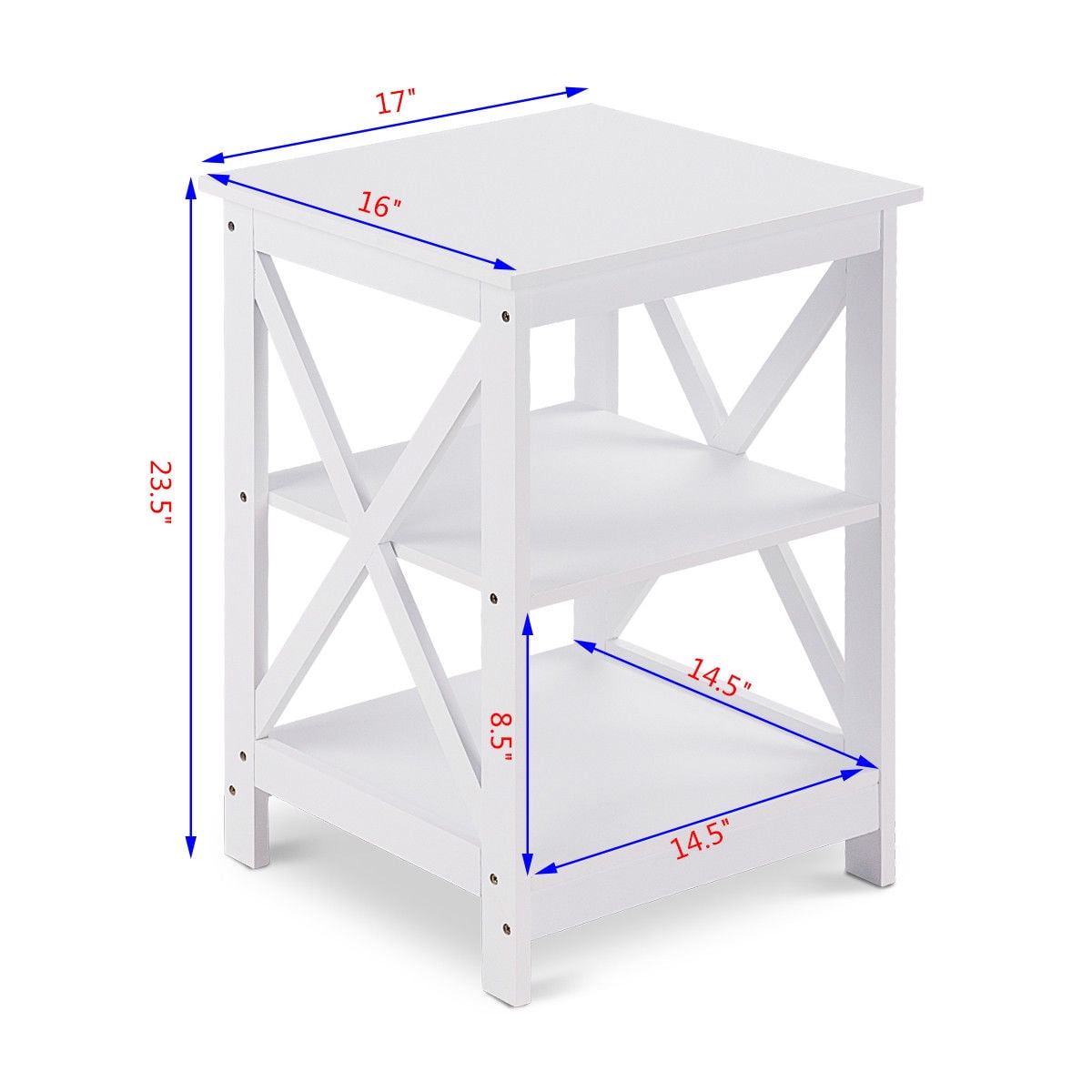 This neat nightstand features is three shelves to give you plenty of room for arranging your goods, it’s designed for creating more storage spaces for your books, pictures or decorative displays. Classic white surface can blend in your home design easily. It can be put in any room at home and add nattiness to your home. It is made of premium MDF ,which makes it Non-toxic and Environmental Friendly ,also sturdy and durable. Our product will serve you for years with your satisfaction. It will BE your excellent choice to buy, don’t hesitate and buy! Feature Neat& Modern design with elegant coffee finish . Can be used as a nightstand or end table or display shelf Classic double x stretcher design 3 open shelves 3 shelve storage makes it great for display and storage of books, memorable collects, decorative accessories, etc Fits in your space, fits on your budget. Suitable for any rooms need extra storage spaces Perfect for open storage or display space Assembly required with all necessary parts include Specification Material: MDF with NC paint finish Color: White Overall Dimension:17” x 16” x 24”(L x W xH) Weight: 16 lbs. Package include: 1 x nightstand