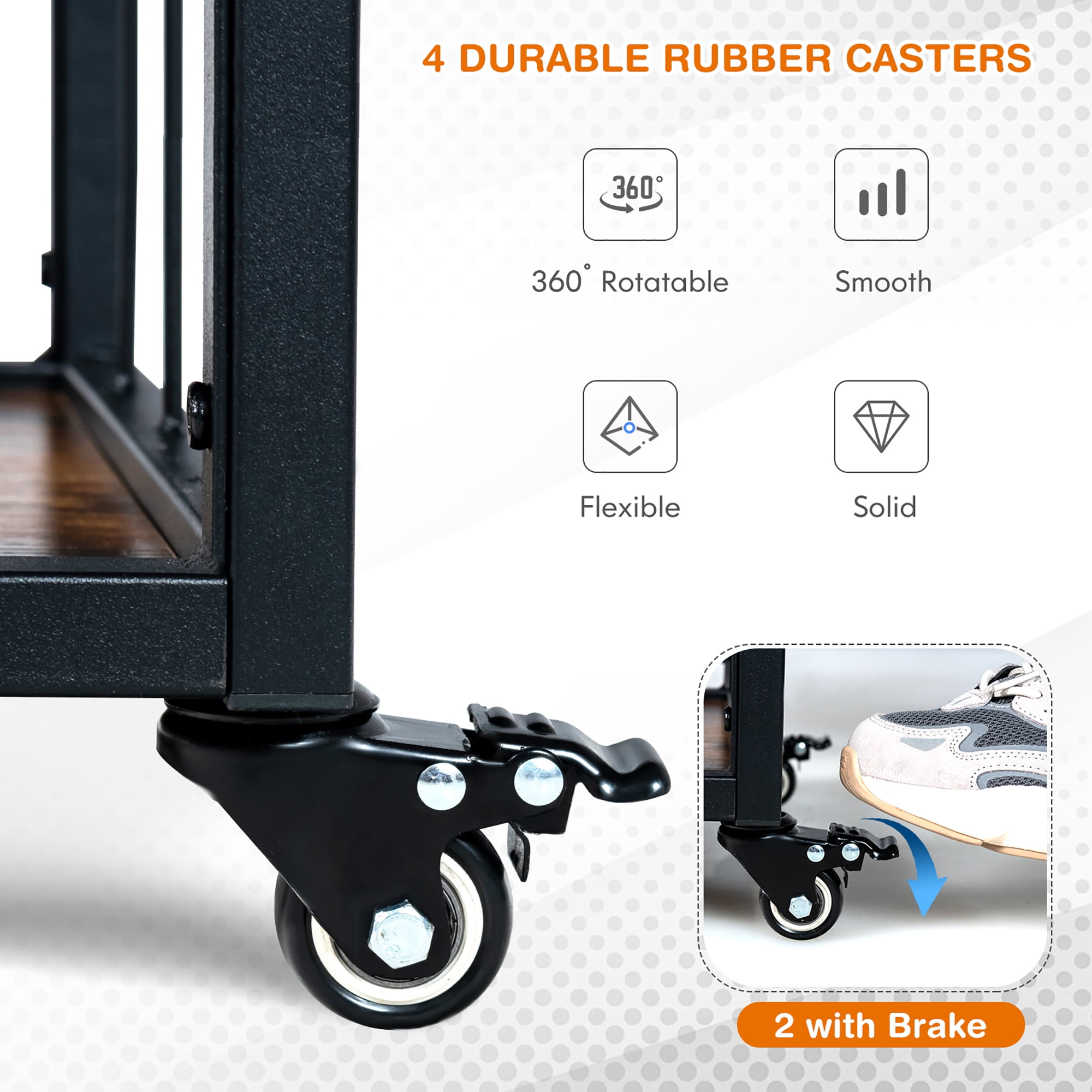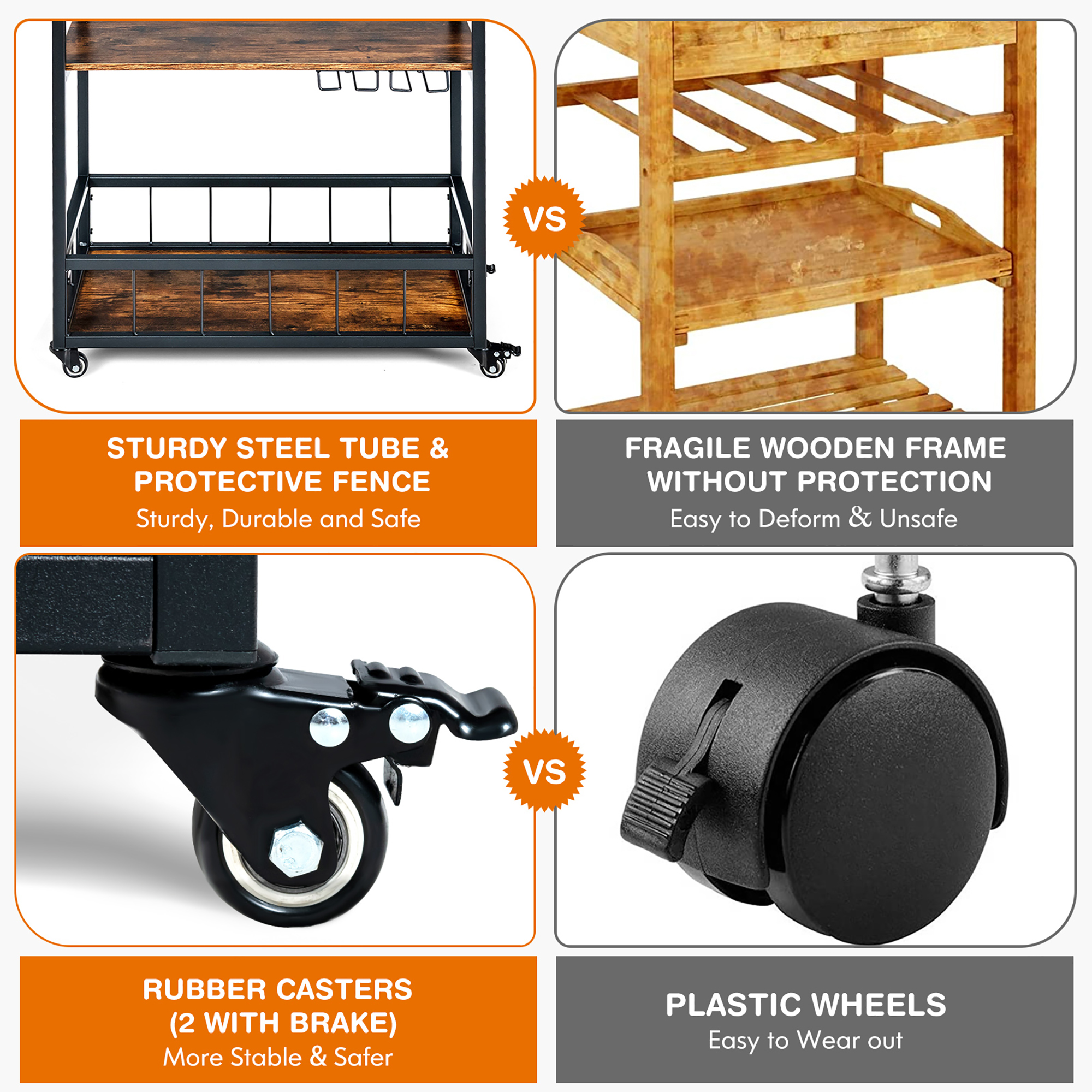 The key to enjoy an easier kitchen life is to have such a nice bar cart which combines practicality and beauty together. When you entertain your family or guests, the cart can help contain the raw material and spices, served as a good food prep platform. When finished, you can deliver the food and drinks to dining room effortlessly and safely. The bottom fence design can avoid items falling out. All the three tiers are available to provide ample space for display and storage. With the four universal casters, you can move it to any desired places conveniently. Assembly Video: Feature Ample space for food prep, display and storage Removable top tray with handles for great portability 4 hooks provide perfect storage space for towel Constructed with sturdy steel frame for higher solidness and durability 4 universal casters for flexible movement, 2 with brakes for better stability Wine rack and a goblet holder to organize bottles and glasses Raised tray edge and bottom fence prevent items inside from falling Easy to assemble with the clear instructions provided in the package Specification Color: Rustic Brown, Black Material: Engineered Wood, Steel, Rubber Overall Dimension: 33″ x 16″ x 35″ (L x W x H) Net Weight: 33 lbs Weight Capacity of Upper Tray: 132 lbs Weight Capacity of Lower Layer: 33 lbs Package includes: 1 x Kitchen Cart 1 x Manual