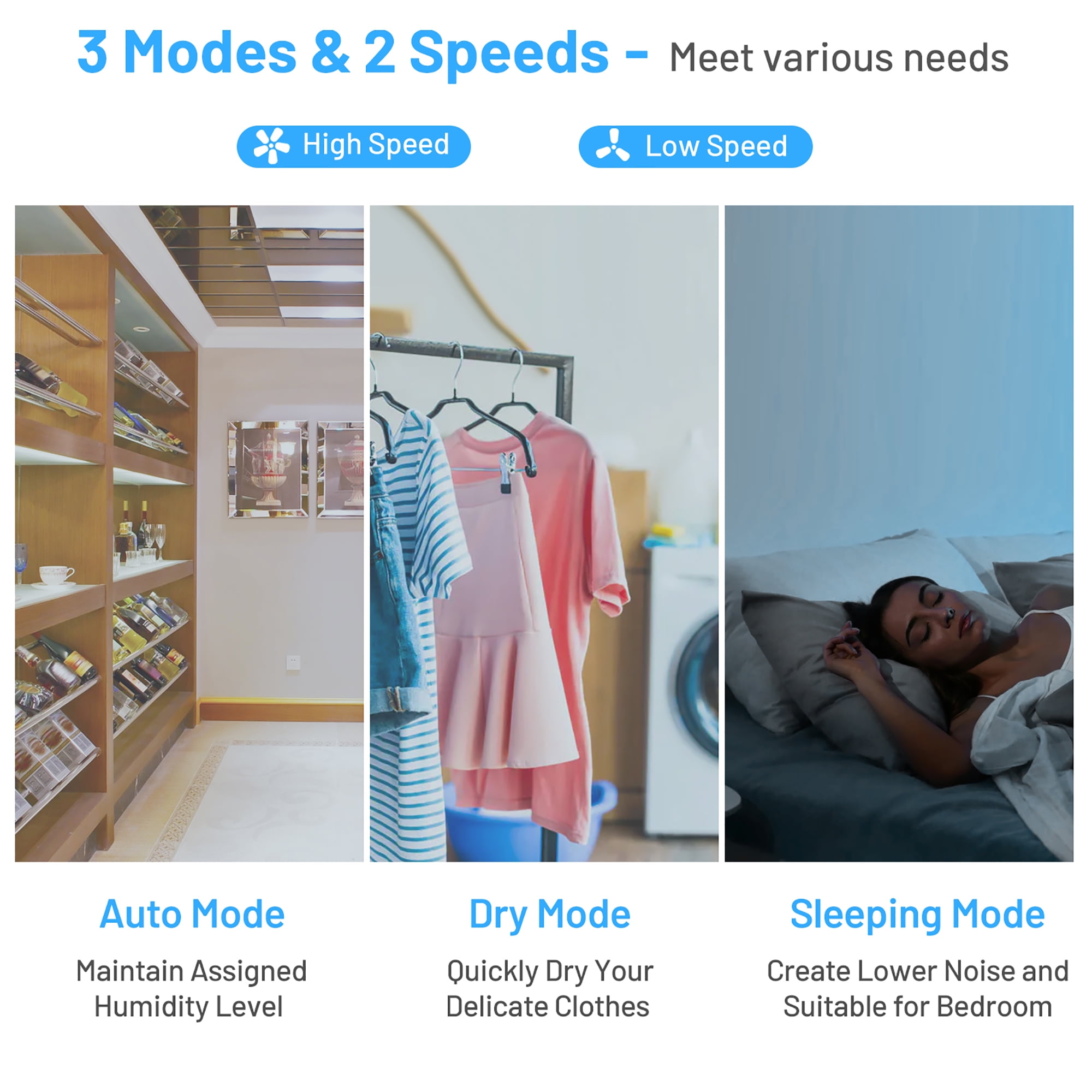 Superb & Efficient Performance: Our dehumidifier can remove 30 pints of moisture in the air per day and adjust humidity from 80% to 30%. So you can maintain a healthy 45%-55% humidity range easily! Besides, it fits for medium rooms in areas up to 1, 500 sq. ft, which is perfect for the bathroom, bedroom, laundry room, office, etc. Adjustable Airflow & Optional Modes: There are 3 modes (auto/dry/sleeping) and 3 speeds (high/low) for you to choose, which can meet all your needs. The drying mode, which features default fan speed and humidity level, is ideal for drying clothes quickly. And the wide air outlet on the top will improve the speed of dehumidifying. Intelligent Control & Safety Design: Set the ideal humidity level and it will sense the room humidity intelligently and start dehumidification automatically. Digital display enables current humidity to be read more intuitively and the touch panel makes the operation easier. More, the child-lock function allows you to lock the control panel for safe use. 2 Drainage Options & Easy to Move: There are 2 drainage options for you to choose. You can empty the dehumidifier manually by removing the 0.5 gallon water tank or set up continuous drainage by using the provided 3.3 ft. drain hose. In addition, coming with 4 universal wheels, this dehumidifier can be moved from room to room with ease. Timer Function & Low Noise: With a 24-hour timing function, the dehumidifier allows you to set the time to make it stop working automatically while you are sleeping or away from home, bringing a lot of convenience and reducing energy consumption. Besides, it runs at a low noise level, which will not disturb your sleeping or working.